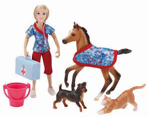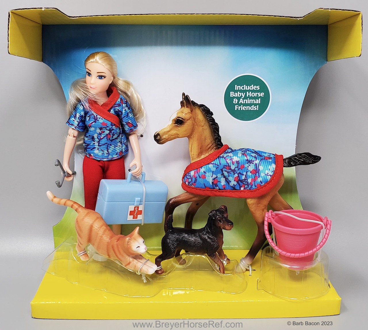 "Children can take the foal to its first checkup at the vet's, where it meets some new animal friends! Includes: 6" articulated doll, foal, foal blanket, cat, dog, bucket, vet bag, and stethoscope." www.breyerhorses.com.