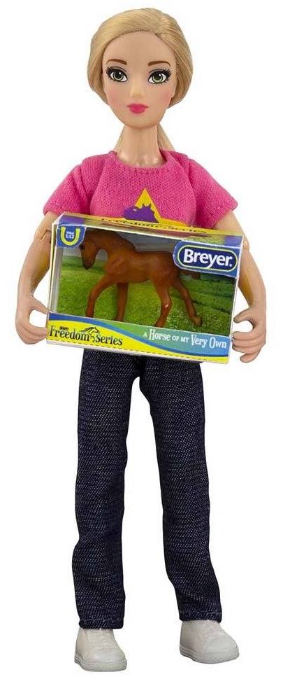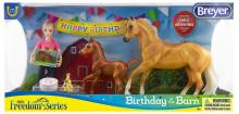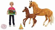"What can make a birthday party even better? Having it at the barn with your favorite horses! Madison is celebrating her special day at her favorite place. Outfitted in a party hat, she’s ready to enjoy her birthday cake and open a special present: her very own model horse! This set includes: 6” articulated doll, Freedom Series 1:12 scale mare and foal, Mini Whinnies horse, birthday cake, and party hat." www.breyerhorses.com. Included the Warmblood Foal, Harper, and a MW Romping Foal.