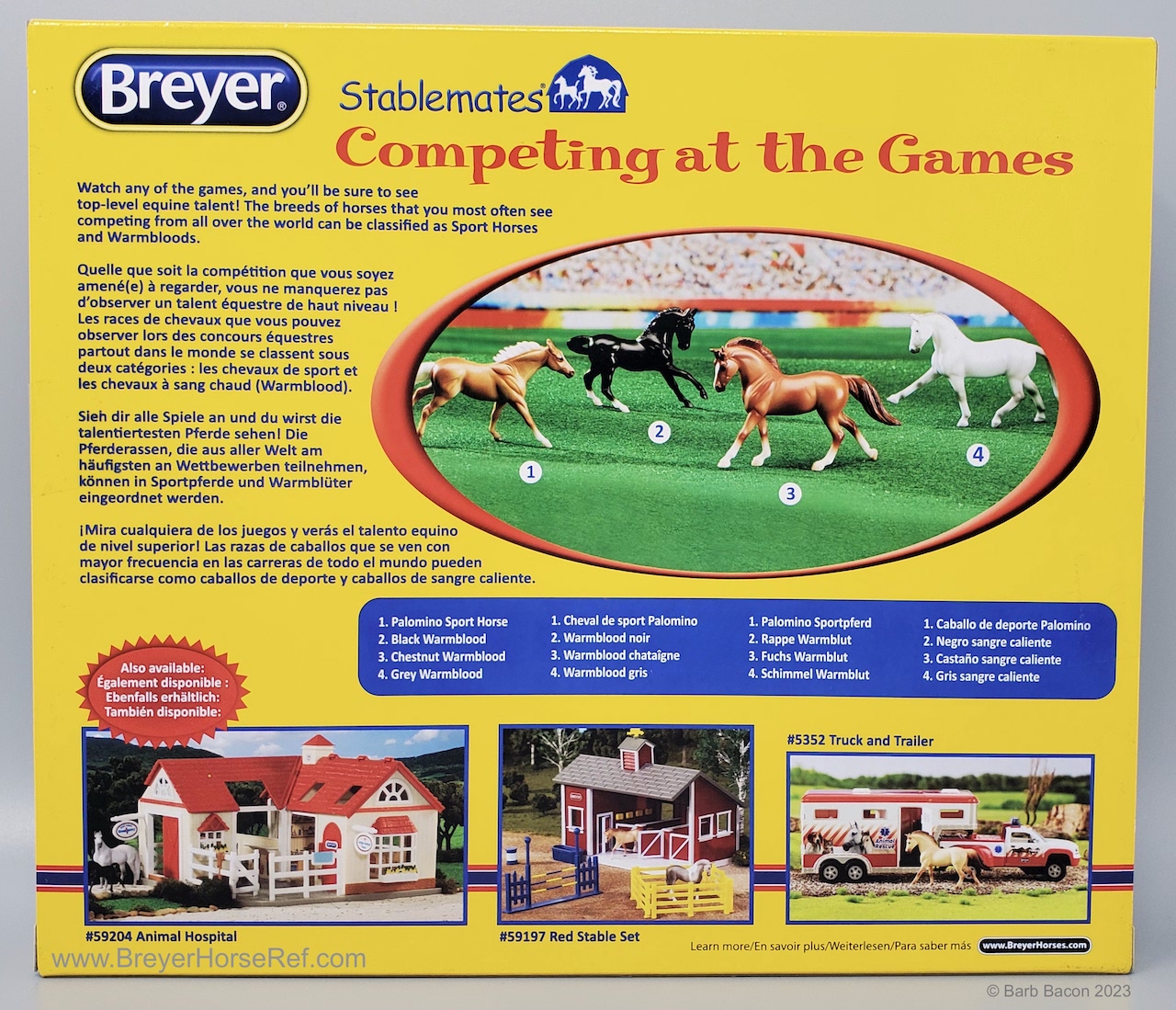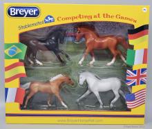 This set included a chestnut Cantering Warmblood, a light grey Hanoverian, a palomino Thoroughbred, and black Warmblood. On the 2017 Retired List.