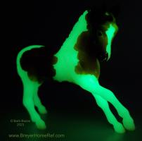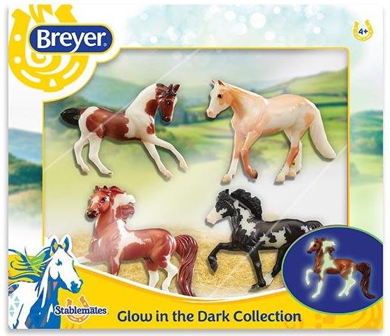 "This fun set includes 4 pinto horses. Surprise! Turn off the lights to see their white markings glow! Includes: Chestnut Pinto Morgan, Black Pinto Icelandic Horse, Bay Pinto Warmblood, Palomino Pinto Quarter Horse." www.breyerhorses.com.