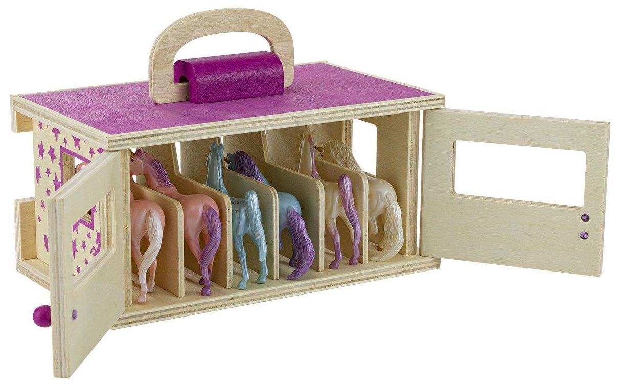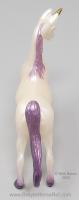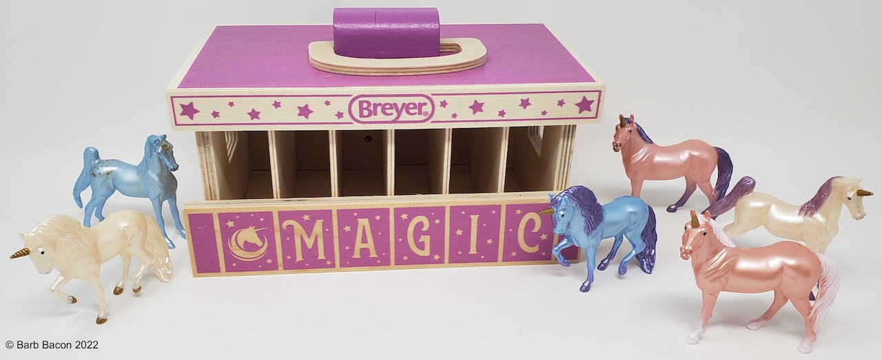 The Unicorn Magic Wooden Carry Stable comes complete with 6 Stablemates unicorns. Included 2 Saddlebreds, 2 Andalusians, and 2 Standing Stock Horses, and a Stable. This record is for the pearl white Saddlebred with Purple Mane and Tail (Ribbons were not painted). The Saddlebred models in this run tend to be less detailed, sometimes smaller, and have the Breyer Logo with Reeves Intl. Copyright stamp instead of the original linear Breyer Reeves stamp.