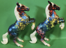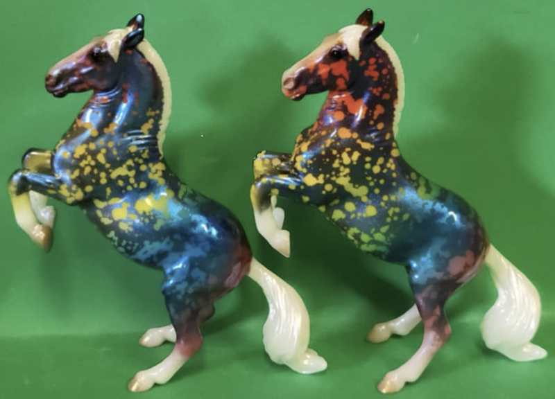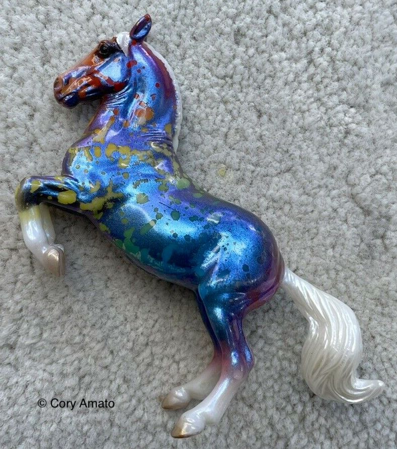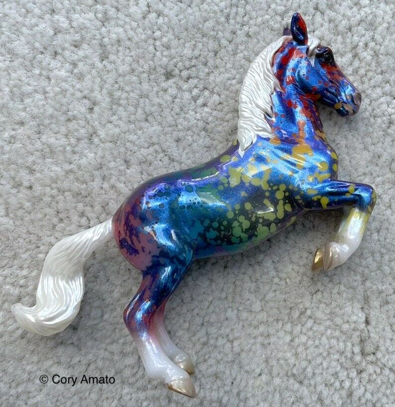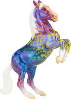 "This model is the last of our Limited Edition Models for this summer’s celebration of BreyerFest: Horse of a Different Color and has been done in an eye-catching rainbow resist splatter dapple on a pearly blue coat with four white socks and white mane and tail. This model has been done on the Lipizzaner Stablemates mold, #5734, originally sculpted by Kelly Sealey." www.breyerhorses.com.