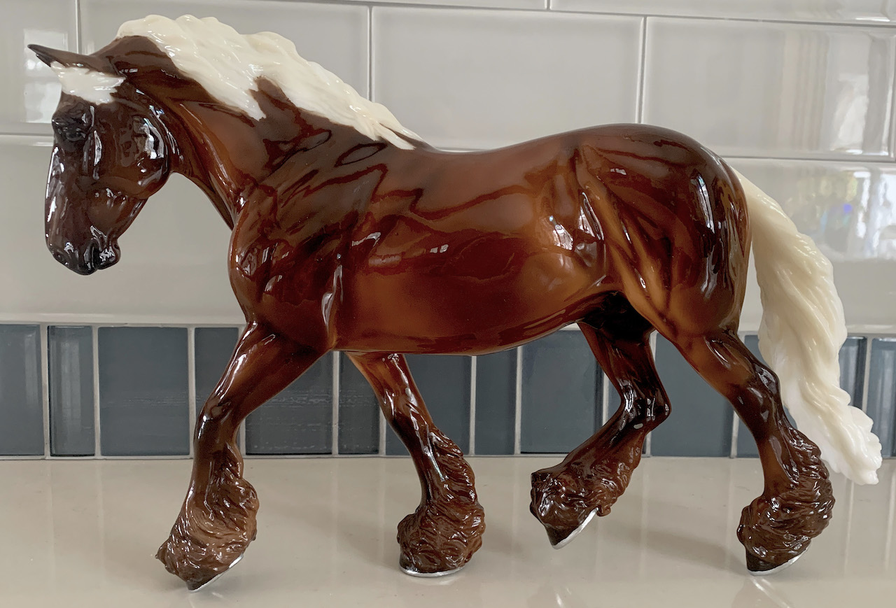 Glossy silver bay long mane and tail Shannondell. This model was originally sculpted by Karen Gerhardt, and also painted by her at Breyer HQ in New Jersey in October 2016. Comes with a COA.