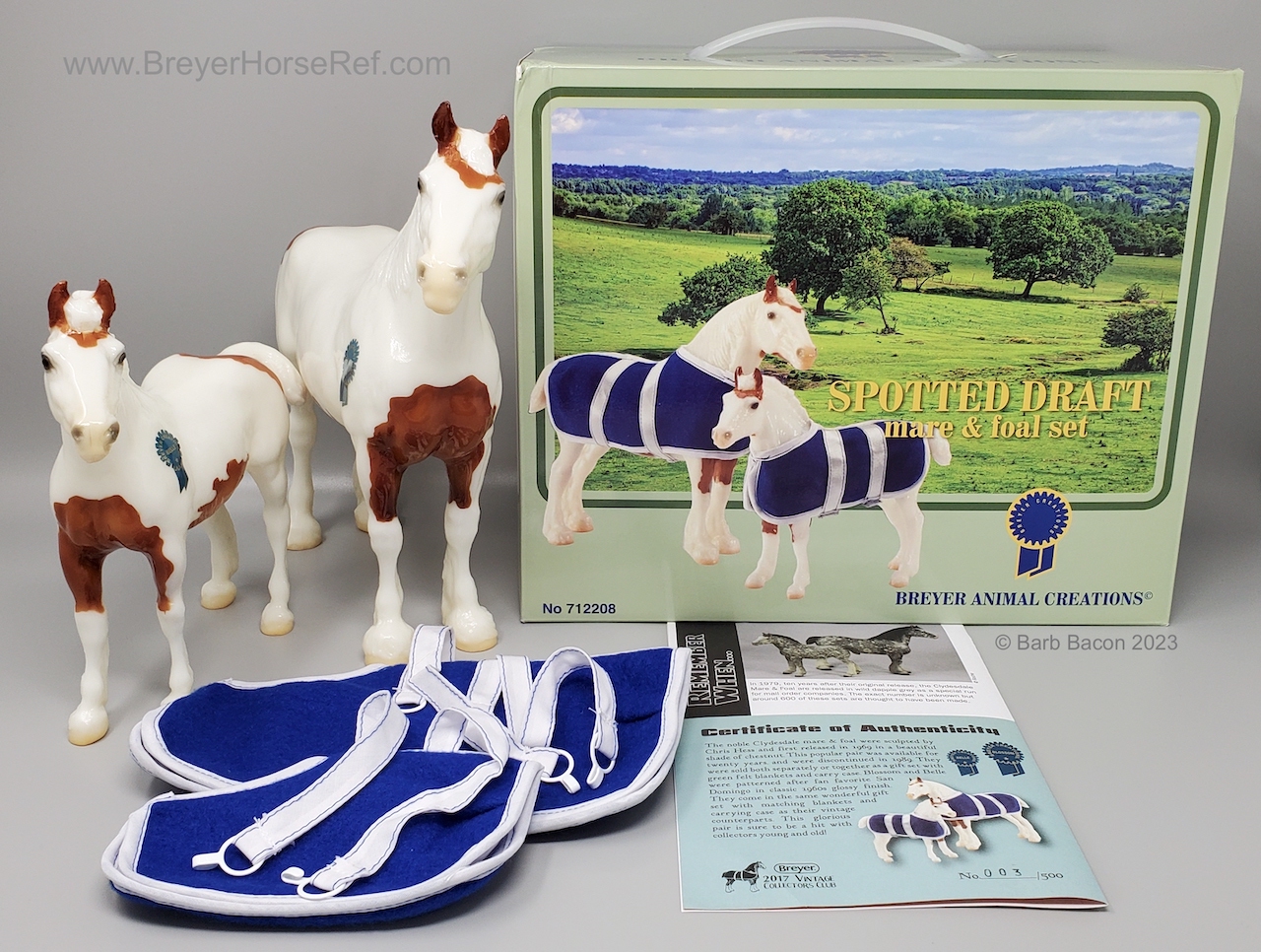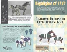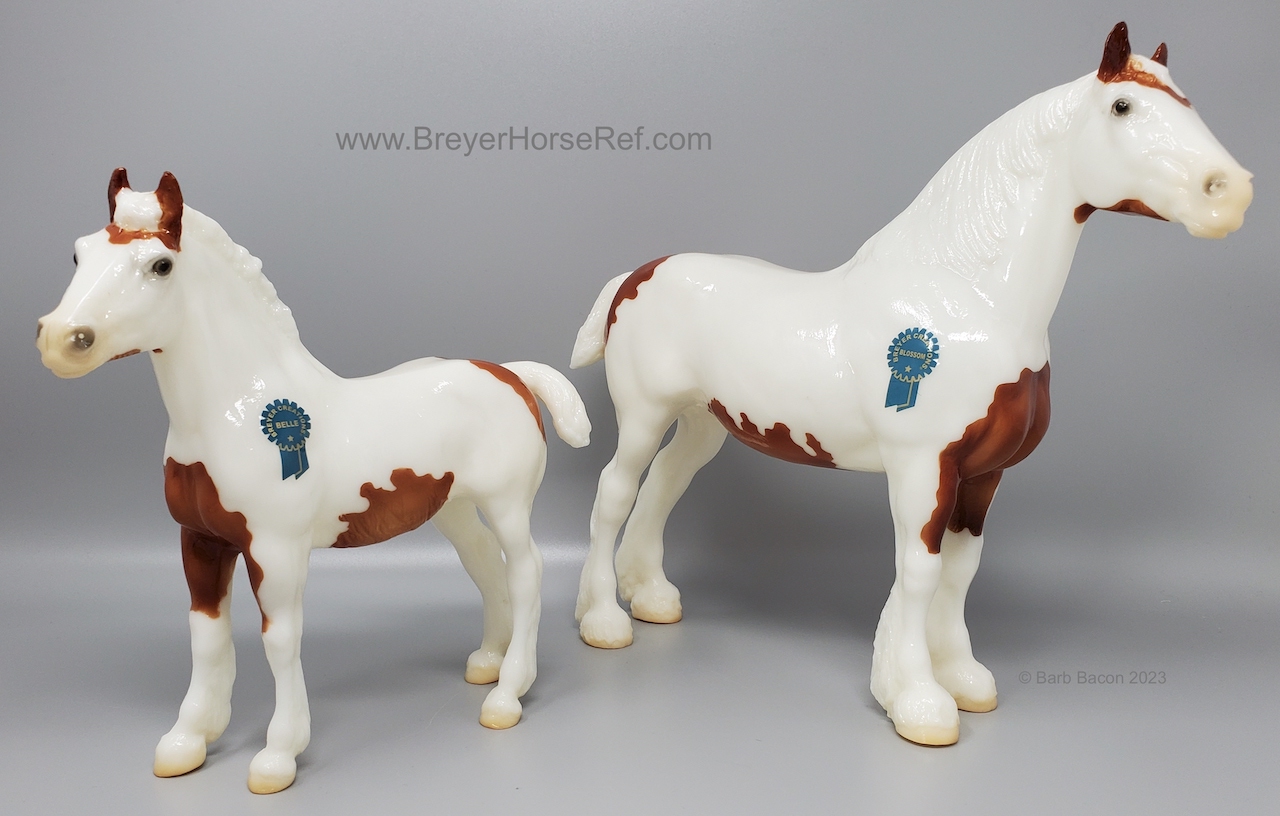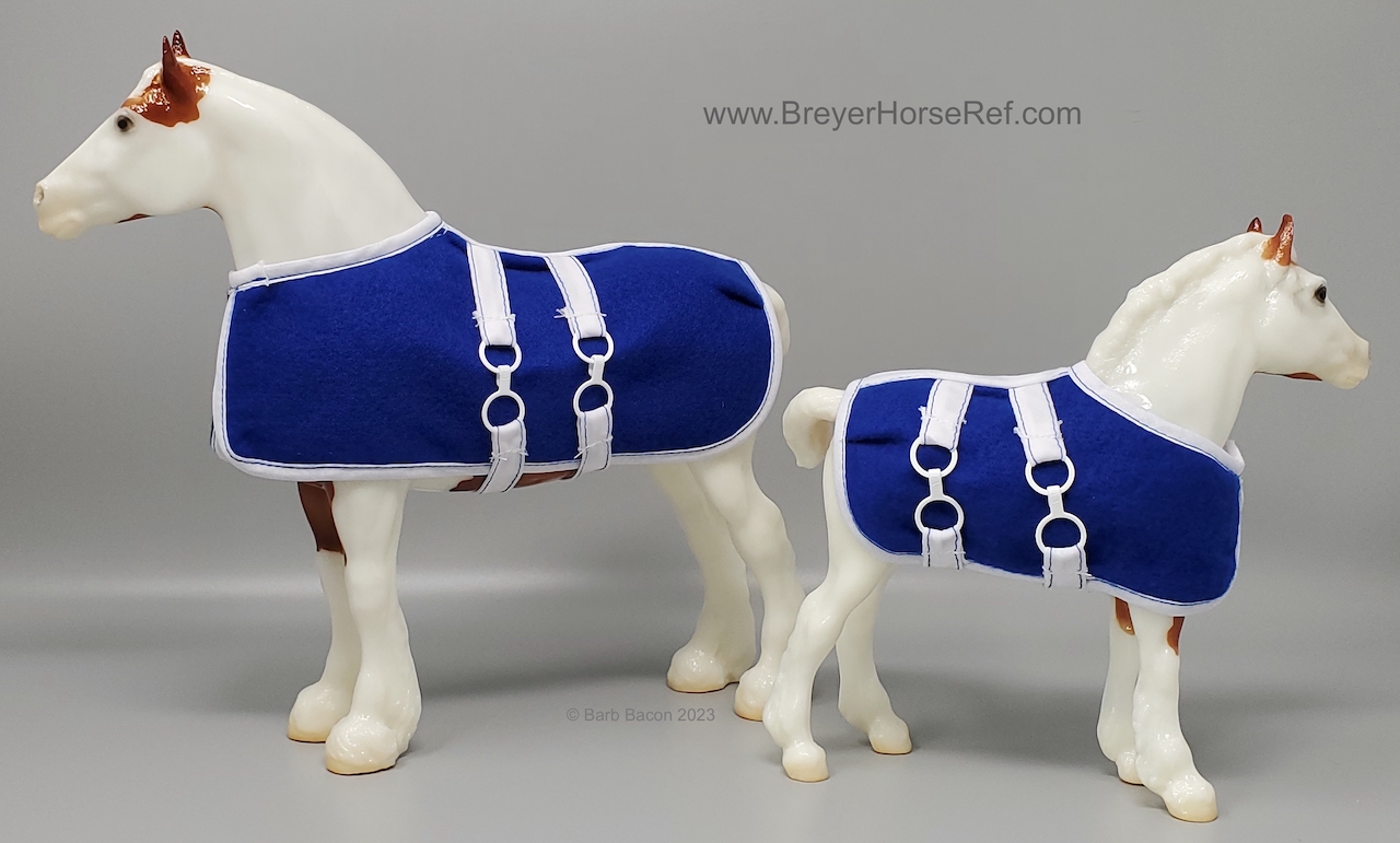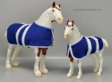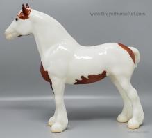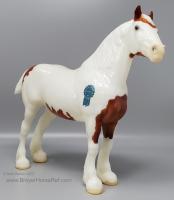 Glossy Chestnut Pinto with blue felt blankets and matching Clydesdale Foal. Has the San Domingo color and pattern. 2017 Vintage Collectors Club Stamp on belly. The felt blankets are similar to the original felt blankets issued on set #8384 with the metal fasteners. Later releases on that set had velcro fasteners.