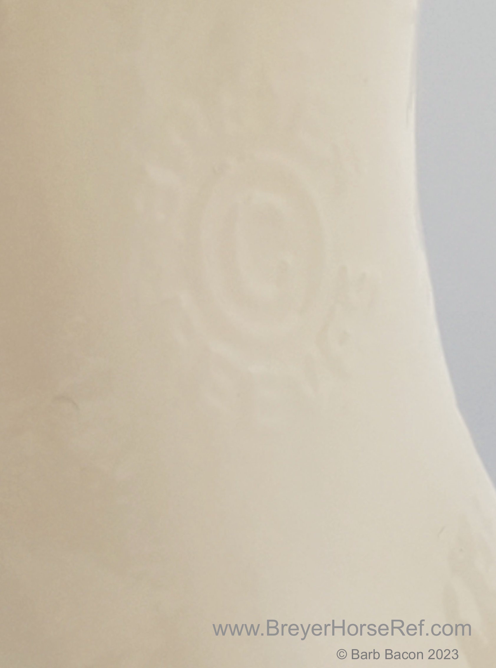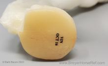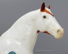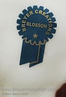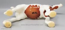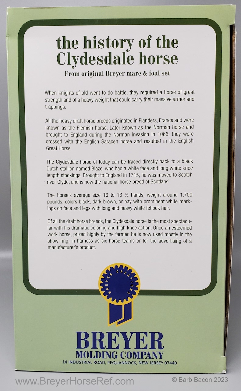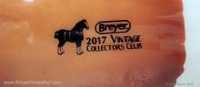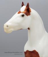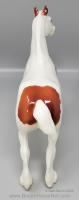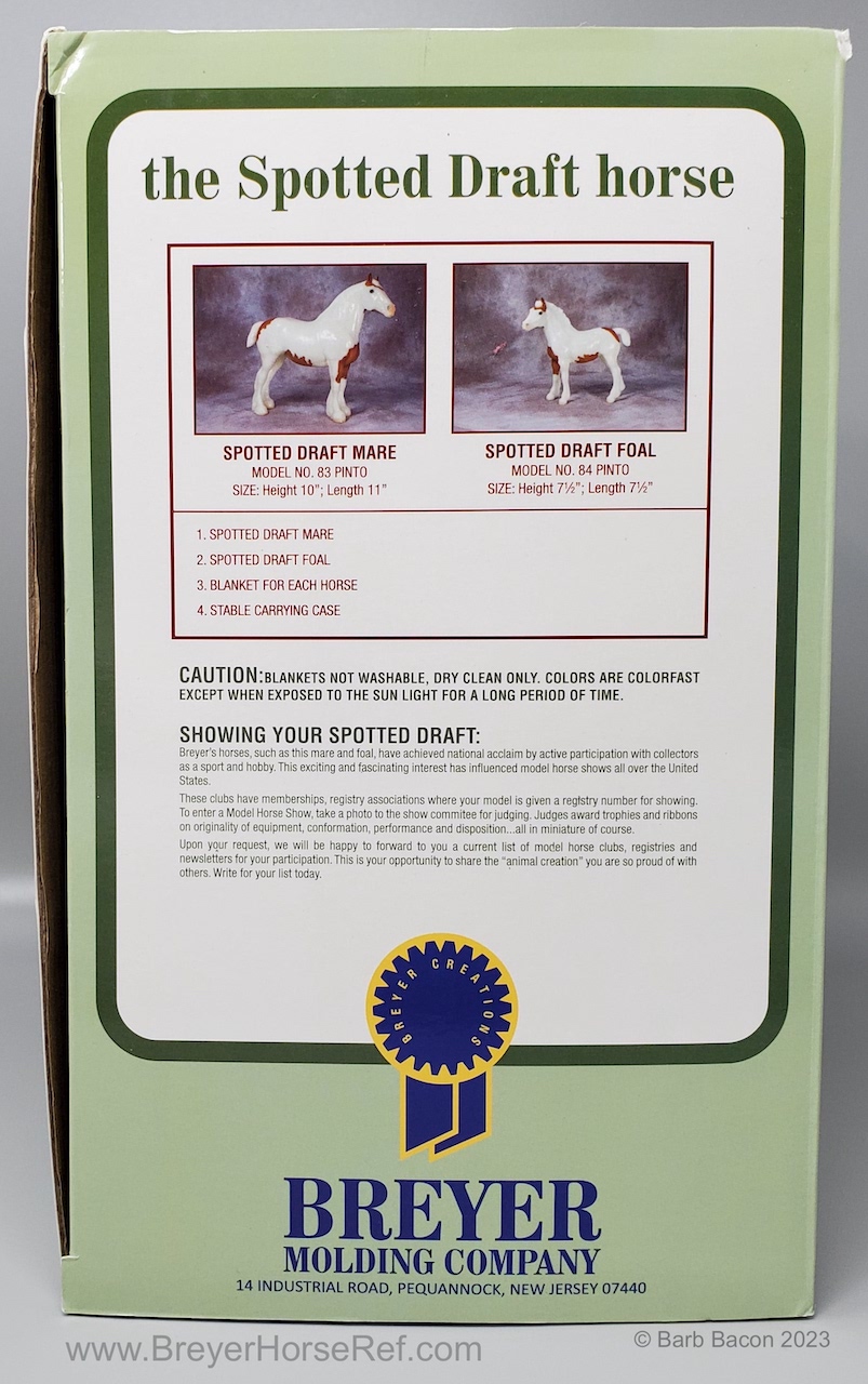 Glossy Chestnut Pinto with blue felt blankets and matching Clydesdale Foal. Has the San Domingo color and pattern. 2017 Vintage Collectors Club Stamp on belly. The felt blankets are similar to the original felt blankets issued on set #8384 with the metal fasteners. Later releases on that set had velcro fasteners.