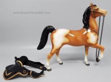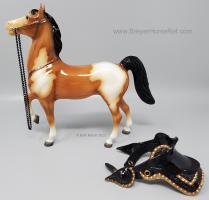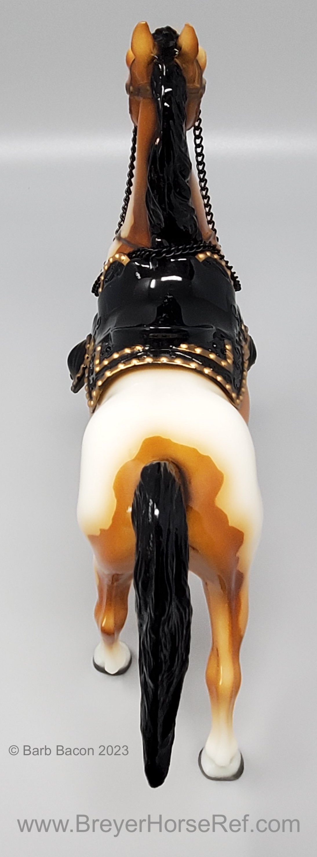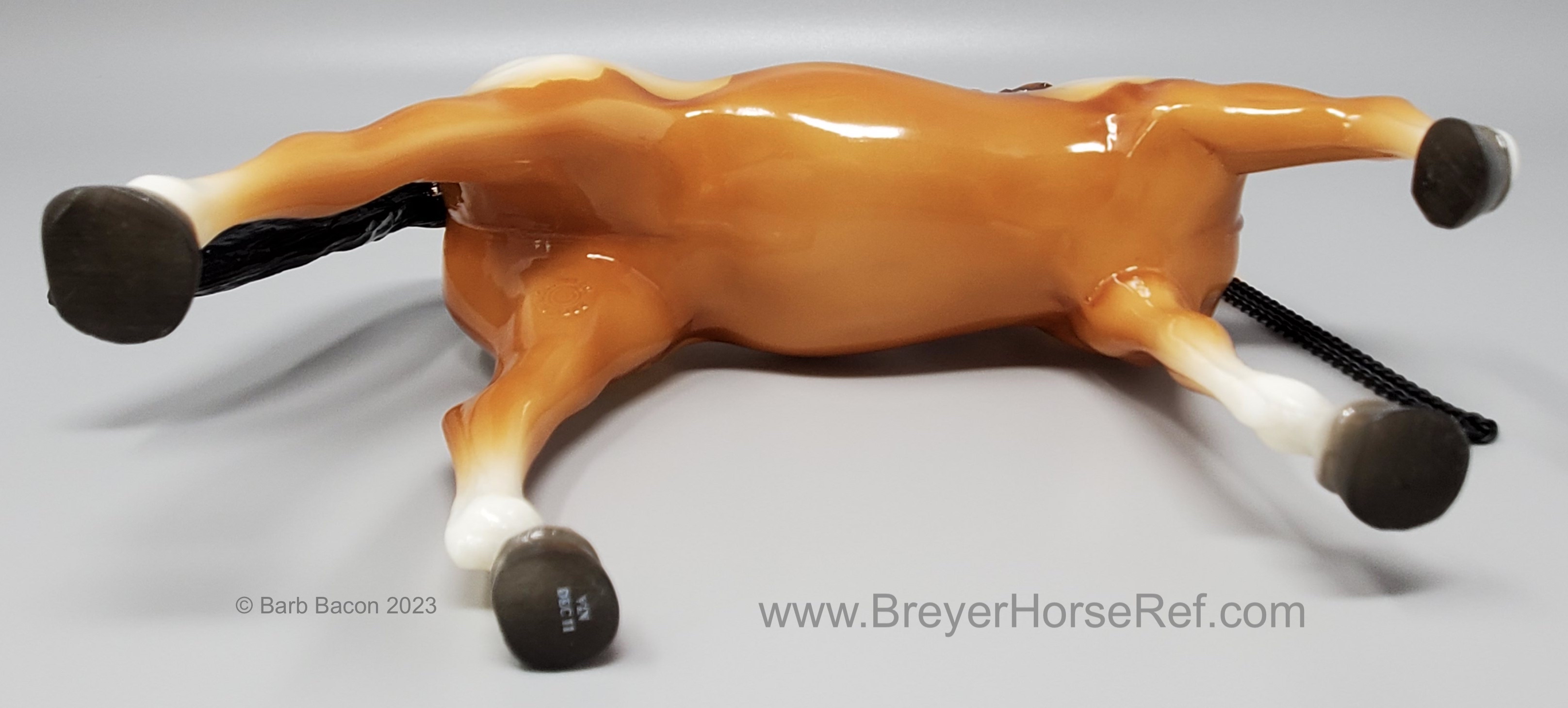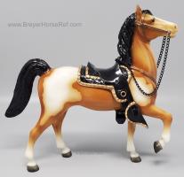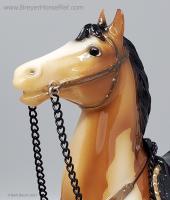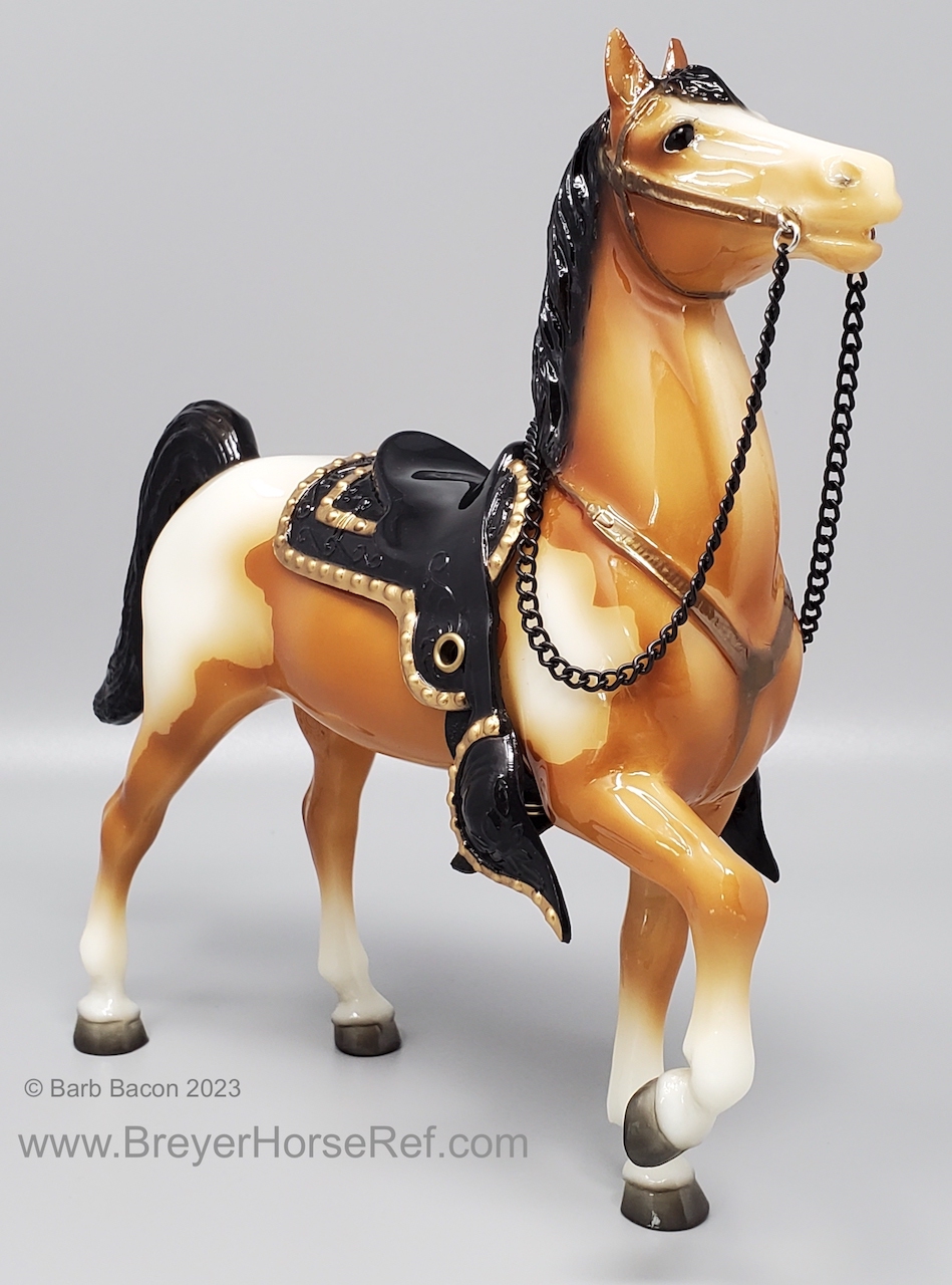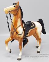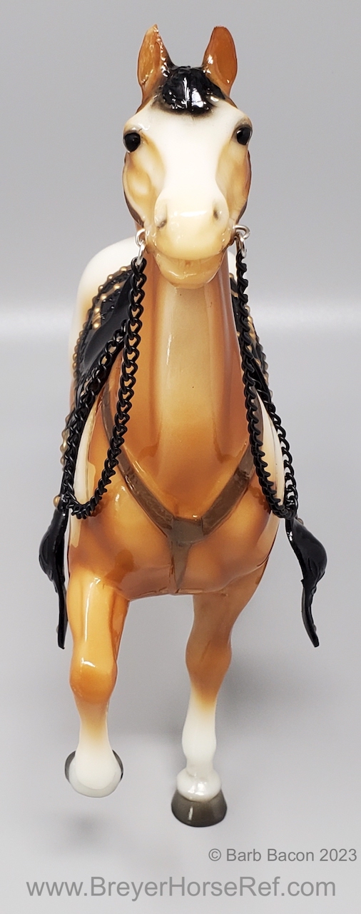 Glossy Honey Bay Tobiano with old style black snap-on saddle, and black or gold chain reins (unsure if one is more uncommon). Limited Edition Retro-Release. On the 2012 Retired List.