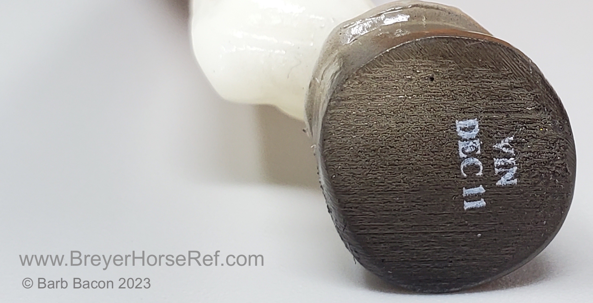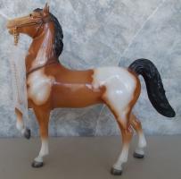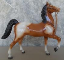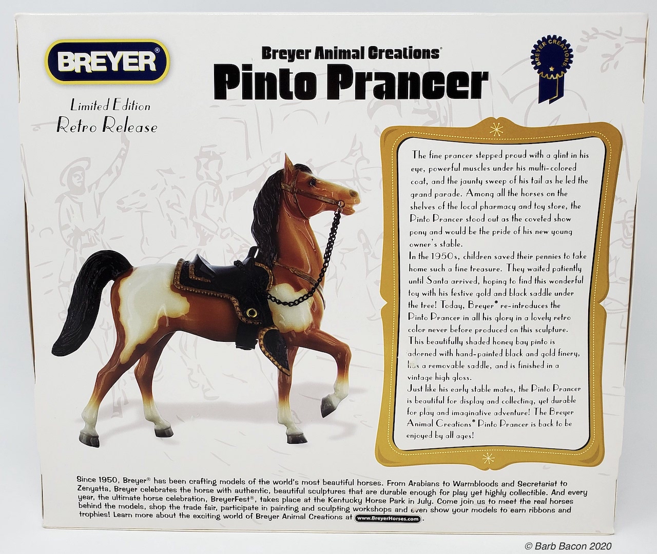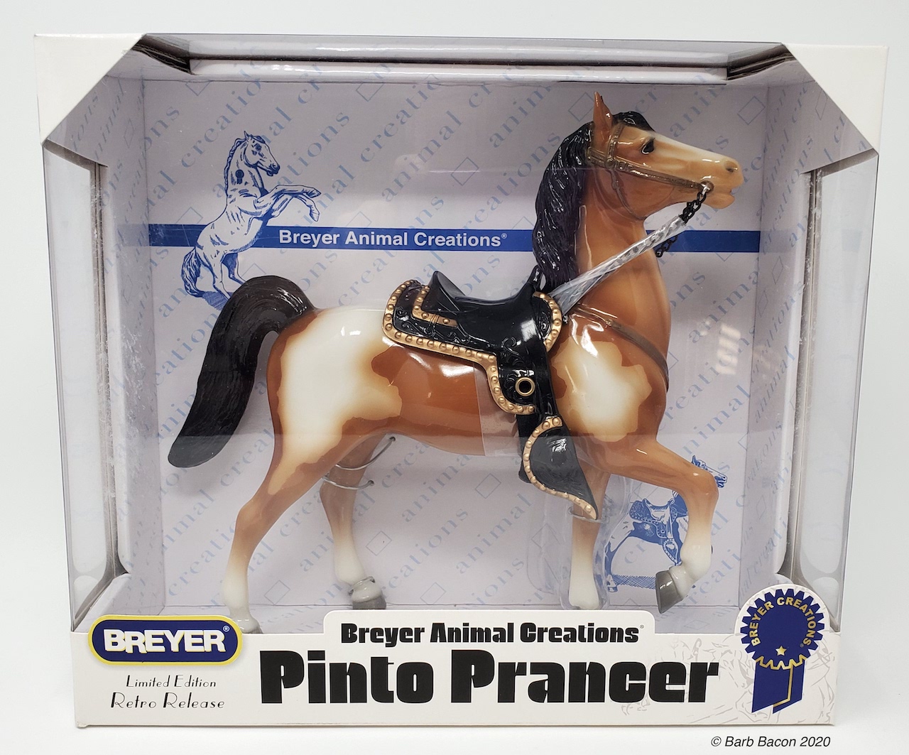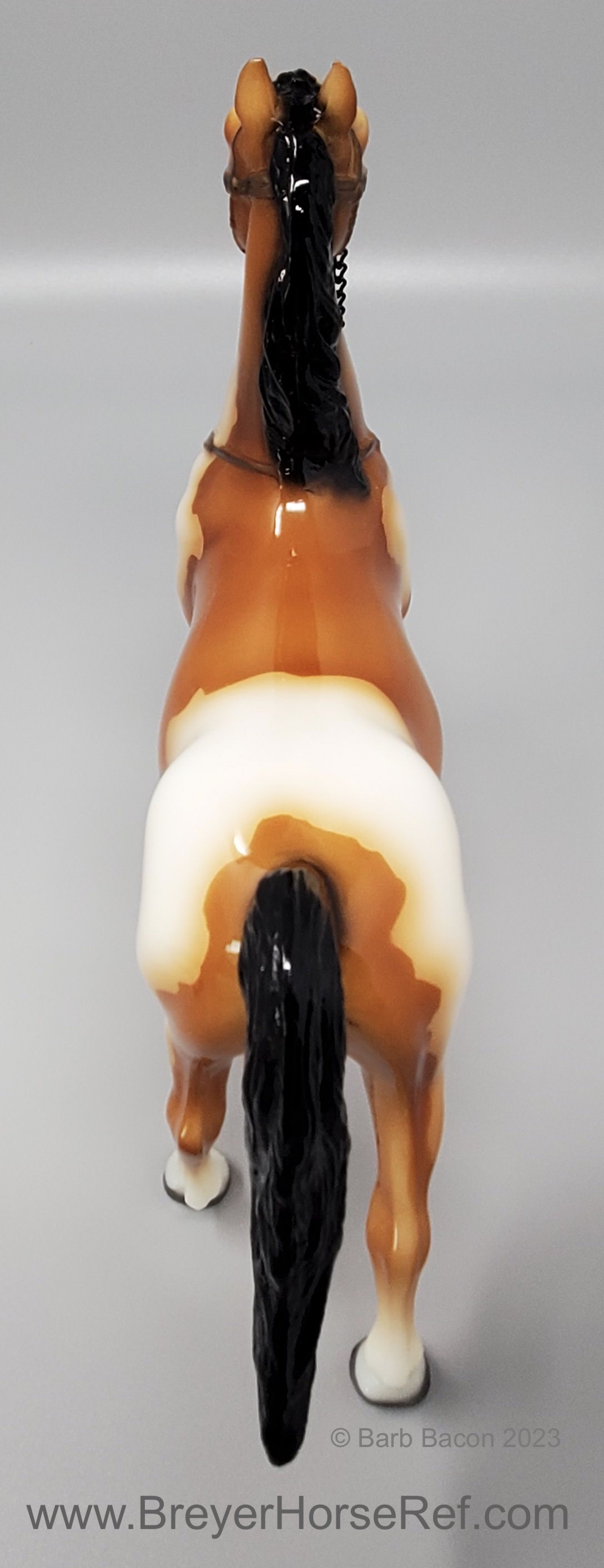 Glossy Honey Bay Tobiano with old style black snap-on saddle, and black or gold chain reins (unsure if one is more uncommon). Limited Edition Retro-Release. On the 2012 Retired List.