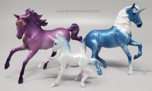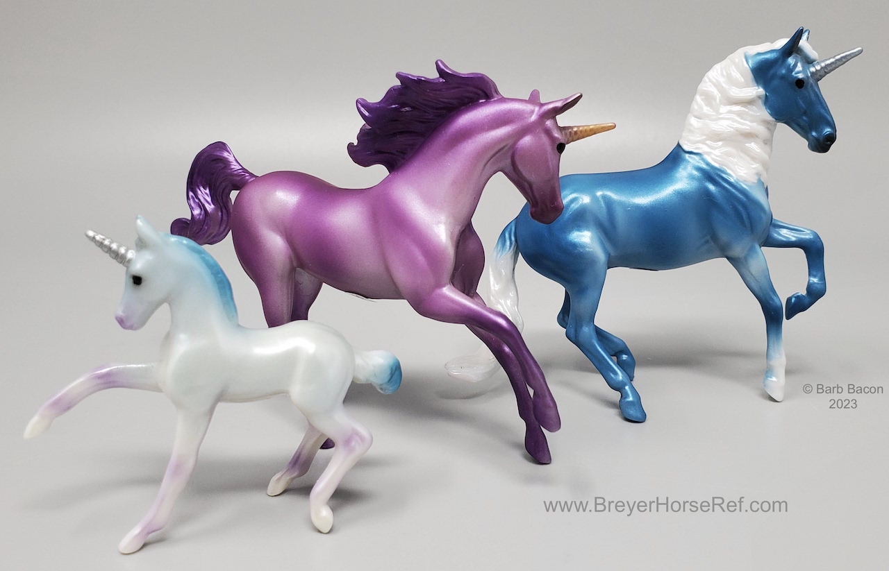 This set included a purple Magnolia, blue Alborozo, and a blue and purple Frisky Foal. #6062 is for this family set, and #6052 is the assortment number for three different family sets. Packaging refers to this set as 'Unicorn Foal Surprise Set #2' and the Breyer website refers to this set as 'Mystery Unicorn Foal Surprise Set A'.