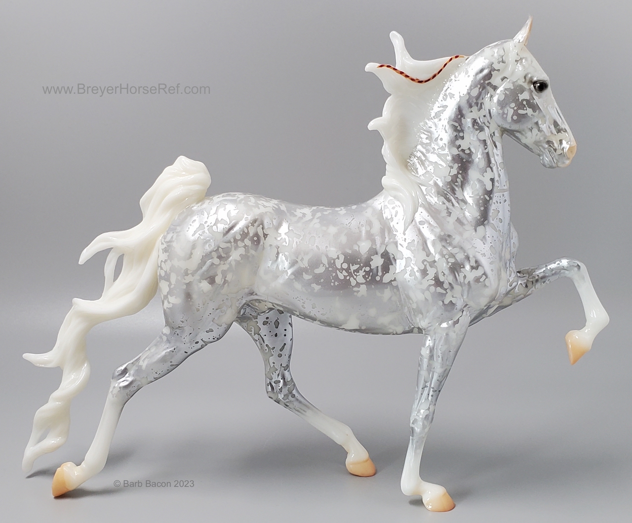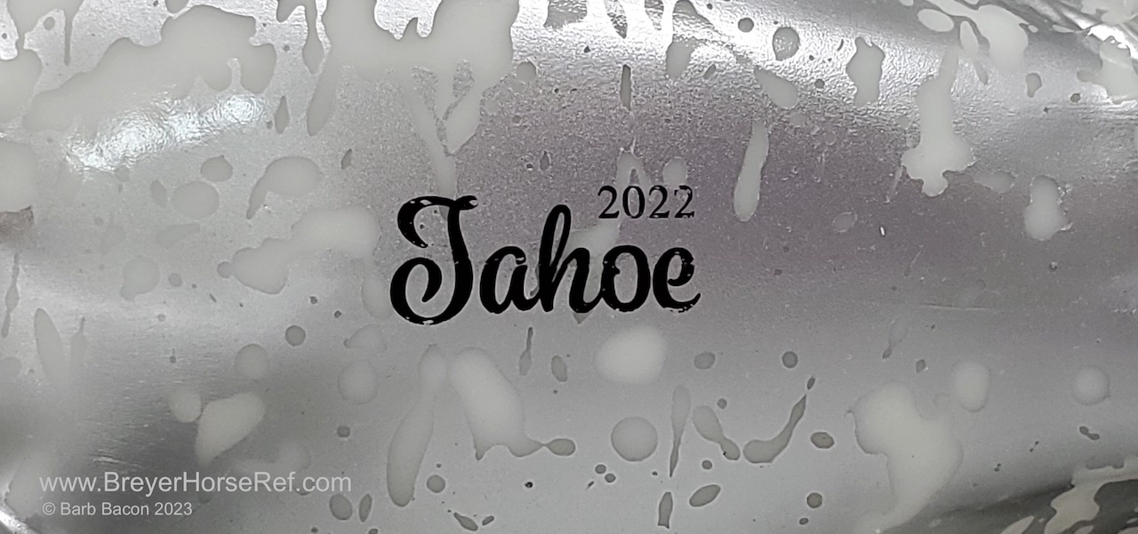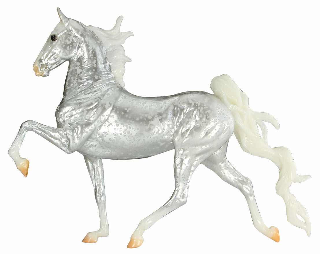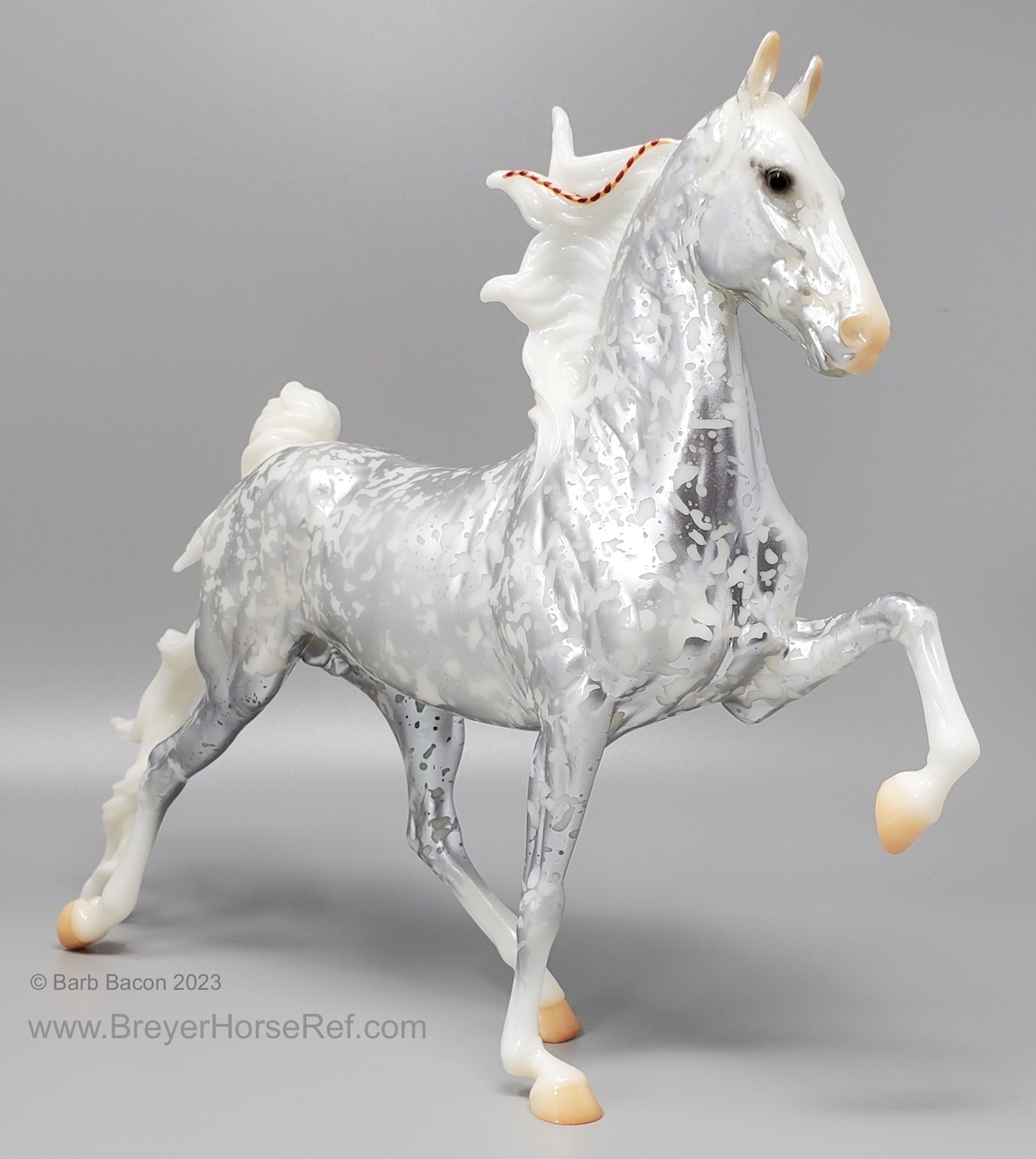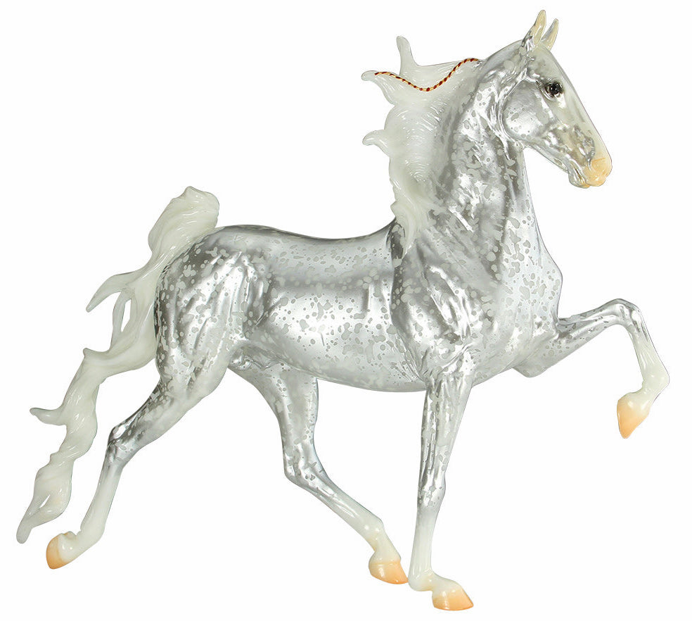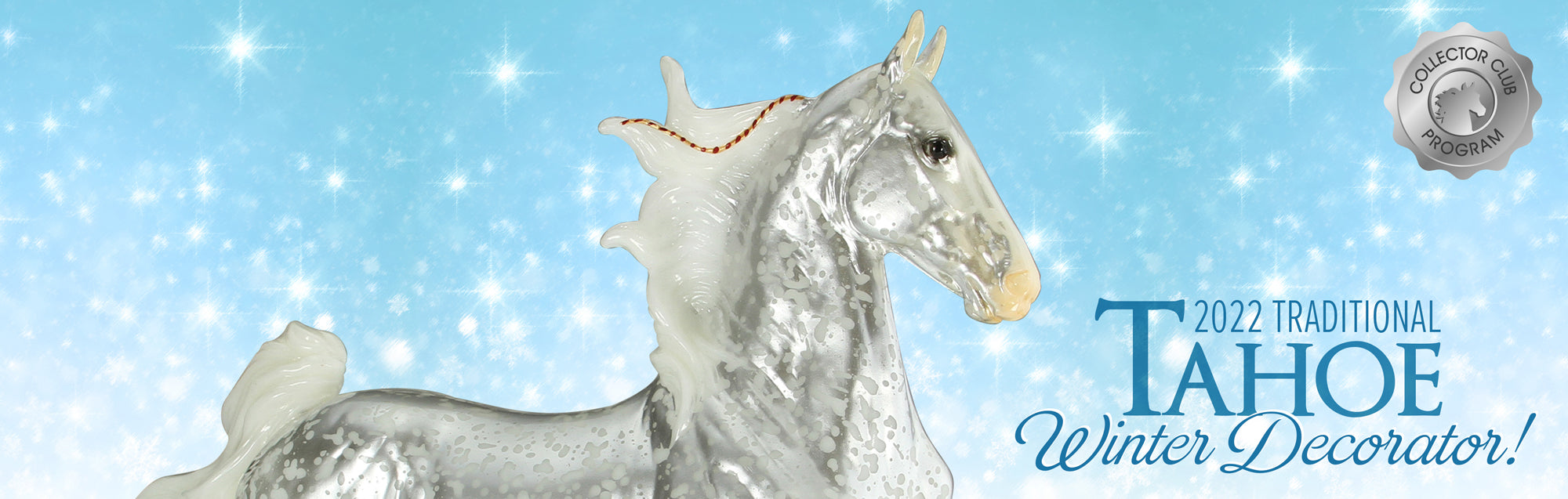 "Tahoe - The 2022 Winter Decorator Web Special. Nestled in the Sierra Nevada Mountains between California and Nevada lies Lake Tahoe and its famed ski areas. Home to some of the best ski resorts in the world, winter sports enthusiasts flock to this locale for its unparalleled views, steep slopes, and deep powder. Tahoe is a flashy Saddlebred stallion. With his silver filigree coat, proud high-stepping gait, and his mane and tail trailing behind him, he leaves no doubt as to who is the king of the mountain! Tahoe’s icy look is completed with red and green braids in his mane and a high-gloss finish. He sports “Tahoe 2022” on his belly." www.breyerhorses.com.