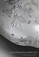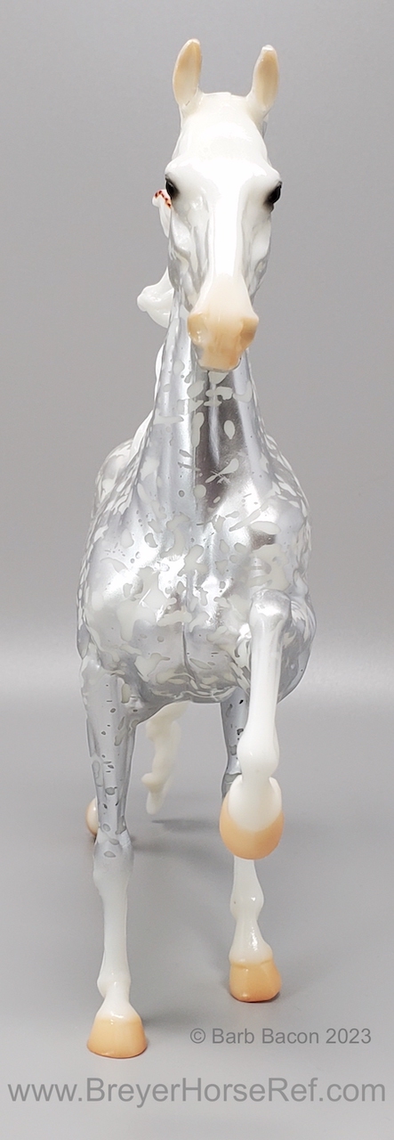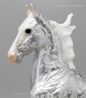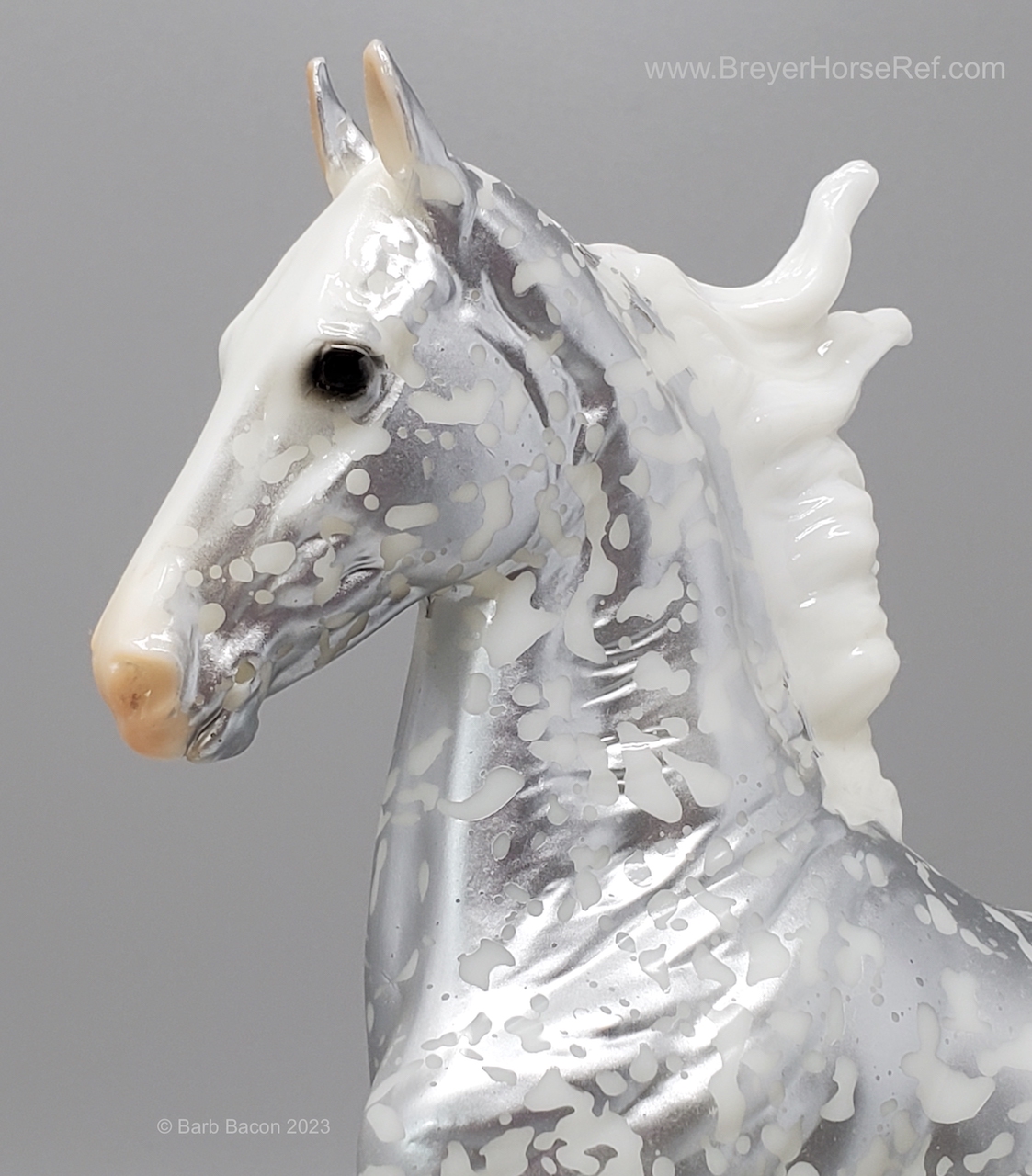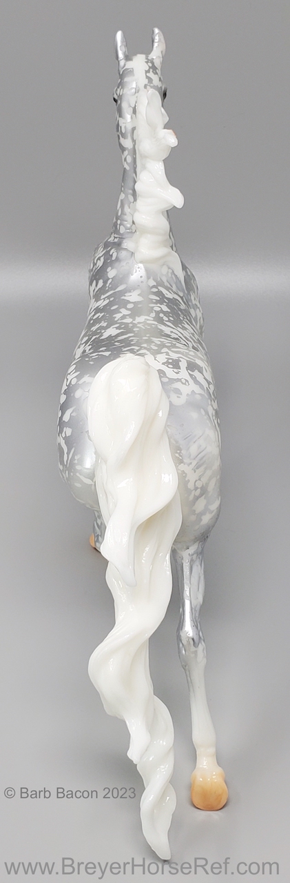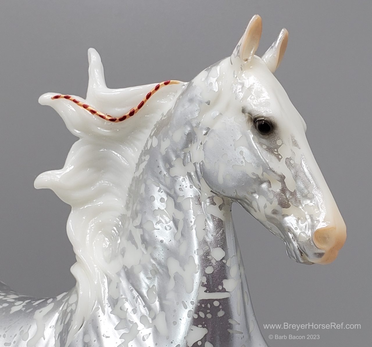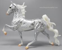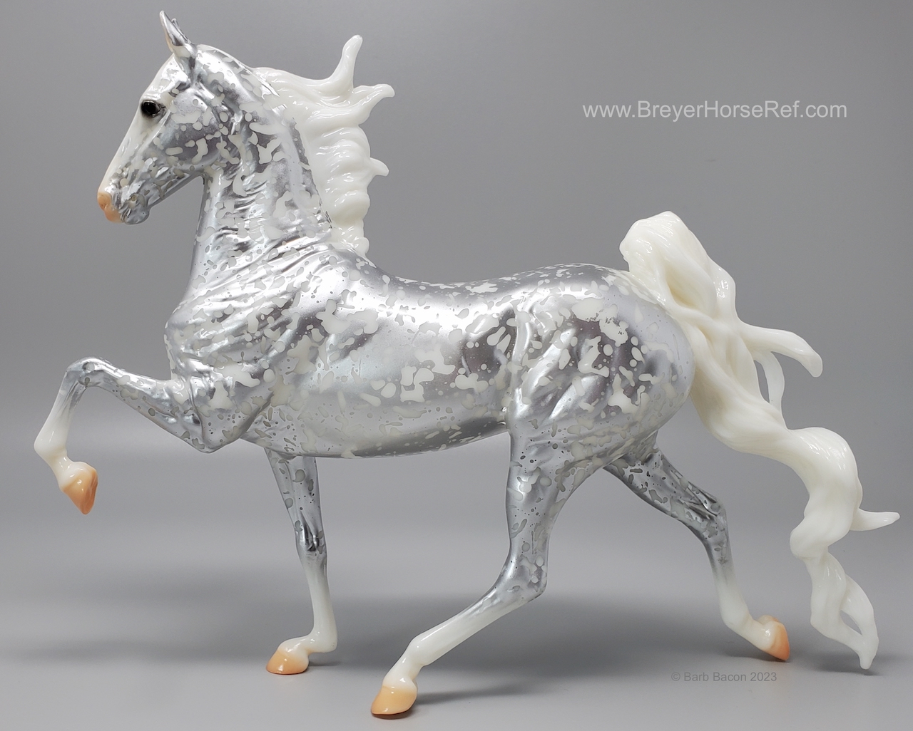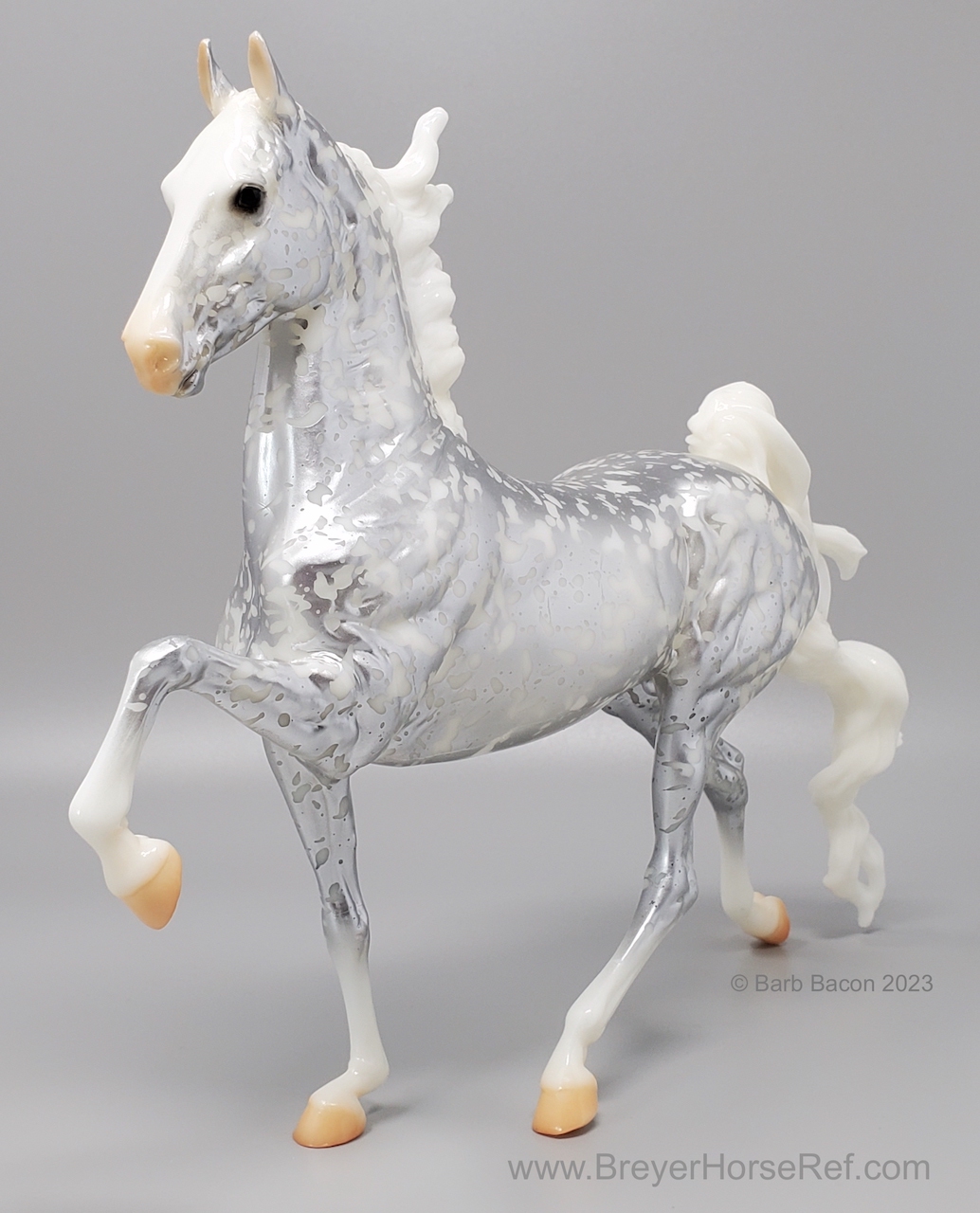 "Tahoe - The 2022 Winter Decorator Web Special. Nestled in the Sierra Nevada Mountains between California and Nevada lies Lake Tahoe and its famed ski areas. Home to some of the best ski resorts in the world, winter sports enthusiasts flock to this locale for its unparalleled views, steep slopes, and deep powder. Tahoe is a flashy Saddlebred stallion. With his silver filigree coat, proud high-stepping gait, and his mane and tail trailing behind him, he leaves no doubt as to who is the king of the mountain! Tahoe’s icy look is completed with red and green braids in his mane and a high-gloss finish. He sports “Tahoe 2022” on his belly." www.breyerhorses.com.