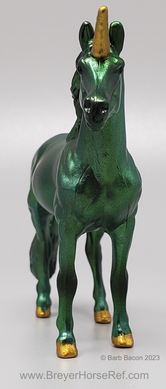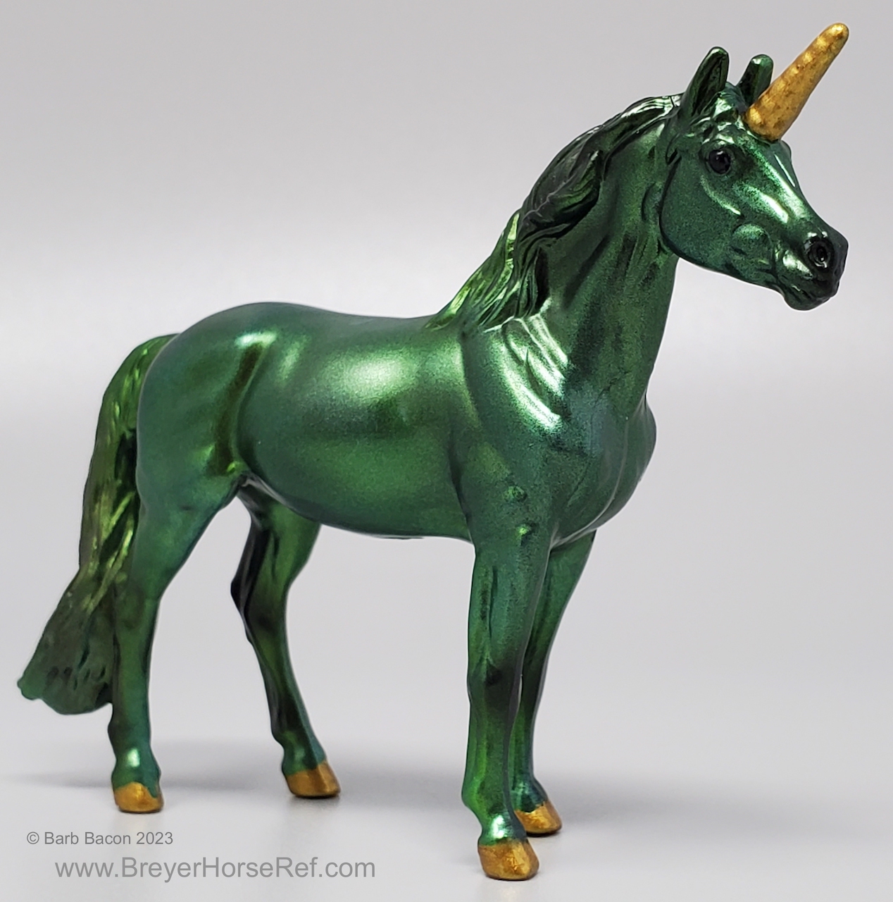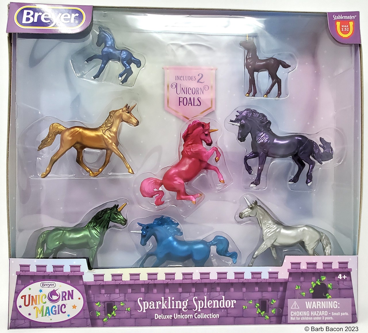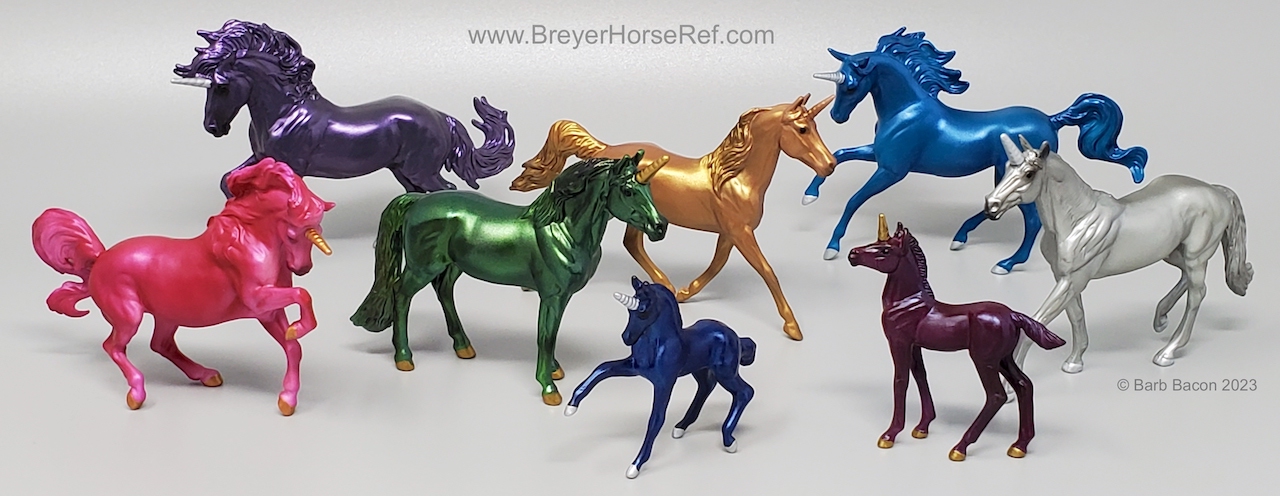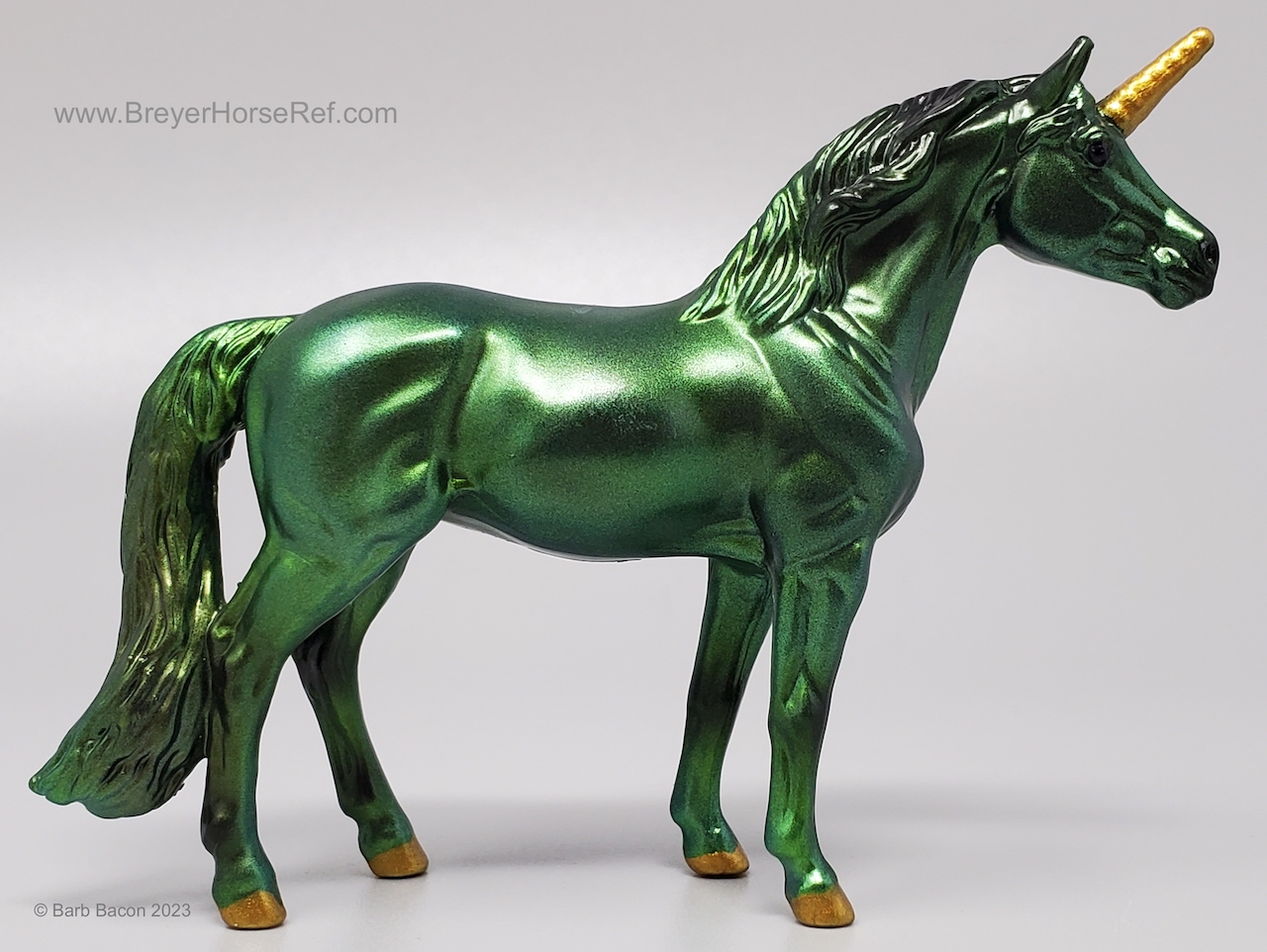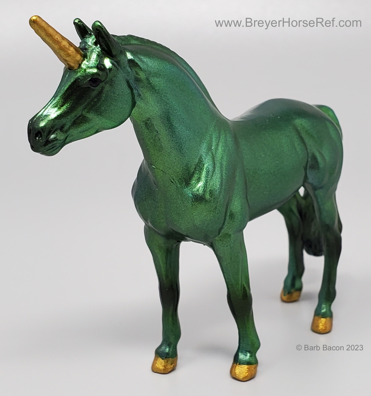 In 2023-2025, this model was part of the Sparkling Splendor Deluxe Unicorn Collection #6937. The colors are described as "Reflecting the deep, rich colors of the crystals that adorn their environment" (from the Breyer box). The set included a blue Magnolia (Cherish), a pink Connemara Mare (Charmer), a green Warmblood Mare (Elegant), a silver Walking TB (Esteem), a dark purple Standing Foal (Glamour), a dark blue Frisky Foal (Gleam), a purple Fireheart (Trifle) and a gold Prince Charming (Trinket). On the 2025 Retired List.