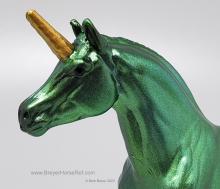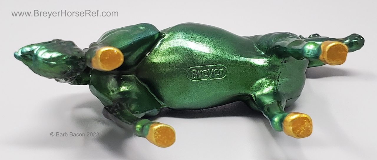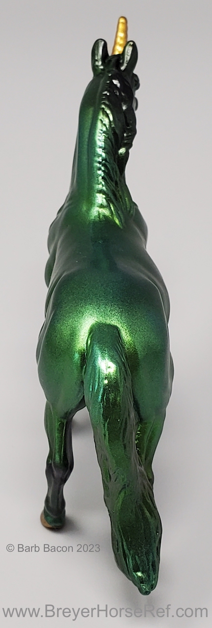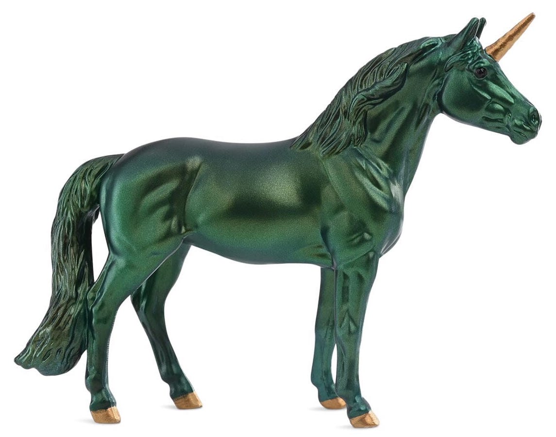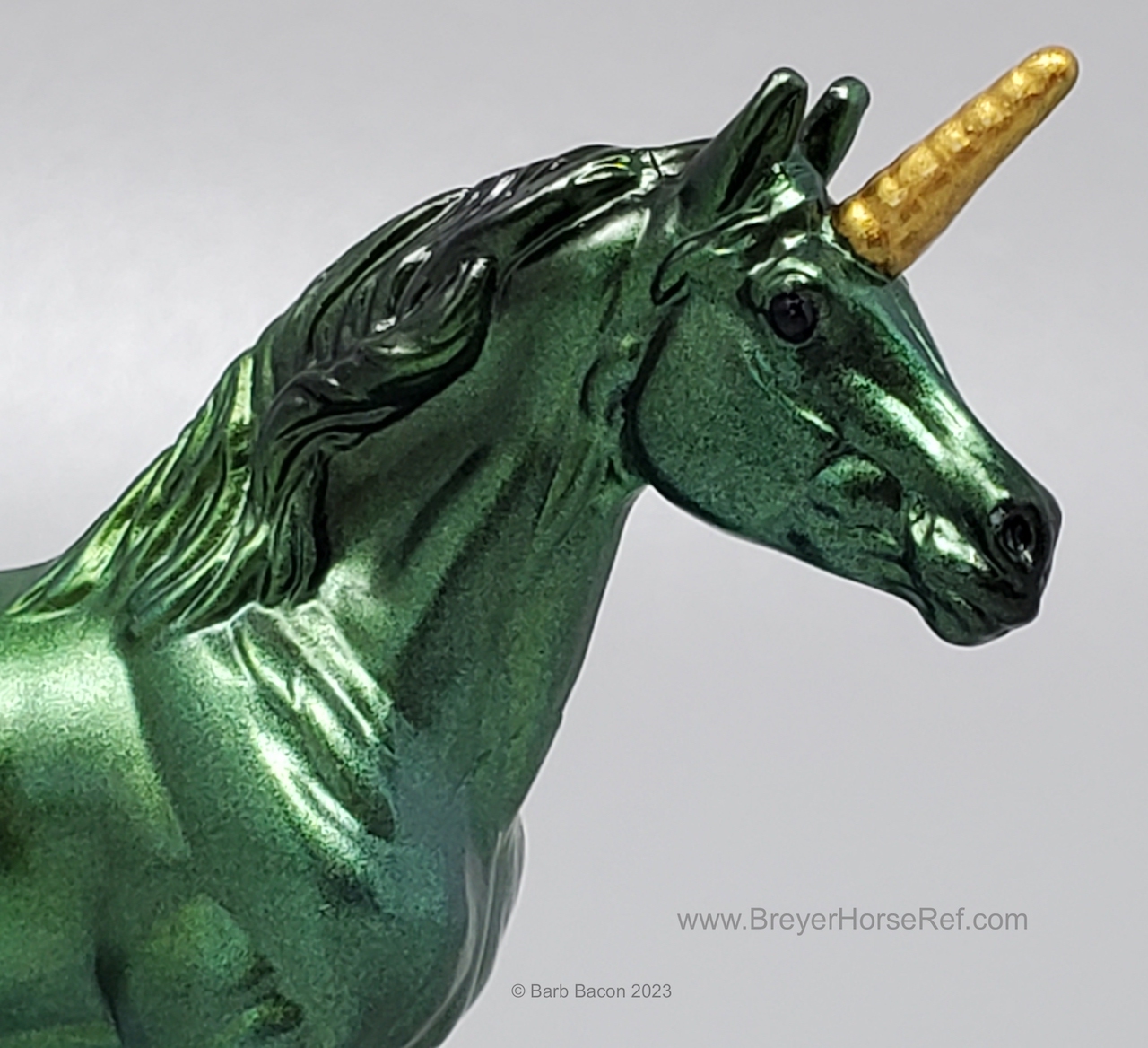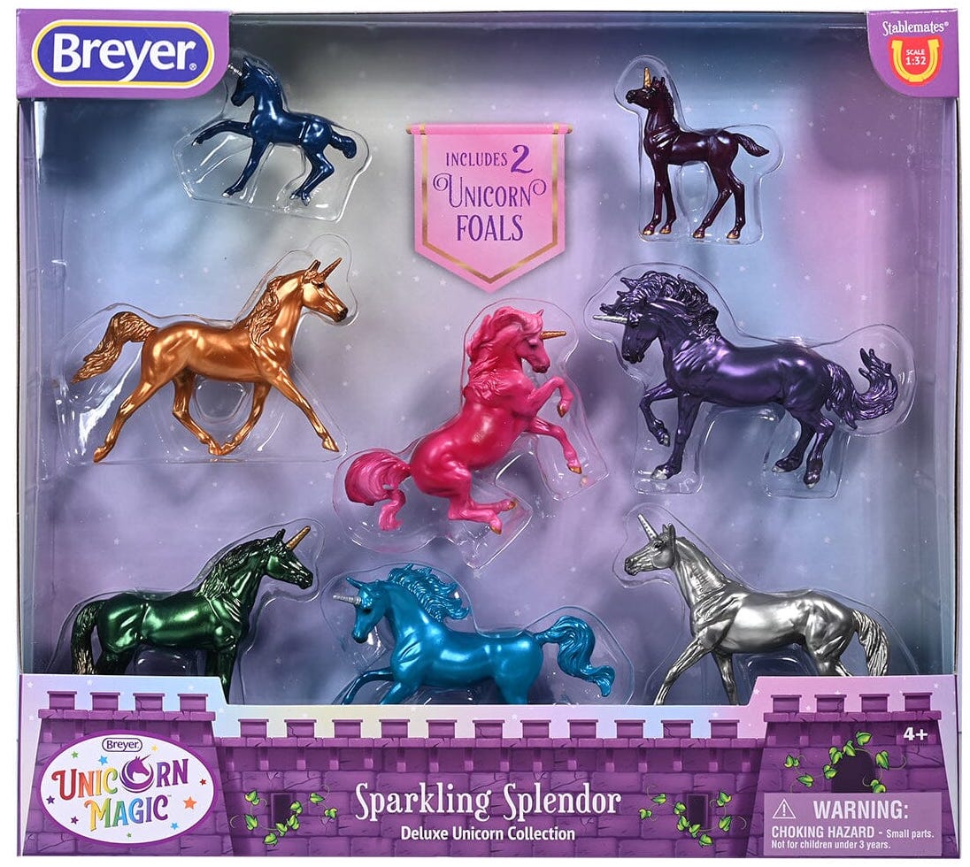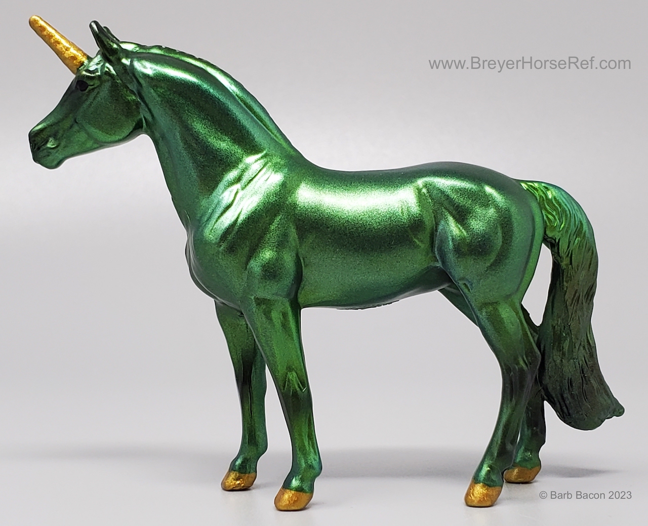 In 2023-2025, this model was part of the Sparkling Splendor Deluxe Unicorn Collection #6937. The colors are described as "Reflecting the deep, rich colors of the crystals that adorn their environment" (from the Breyer box). The set included a blue Magnolia (Cherish), a pink Connemara Mare (Charmer), a green Warmblood Mare (Elegant), a silver Walking TB (Esteem), a dark purple Standing Foal (Glamour), a dark blue Frisky Foal (Gleam), a purple Fireheart (Trifle) and a gold Prince Charming (Trinket). On the 2025 Retired List.
