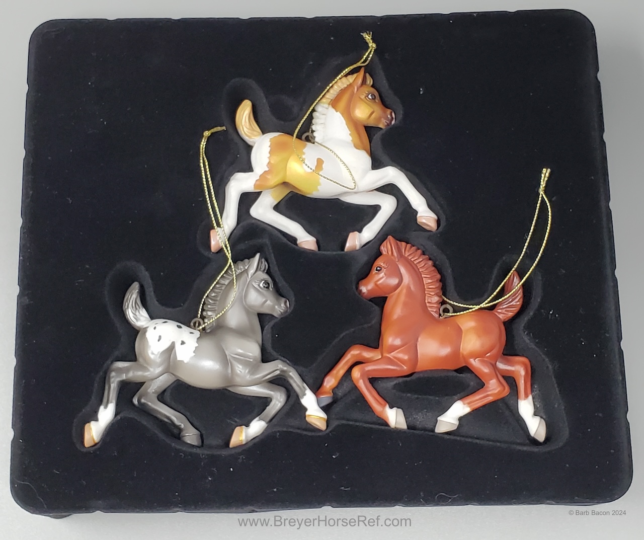 Advertised as the 4th in the Holiday Fillies Ornament Collection. Set included a Chestnut Pinto, Grey Appaloosa and Chestnut Fillies.