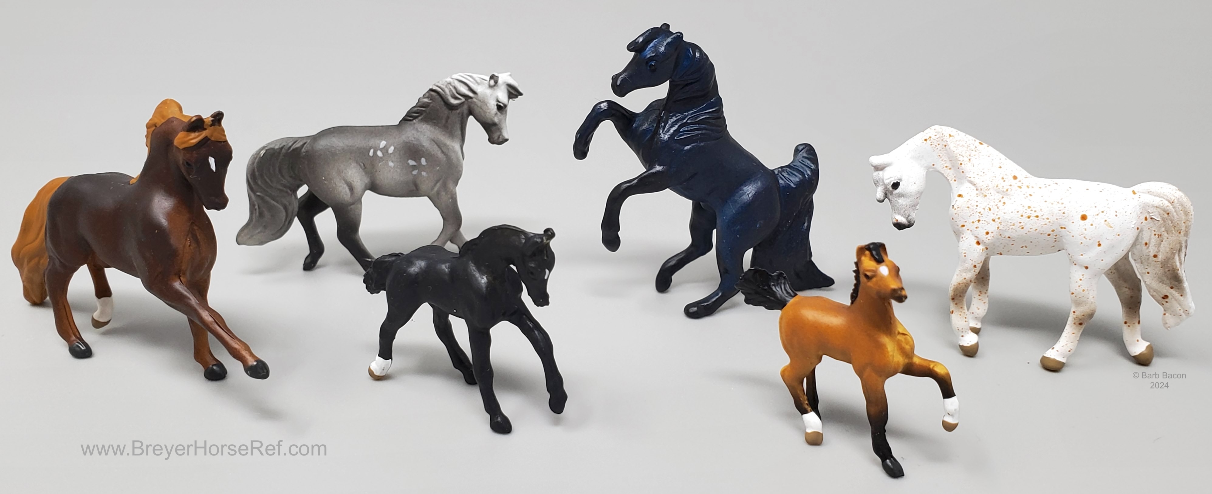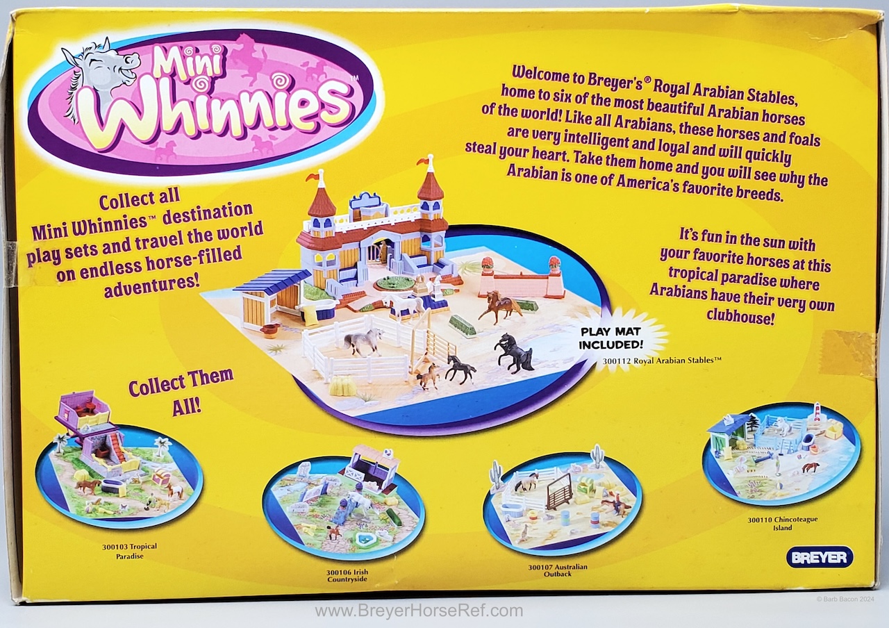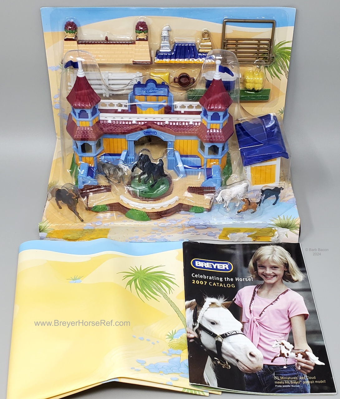Set #300112 Royal Arabian Play Set from 2006-2007, included the Cantering Morgan, Playful Arabian, Prancing Foal, Romping Foal, Trotting Morgan, Walking Arabian, Castle, Stall, Corral with Gate, 3 Jumps, Water Trough, Oat Bag, Bucket, Trophy Stand, Gold and Silver Trophies, Hay Bale and Play Mat.