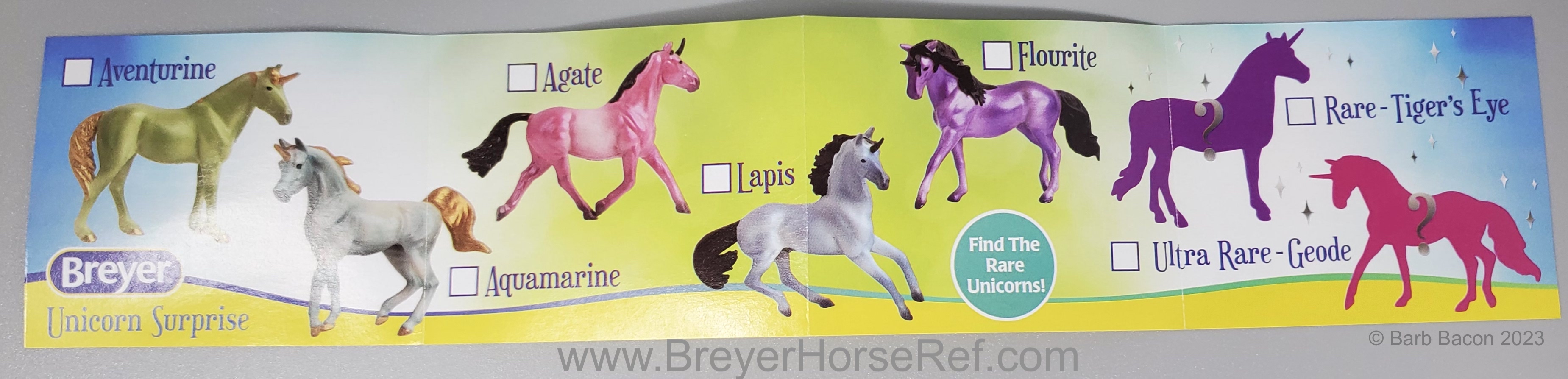 "There are 10 different unicorns, as well as special, rare chase pieces! Each blind bag contains a Mini Whinnies unicorn, unicorn sticker, and collector booklet." www.breyerhorses.com. Individual Bags #300202 and Display #300205.