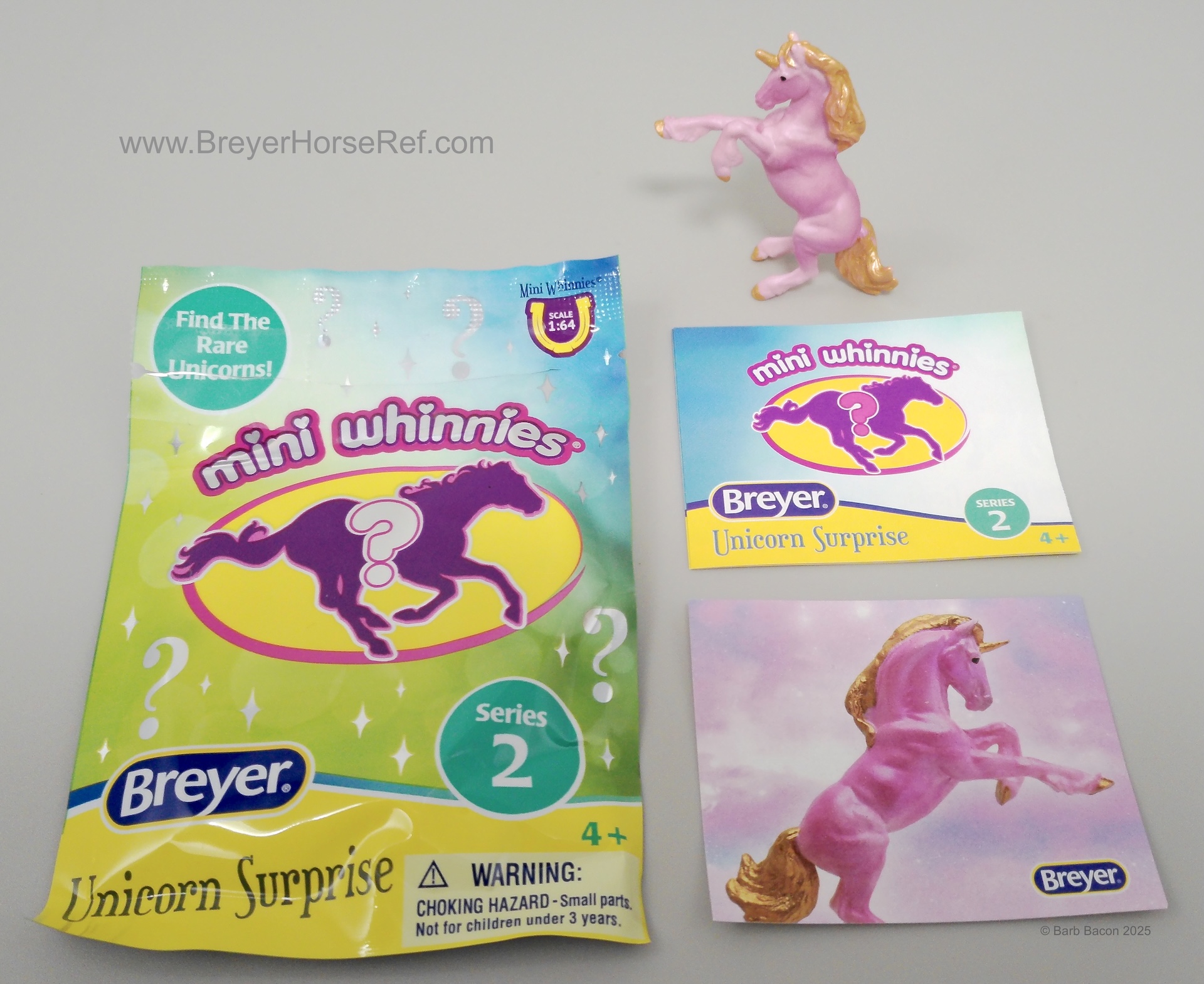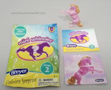 "There are 10 different unicorns, as well as special, rare chase pieces! Each blind bag contains a Mini Whinnies unicorn, unicorn sticker, and collector booklet." www.breyerhorses.com. Individual Bags #300202 and Display #300205.