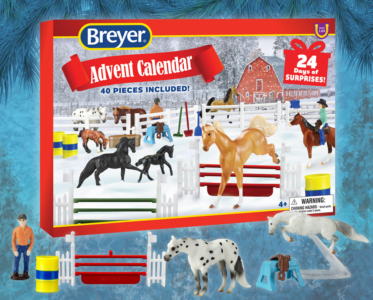 "The holiday tradition of the Advent Calendar gets a Breyer spin! Starting on December 1st, count down to Christmas by opening one door each day to reveal Mini Whinnies item(s)! Features 40 hidden treasures, including 7 horses, 2 foals, 1 unicorn, 3 people figures, and a wide assortment of barn and riding accessories!" www.breyerhorses.com. Set included Firebird, Grazing Foal, High Stepping Saddlebred, Jog Trot QH, Jumping Morgan, Jumping TB, Romping Foal, Standing QH, Standing TB, and Trotting Morgan.