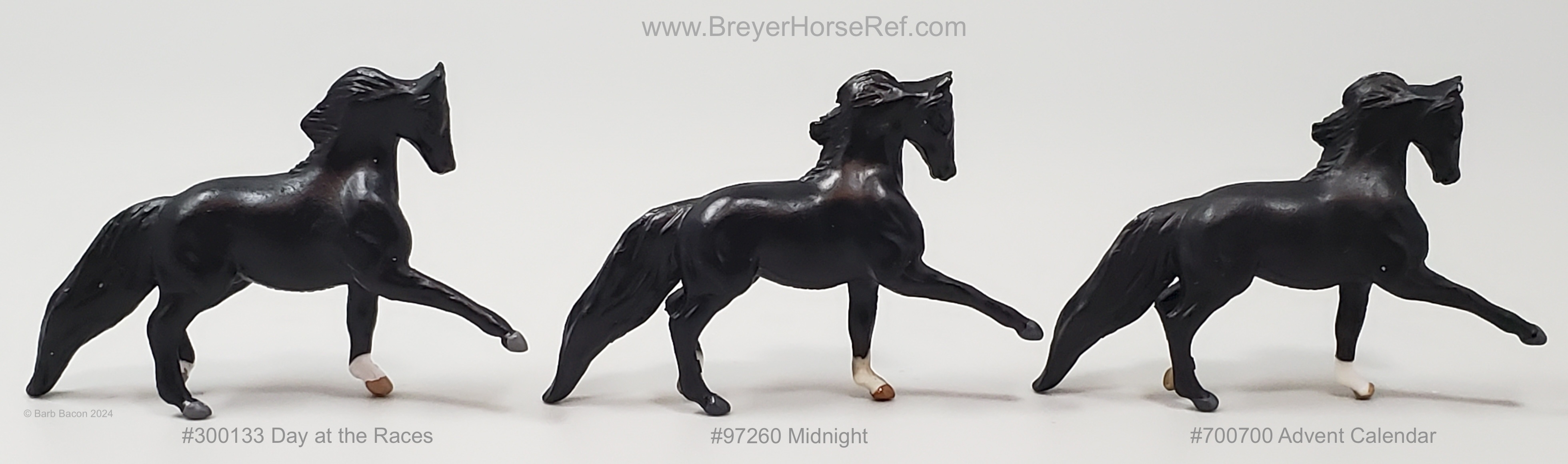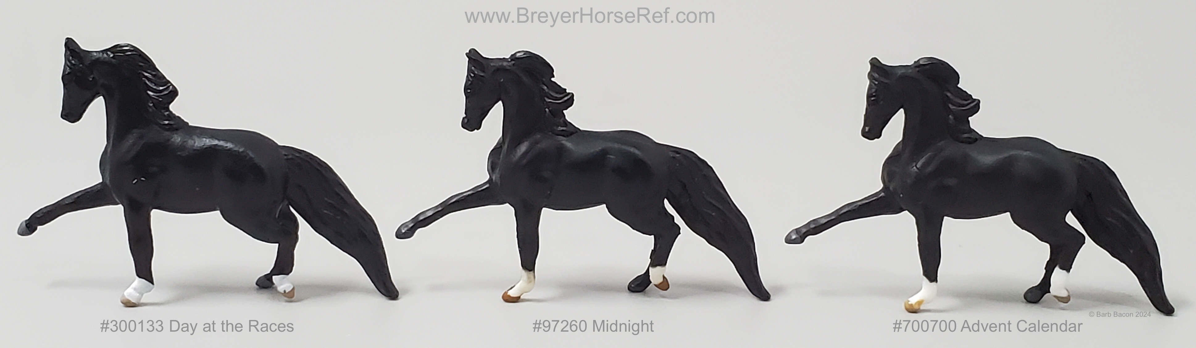 This model has the same color and pattern as #300133 Day at the Races, #97260 Midnight and #700700 Advent Calendar. The Advent Calendar model has white plastic markings; whereas the others have painted white markings. Hoof colors vary slightly between each model. Individual records created for each of these models as they all have multiple accessories.