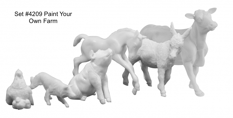 Released as the Paint Your Own Farm #4209 set from 2017-2018. Included a cow, scrambling foal, donkey, pig, chicken with chicks, border collie, 6 pieces of fence, 6 paint pots, paint brush and instruction booklet. On the 2018 Retired List, but still shown in the 2018/2019 catalog.
