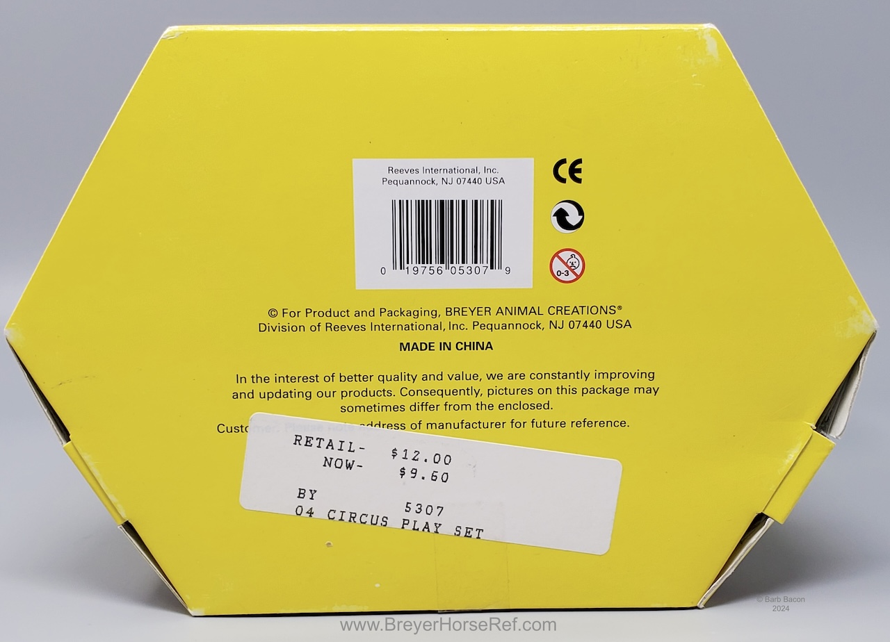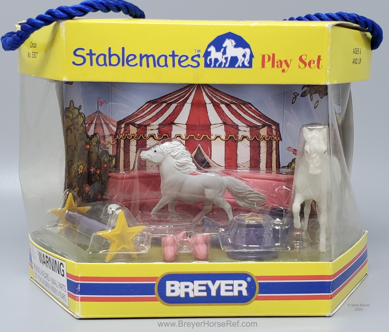 The Circus Play Set #5307 was released 2001-2004. Set included a White Andalusian, White Shetland Pony, Black and White Begging Dog, saddles and a variety of circus props. On the 2004 Retired List.