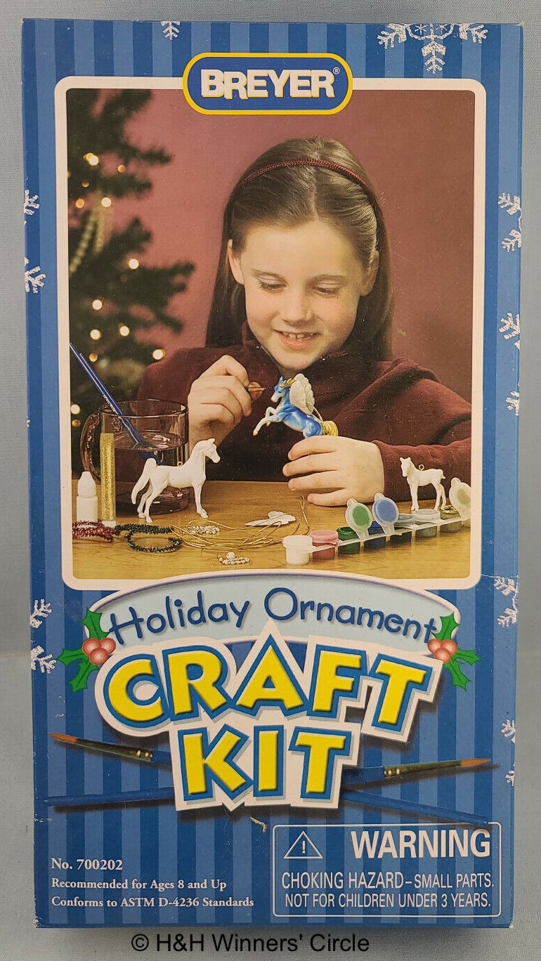 Holiday Ornament Craft Kit #700202 released in 2002. Included the Thoroughbred Standing Foal, Rearing Arabian, American Saddlebred, 8 paint pots, glue and craft items. Each model had a little ornament hook attached to the back. On the 2002 Retired List.