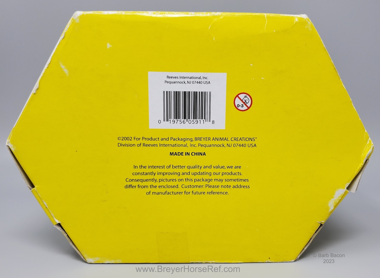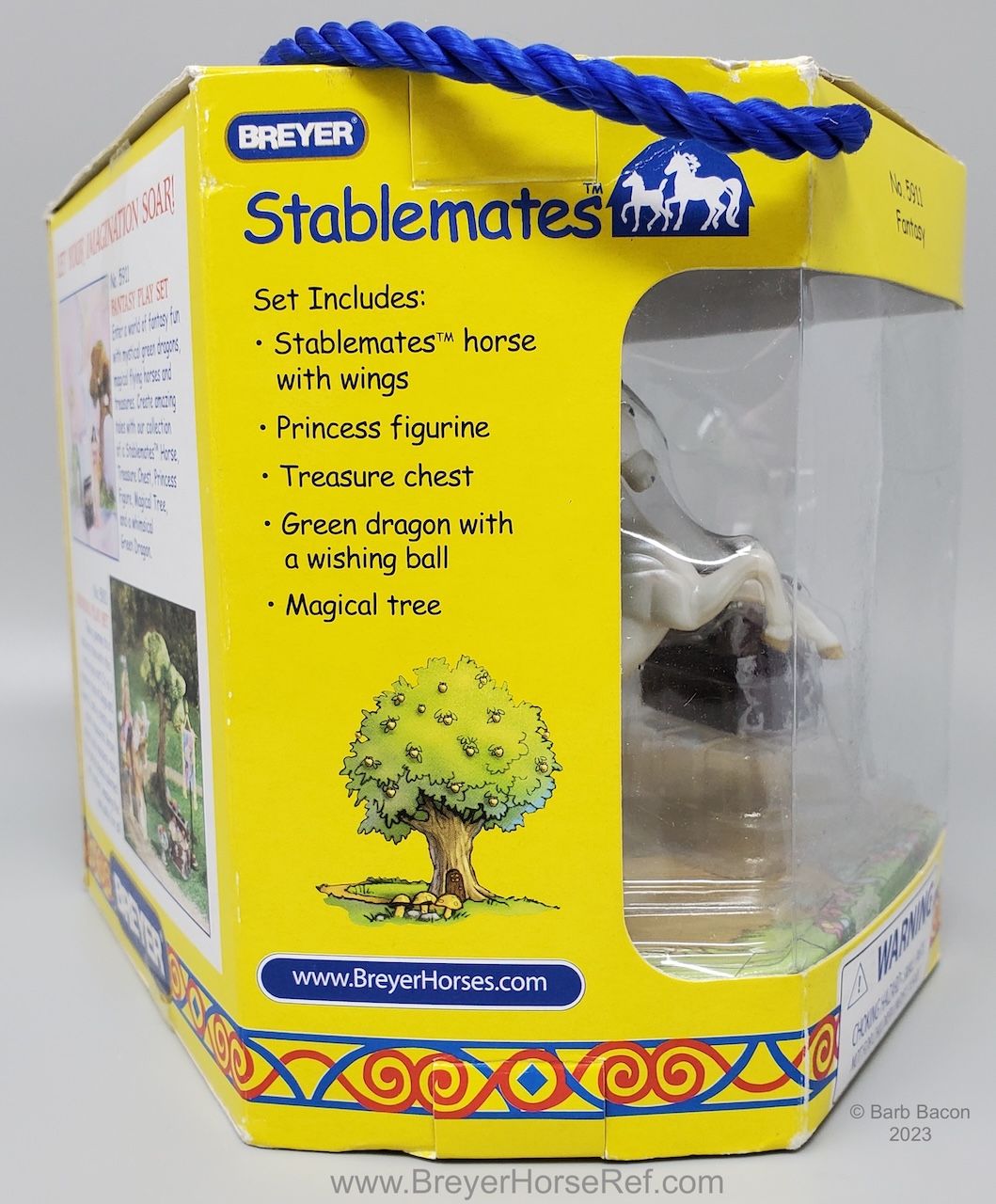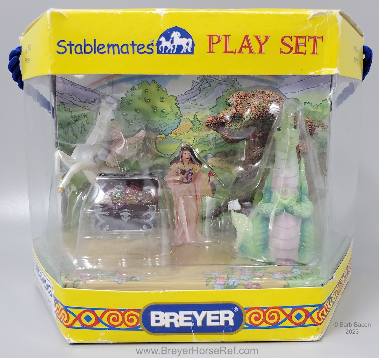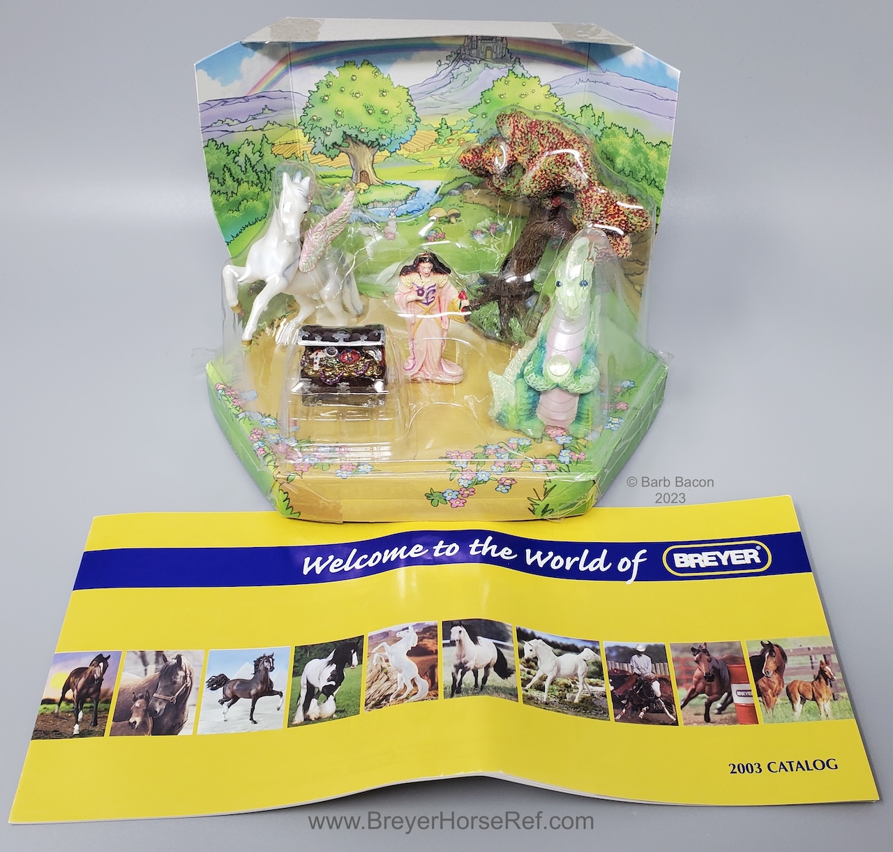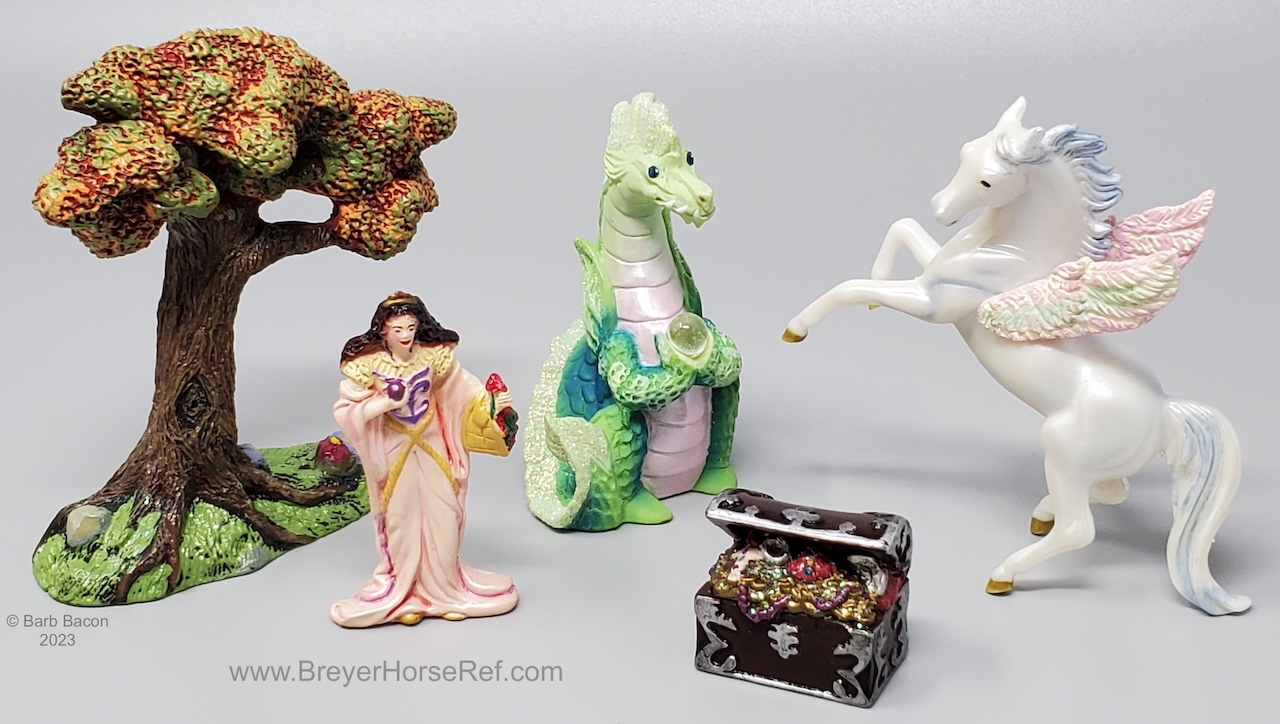 The Fantasy Play Set #5911 was released 2002-2004. It included a princess doll, green dragon with wishing ball, treasure chest, and magical tree. Advertised as new in the 2003 catalog, but boxes are marked with a copyright 2002, so set could have been released late in 2002. Boxes have been packaged with either the dragon in front, or the horse in front. See separate record for more photos of the Dragon.