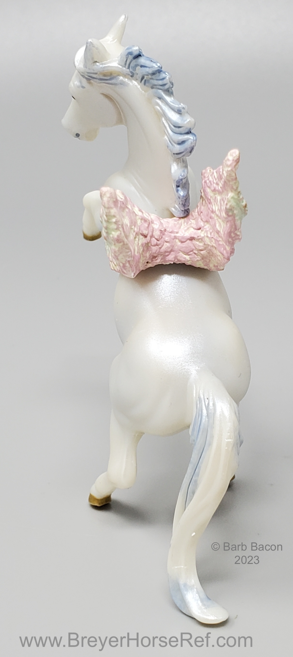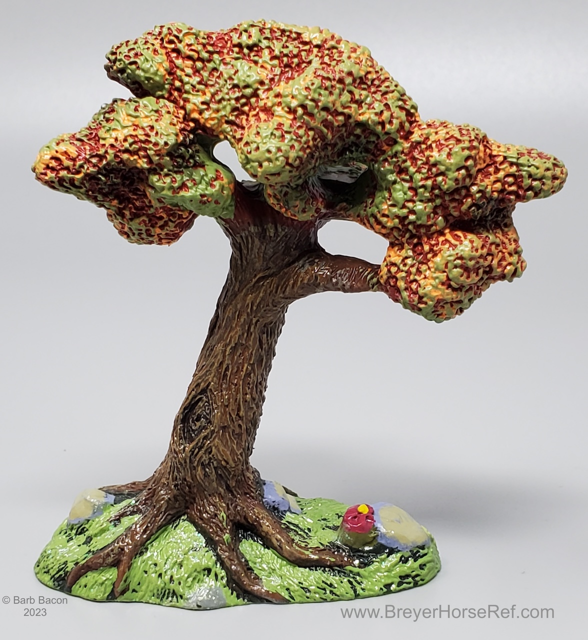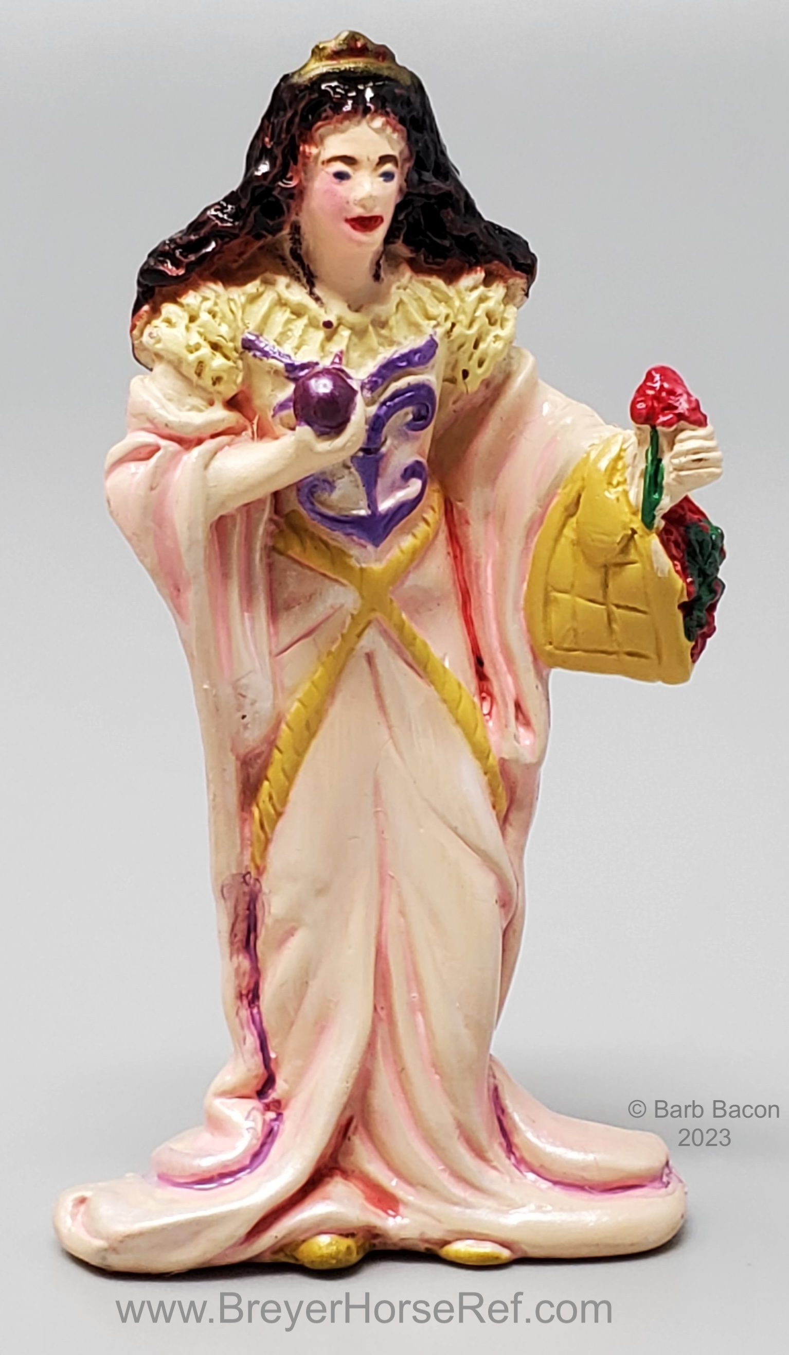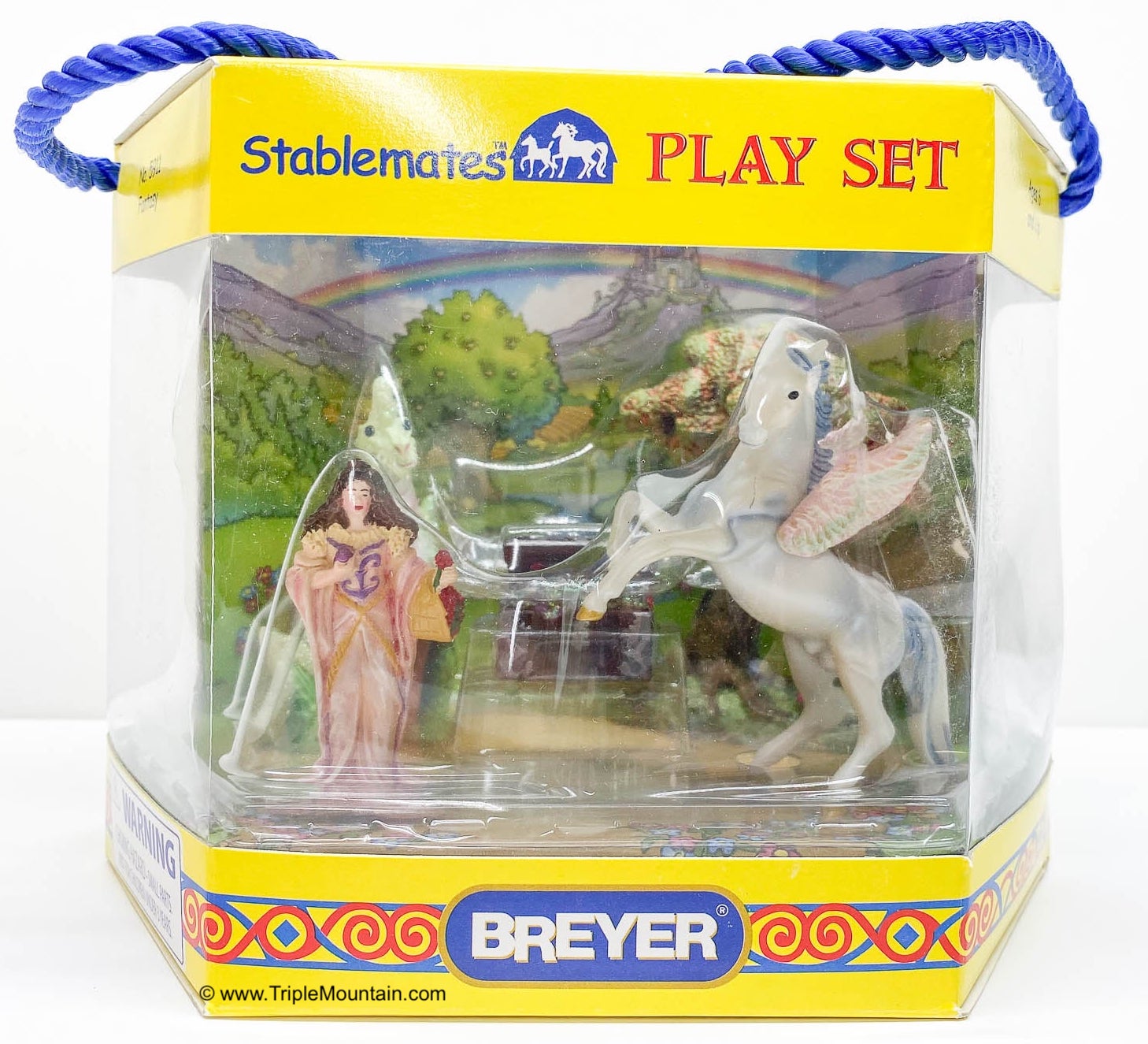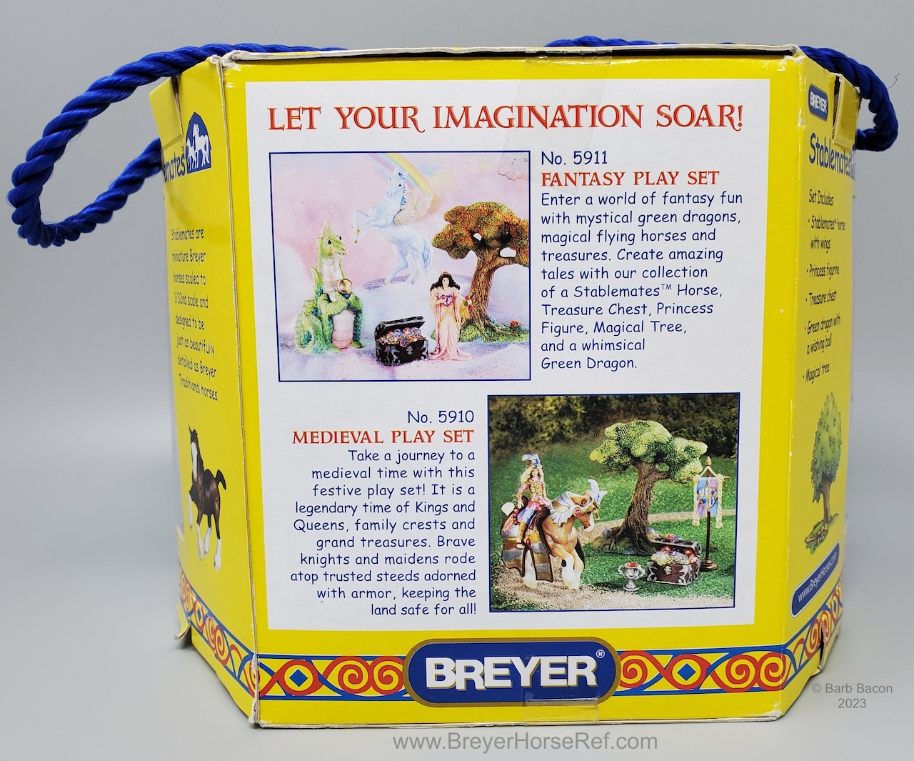 The Fantasy Play Set #5911 was released 2002-2004. It included a princess doll, green dragon with wishing ball, treasure chest, and magical tree. Advertised as new in the 2003 catalog, but boxes are marked with a copyright 2002, so set could have been released late in 2002. Boxes have been packaged with either the dragon in front, or the horse in front. See separate record for more photos of the Dragon.