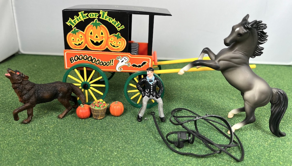 The Haunted Hay Ride set #5916 was released in 2005. It included a grey Rearing Arabian, Wolf, doll, wagon, harness, pumpkins and apples.