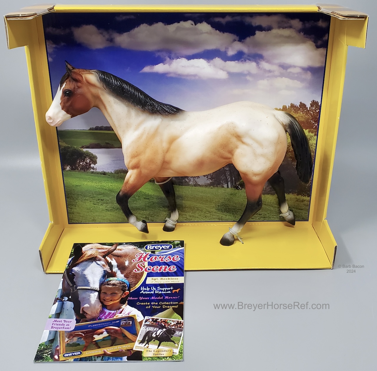 In 2013-2014, this model was released as a Warehouse Model #430003 called Quarter Horse Bay Roan. It is very similar, or a re-release of #1138 from 2001-2002. This model has crisper masking on the face, more blended tail colors, darker or black hooves and a VIN Hoof Stamp. The VIN number and Copyright date on the box is 2013, but model was available for sale in 2014. See separate record for #1138.