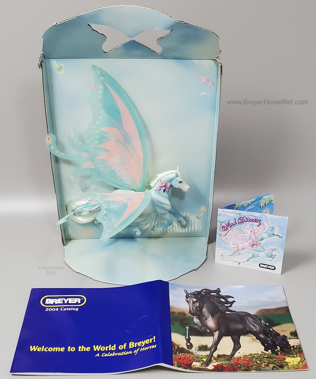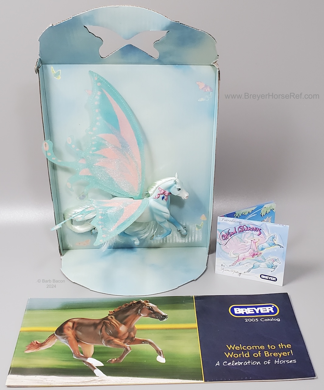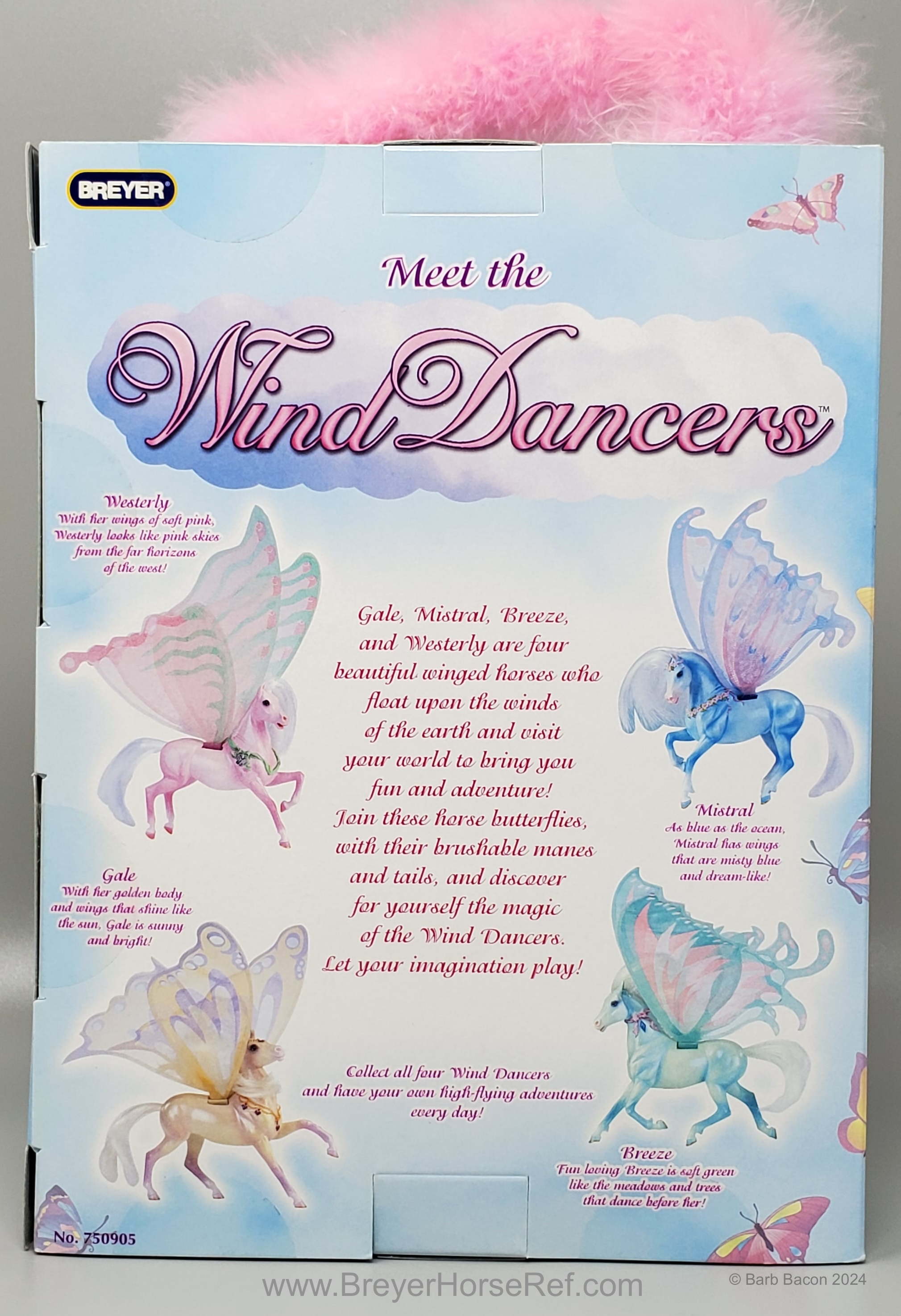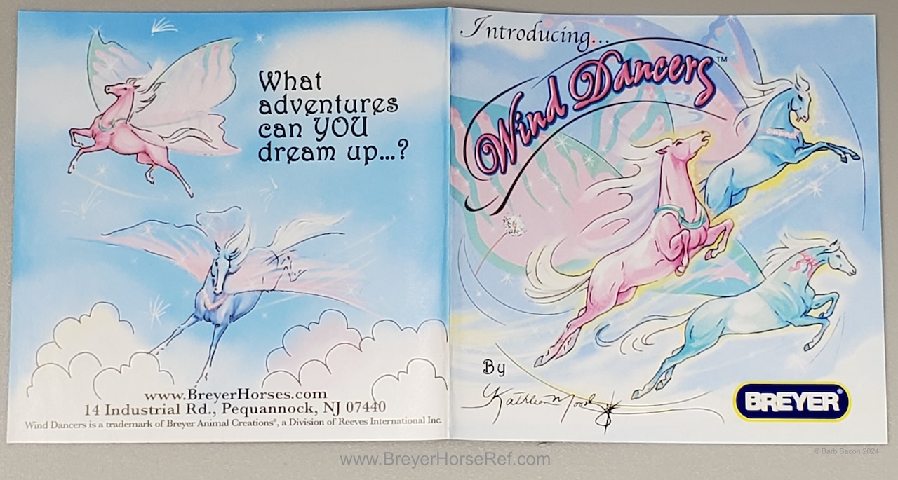 The Wind Dancers models debuted in 2005 by artist Kathleen Moody, and are approximately 4.5"W x3.5"L. They have butterfly wings and represent characters in the Wind Dancers series of books. The original models were Kona, Brisa, Sumatra and Sirocco. However, in 2005, 4 special run models were released through Walmart or similar stores. As described in the 12 page enclosed booklet: