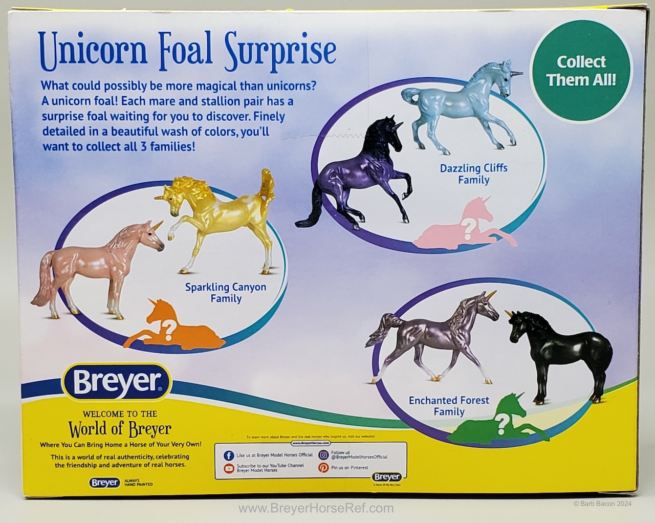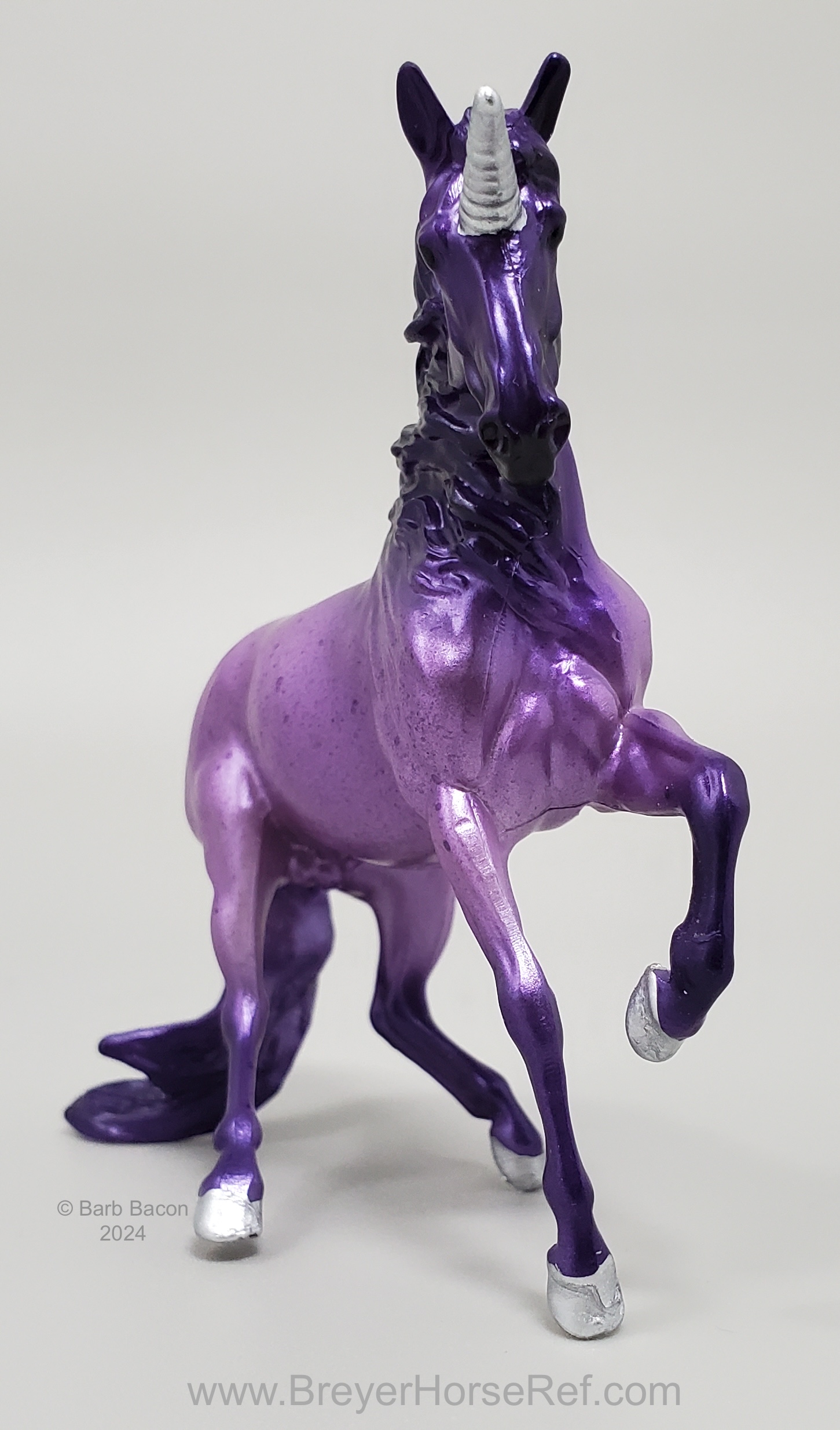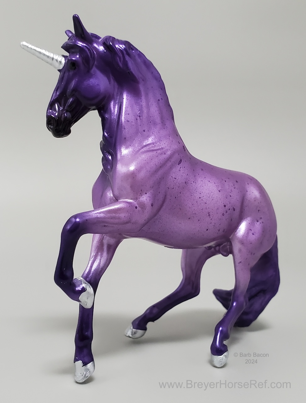 In 2024, released in the Unicorn Foal Surprise Set #B-SM-10073 Dazzling Cliffs Family. Included a Purple Alborozo, Blue Warmblood and a Blue Frisky Foal.