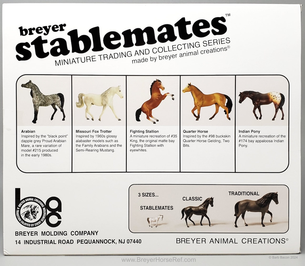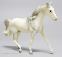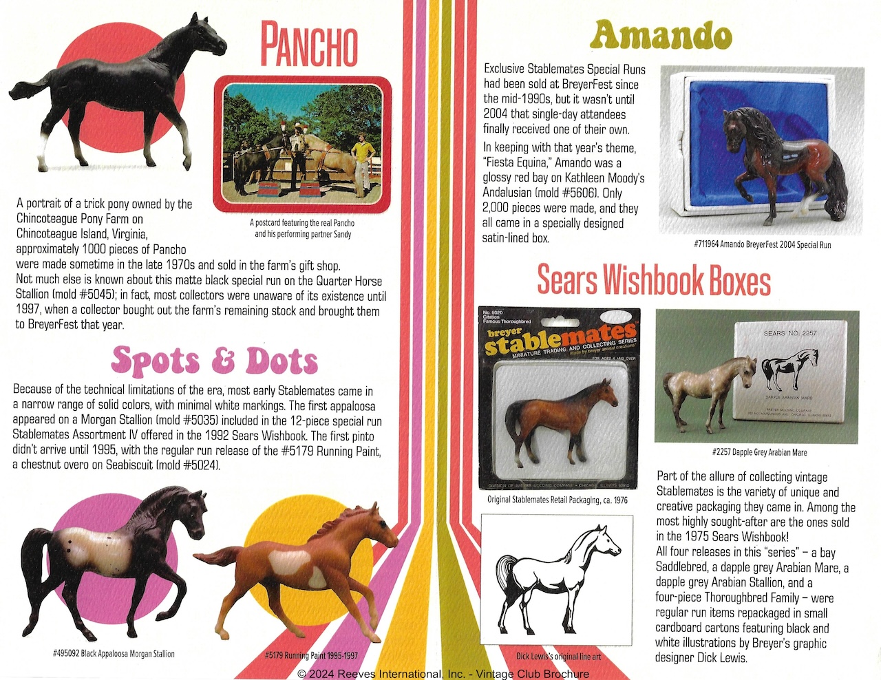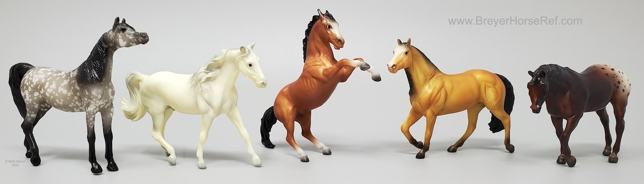 "In 1975, Breyer collectors quickly learned of the addictive power of Stablemates: you couldn’t buy just one! Since miniaturized Traditional molds are now all the rage, what better way to honor the history of Stablemates than with an entire Vintage Club collection – in miniature? Much like their larger Vintage Club counterparts, this five-piece assortment includes some of our newer molds in vintage colors - a glossy alabaster Missouri Fox Trotter, a bald-faced matte buckskin Smart Chic Olena, and a Zafirah in black-pointed dapple grey, along with replicas of beloved vintage treasures like the bay Fighting Stallion and the appaloosa Indian Pony." www.breyerhorses.com.
