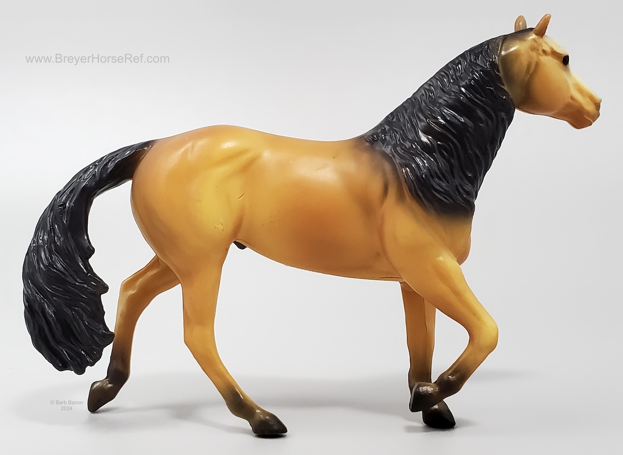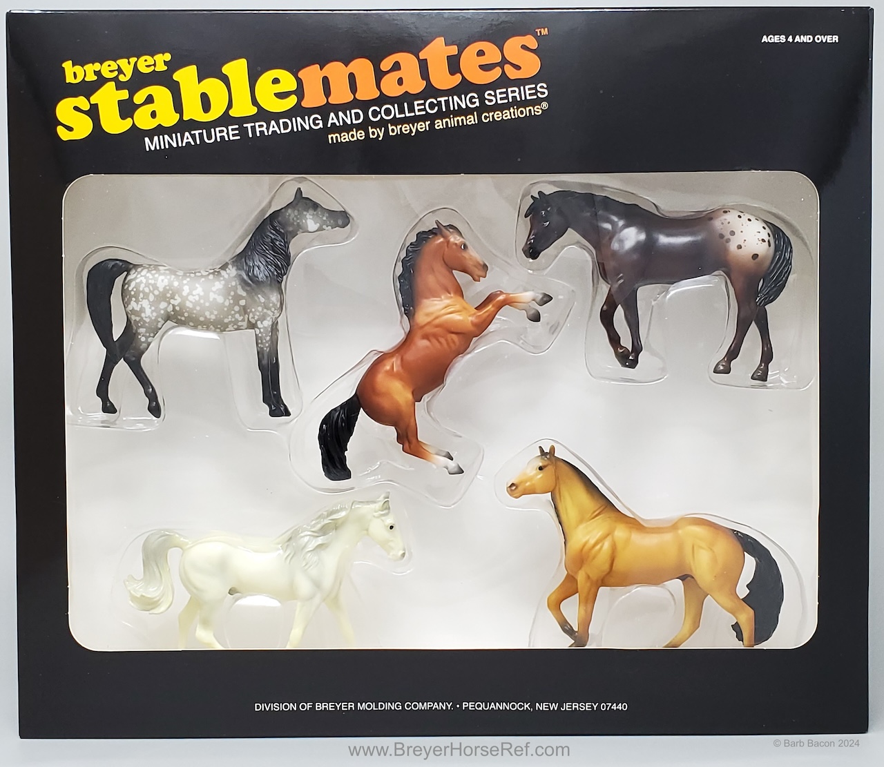 "In 1975, Breyer collectors quickly learned of the addictive power of Stablemates: you couldn’t buy just one! Since miniaturized Traditional molds are now all the rage, what better way to honor the history of Stablemates than with an entire Vintage Club collection – in miniature? Much like their larger Vintage Club counterparts, this five-piece assortment includes some of our newer molds in vintage colors - a glossy alabaster Missouri Fox Trotter, a bald-faced matte buckskin Smart Chic Olena, and a Zafirah in black-pointed dapple grey, along with replicas of beloved vintage treasures like the bay Fighting Stallion and the appaloosa Indian Pony." www.breyerhorses.com.
