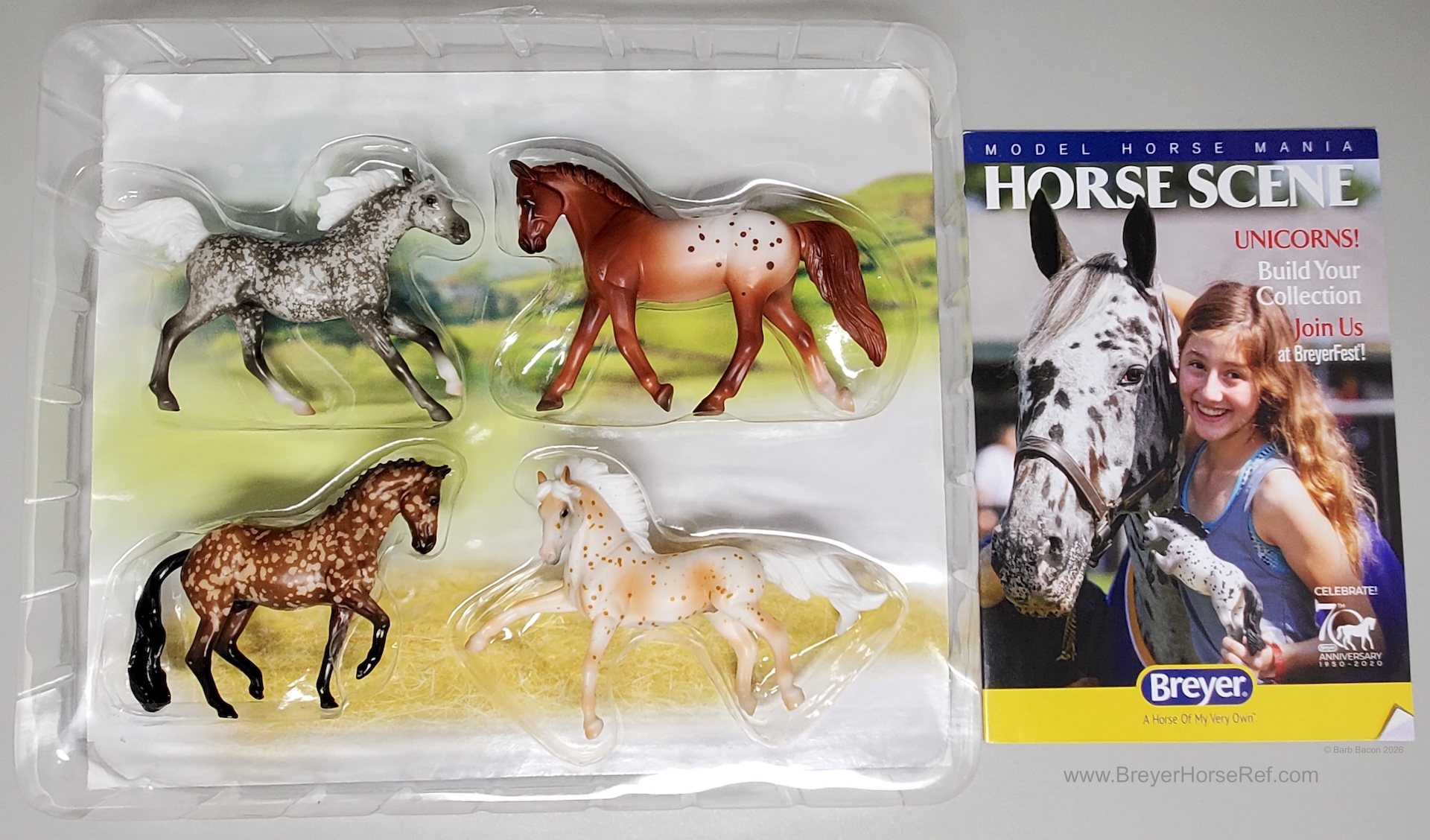 These same models were available 2021-2022 in the Stablemates Wood Shadowbox Barn Display #712353. "Perfect to hang on a bedroom wall or sit on a dresser, Breyer's quality wood display shadowbox fits a whole collection of Stablemates 3" horses! Comes with 4 horses and features two hooks on the back for hanging. Display measures 15.5"H x 14.25"W x 3.75"D." www.breyerhorses.com.