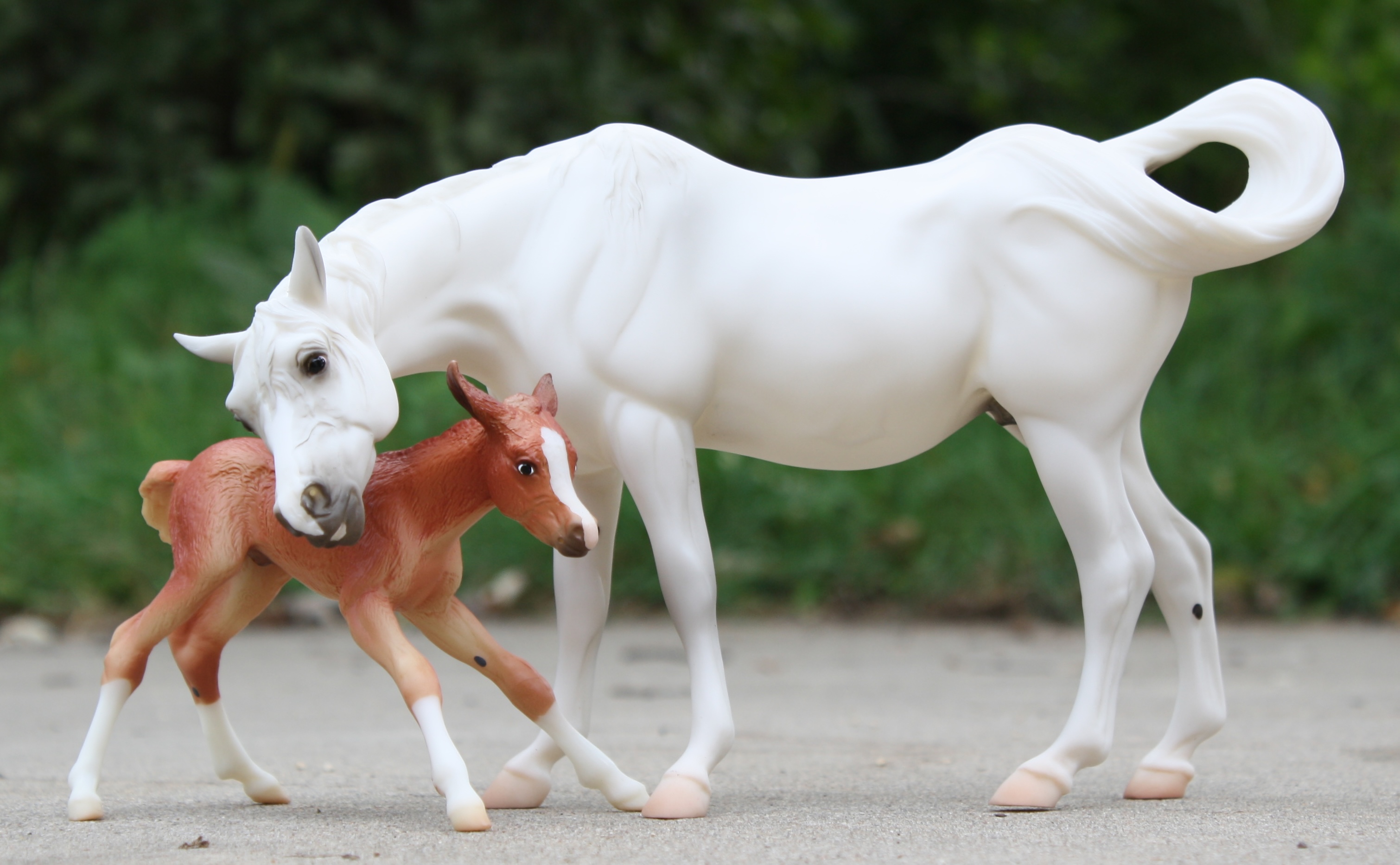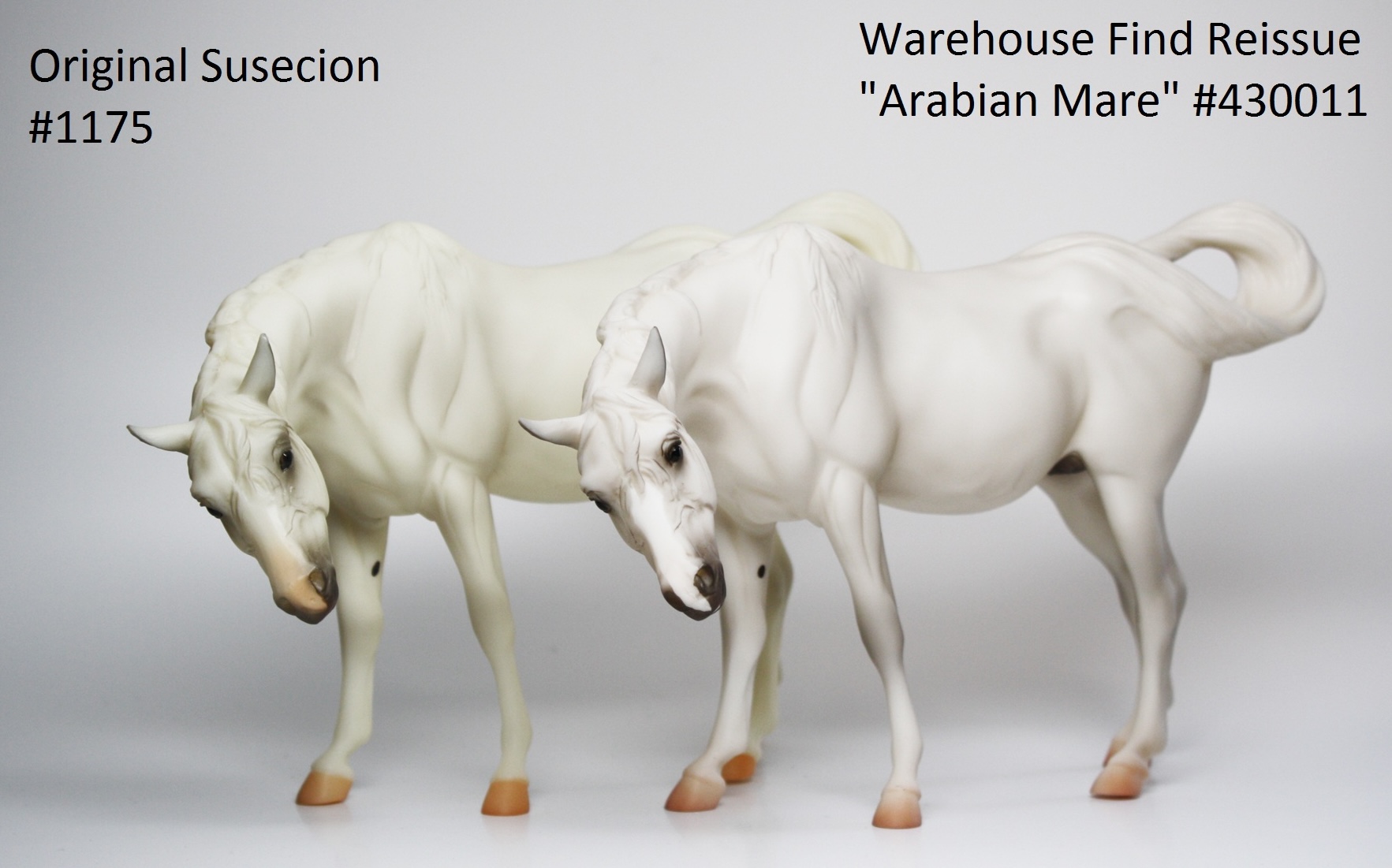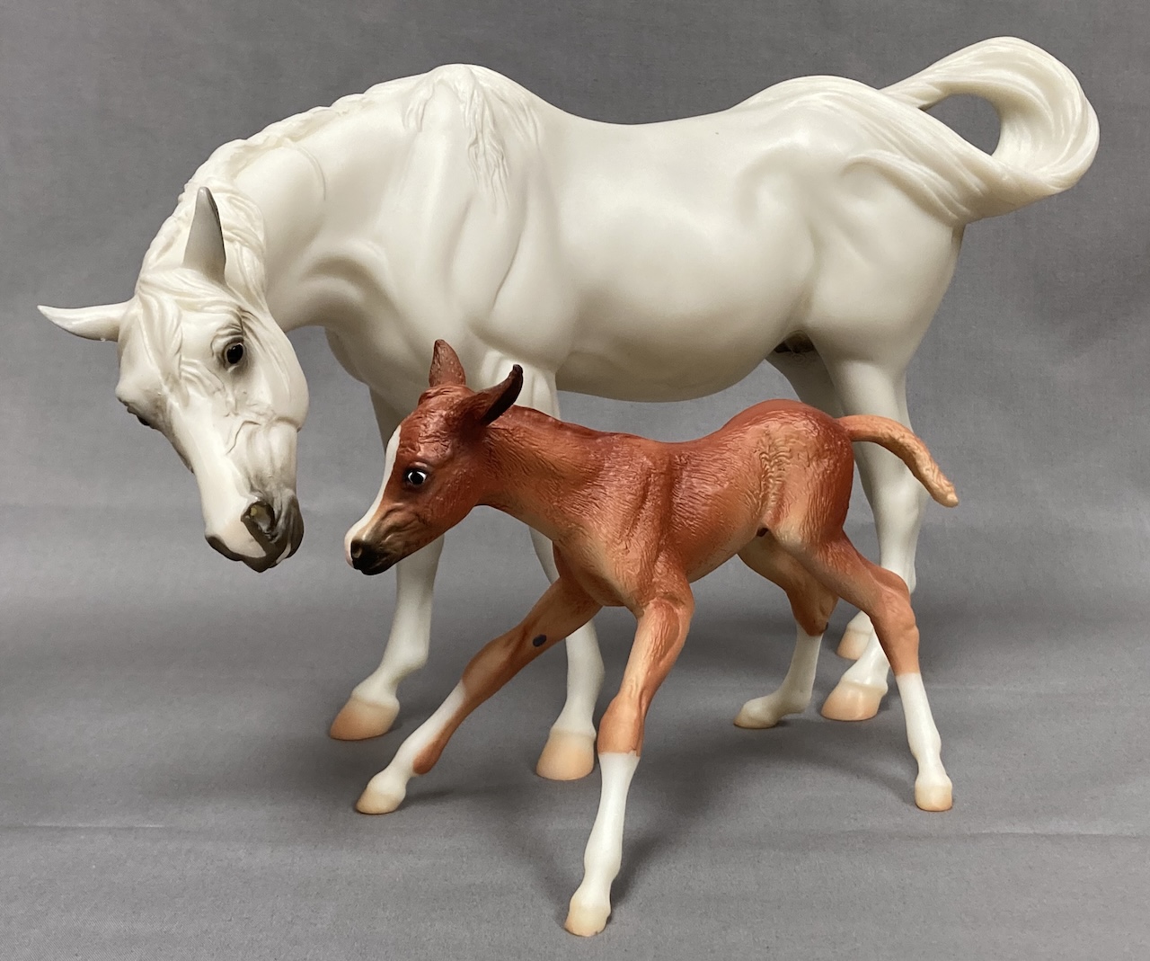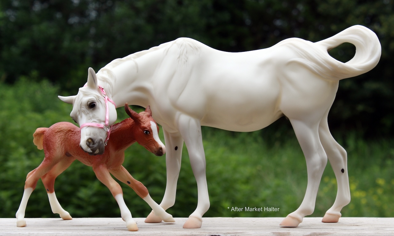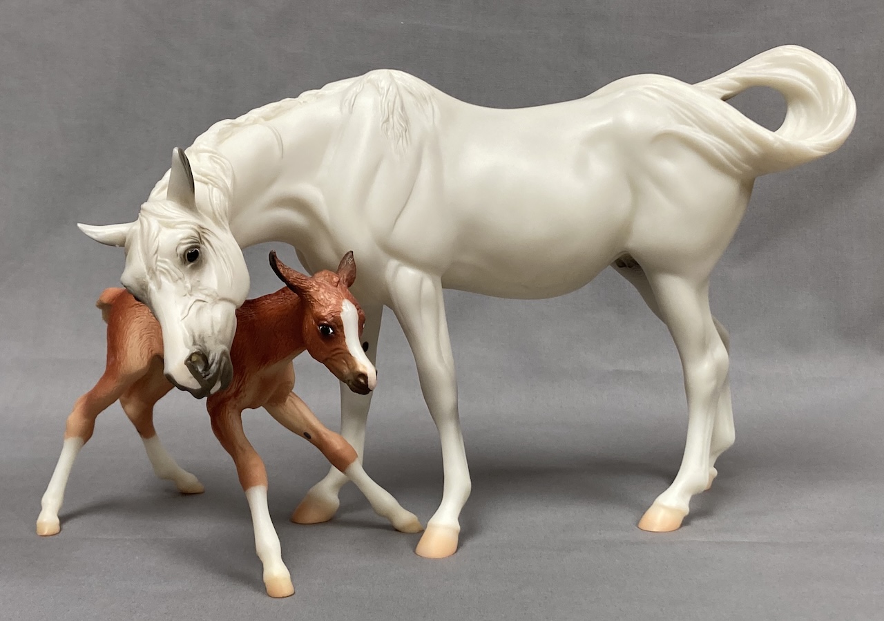 Available as a Warehouse Model in 2014 as #430011. This model has an updated paint job, more crisp markings, a more pronounced blaze, and the mare has a VIN/Hoof Stamp. The pinking on the mare's nose is less pink than the original release, and the foal has less grey shading on the face.
