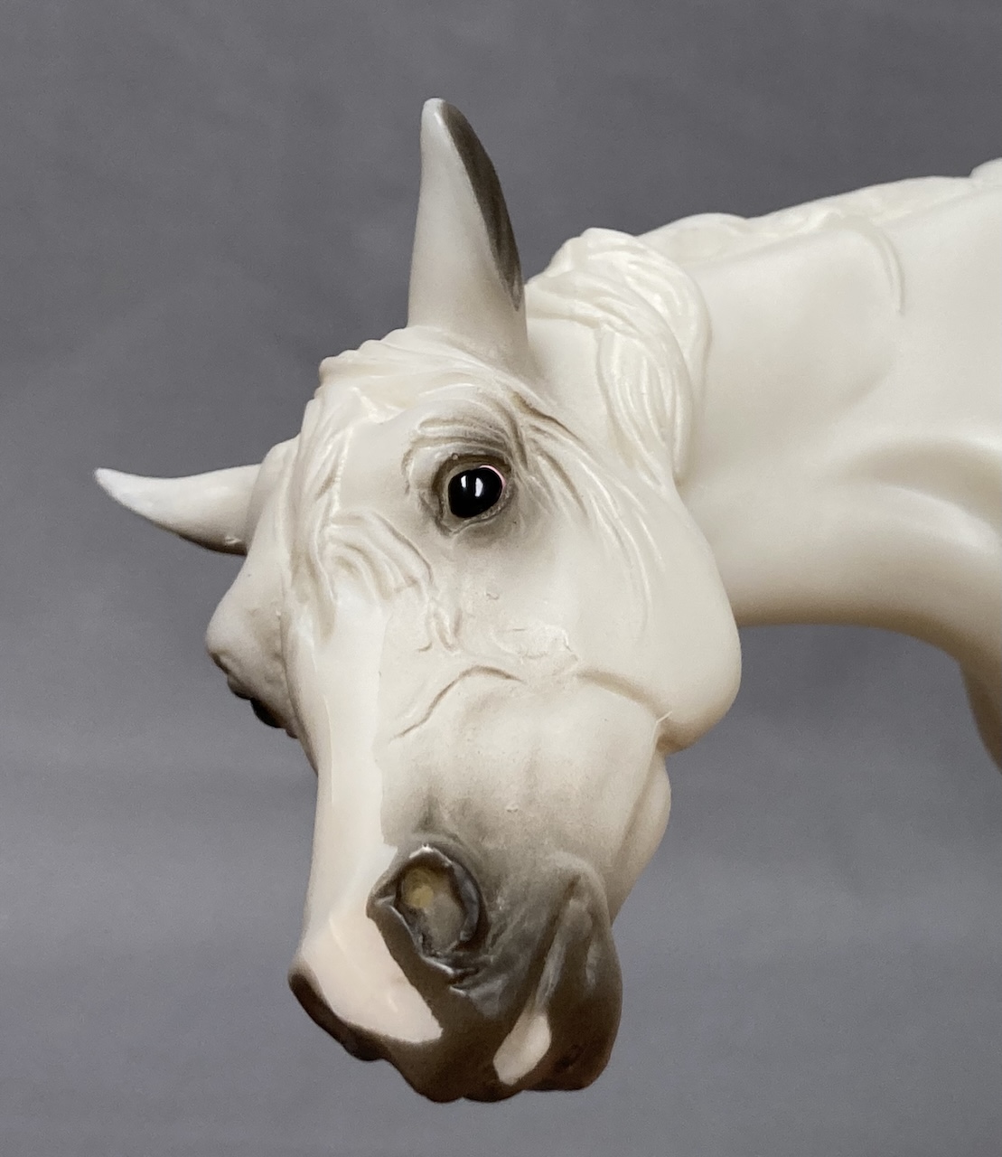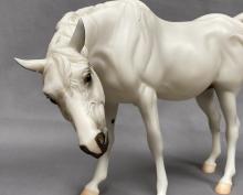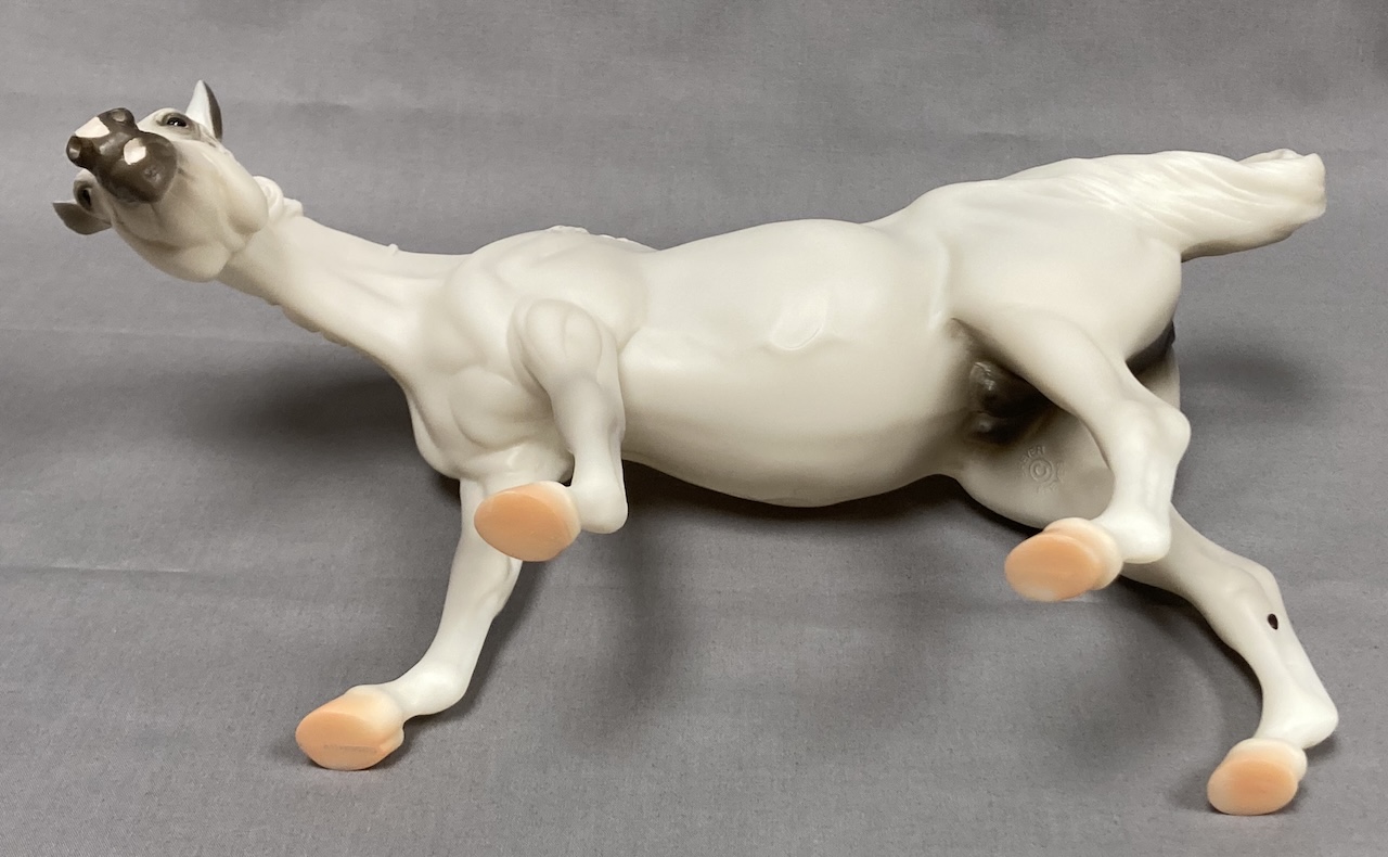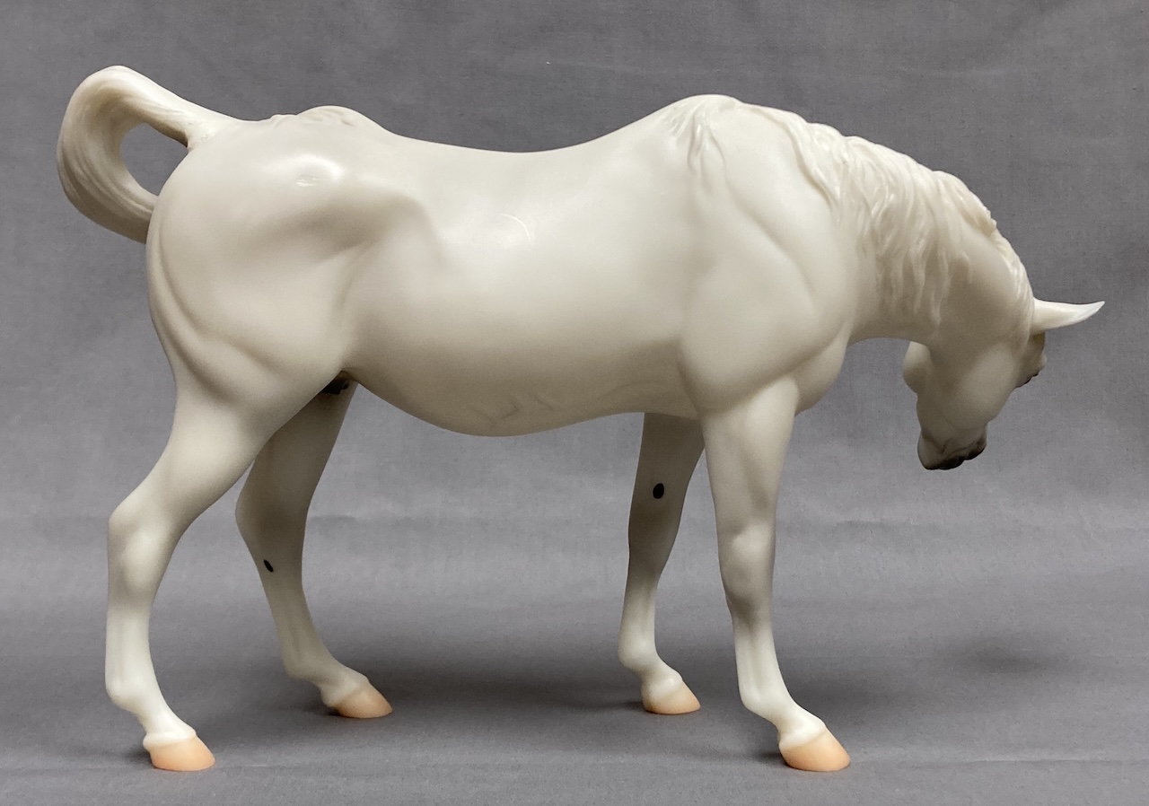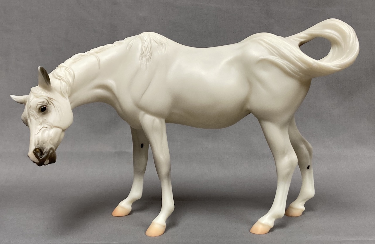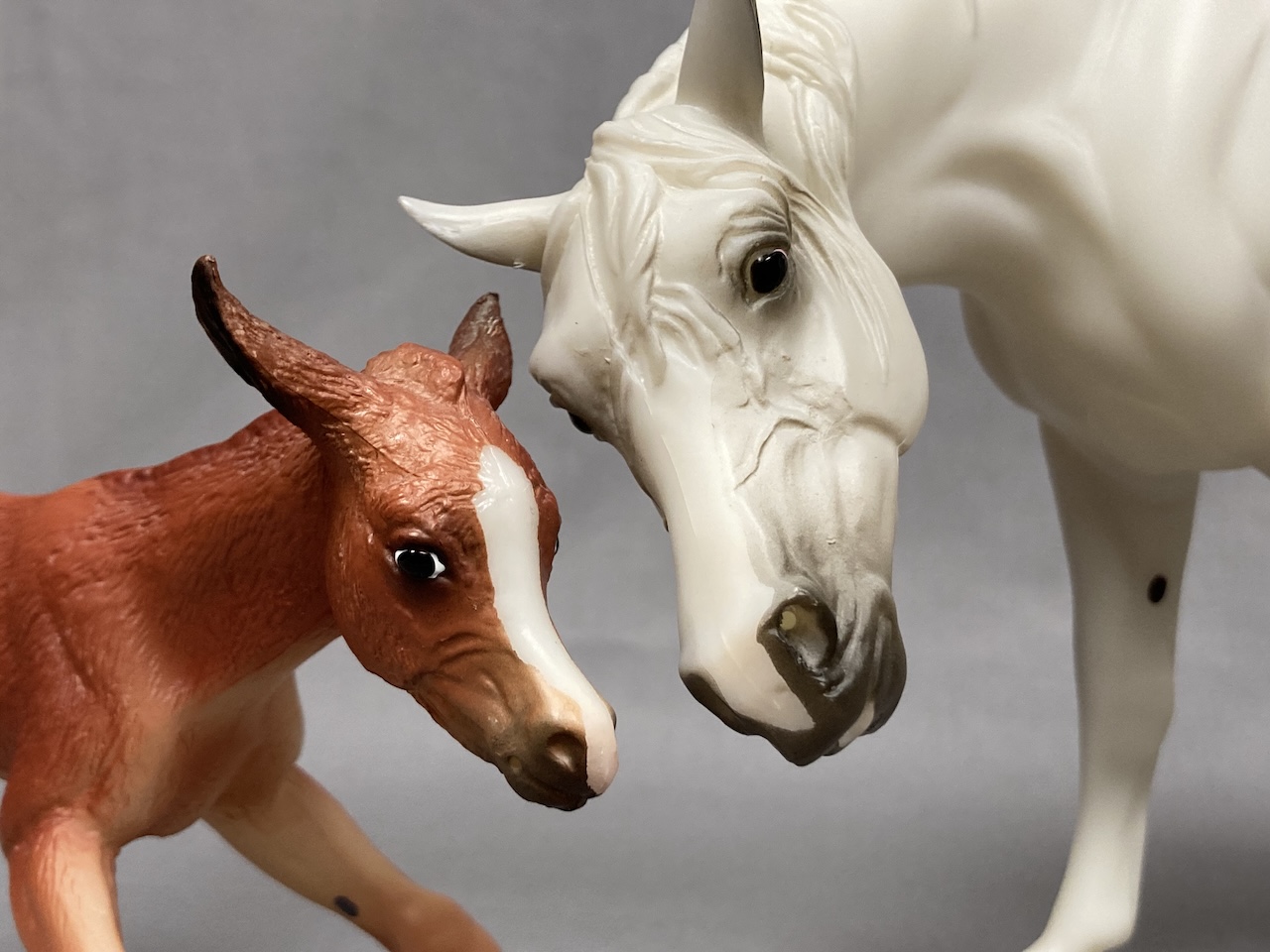 Available as a Warehouse Model in 2014 as #430011. This model has an updated paint job, more crisp markings, a more pronounced blaze, and the mare has a VIN/Hoof Stamp. The pinking on the mare's nose is less pink than the original release, and the foal has less grey shading on the face.