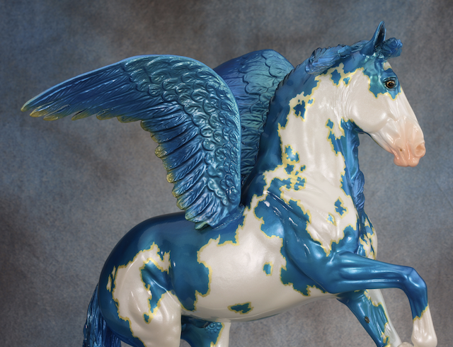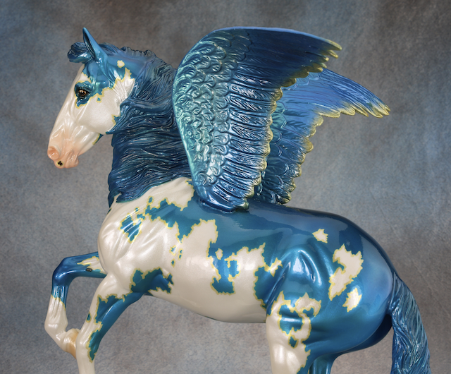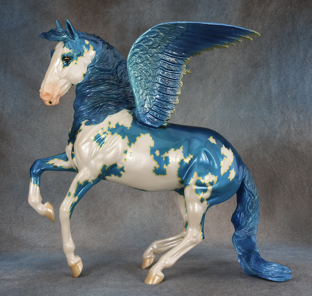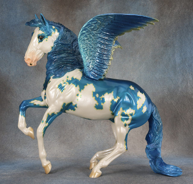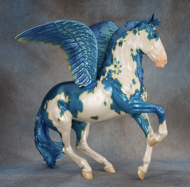 BreyerFest 2025 Auction Model. Alborozo Pegasus, Sacred Kingfisher inspired glossy metallic blue, gold, and pearly white Overo.