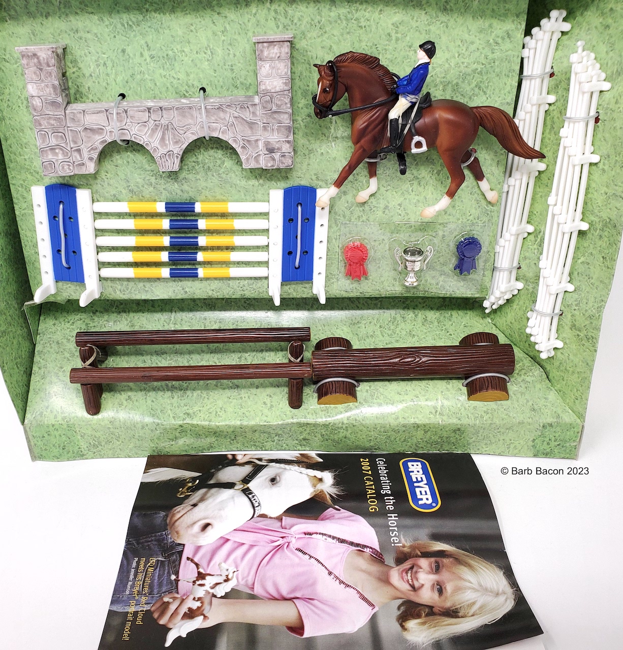 Included Rider Doll, English Tack, Dressage Arena, Cross Country Single Timber Jump, Cross Country Log Jump, Stadium Stone Wall Jump, Stadium Vertical Jump, Trophy and Plastic Ribbons. On the 2009 Retired List.