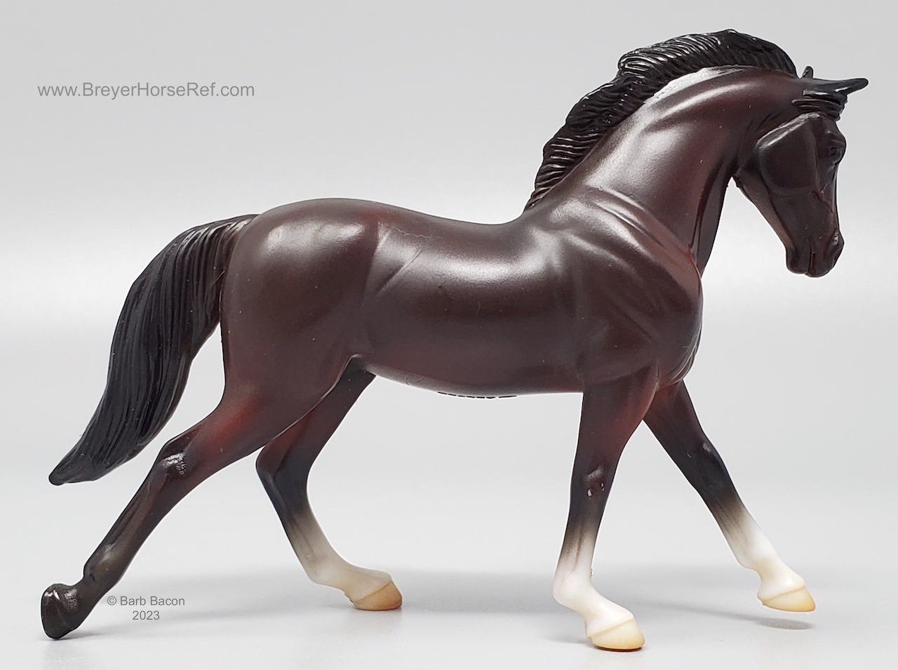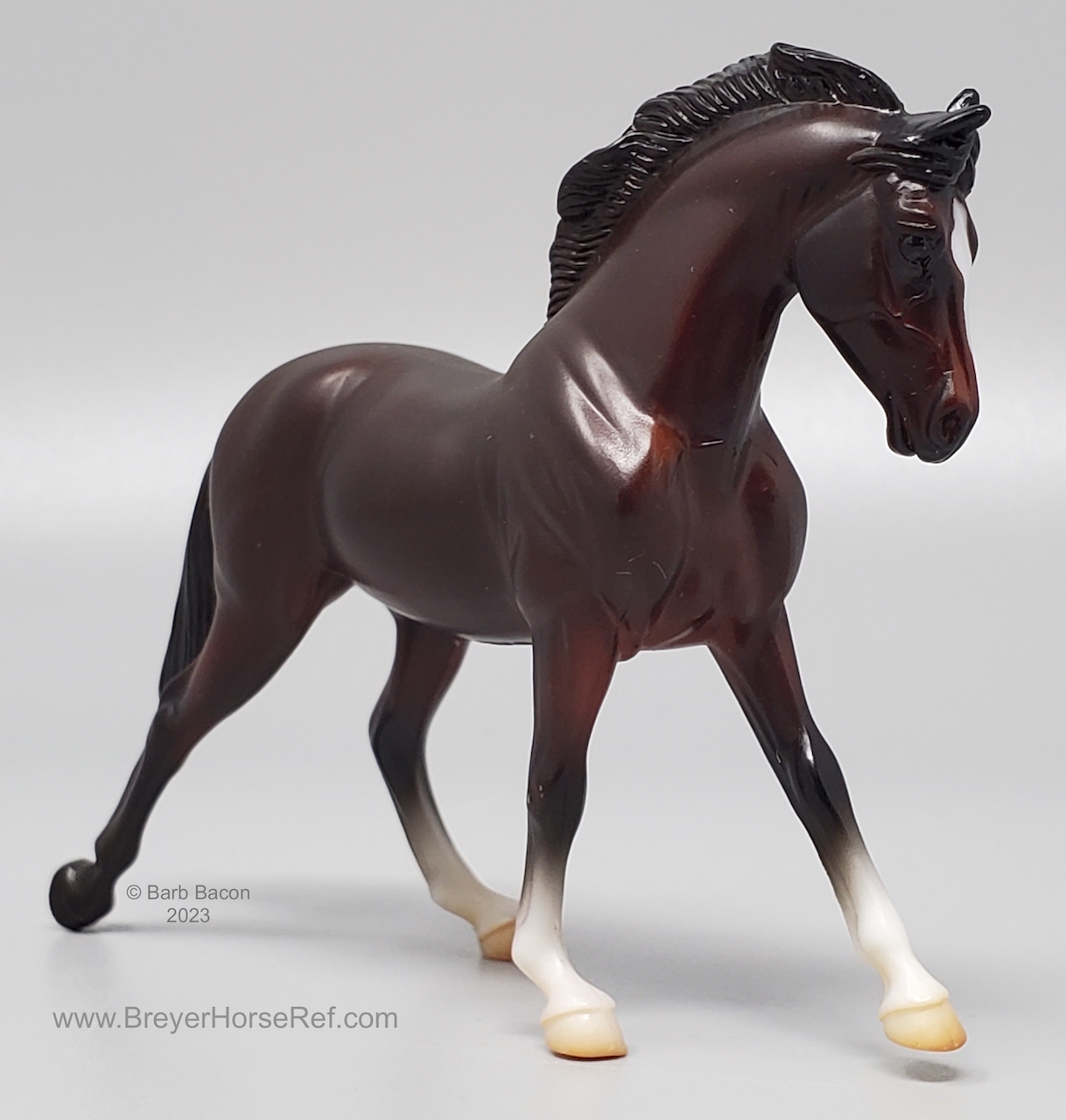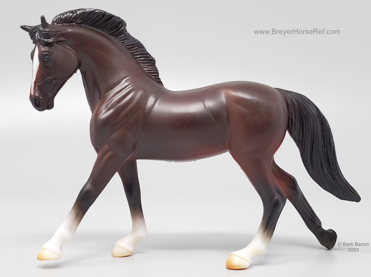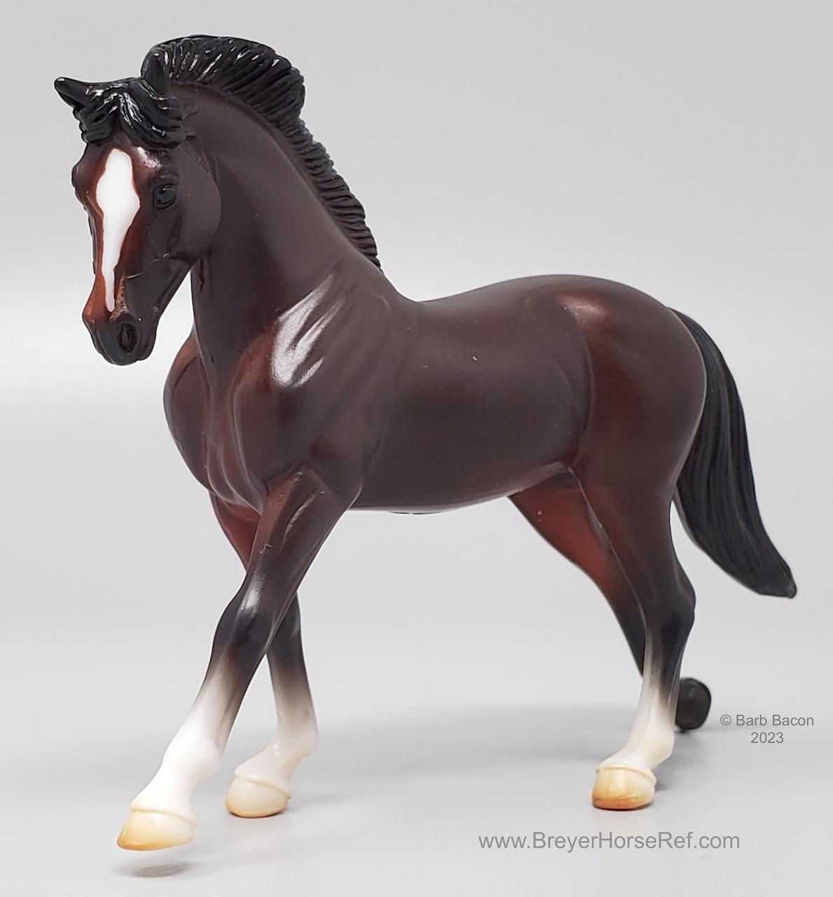 In 2024-2026, this model was released with the Deluxe Arena Stable #59243. This set includes a bay Cantering Warmblood and a Black Pinto Trotting Warmblood. "It features removable two-sided roof panels, working doors and windows, three stalls with food trays, and a horse wash area. The inside of the roof panels are decorated to double as a beautiful grassy play area - just remove them and set them up to create the perfect spot for playing. This set includes two Stablemates horses, a Dutch Warmblood and an Irish Sport Horse, along with cardboard accessories including 12 fence pieces, six jump pieces, and two troughs. There is also a dressage letter sticker sheet, as well as a sticker sheet to personalize the stable." www.breyerhorses.com.
