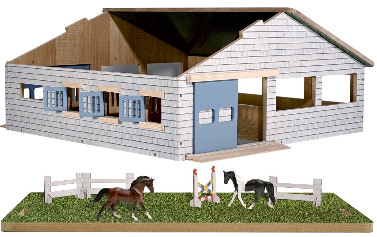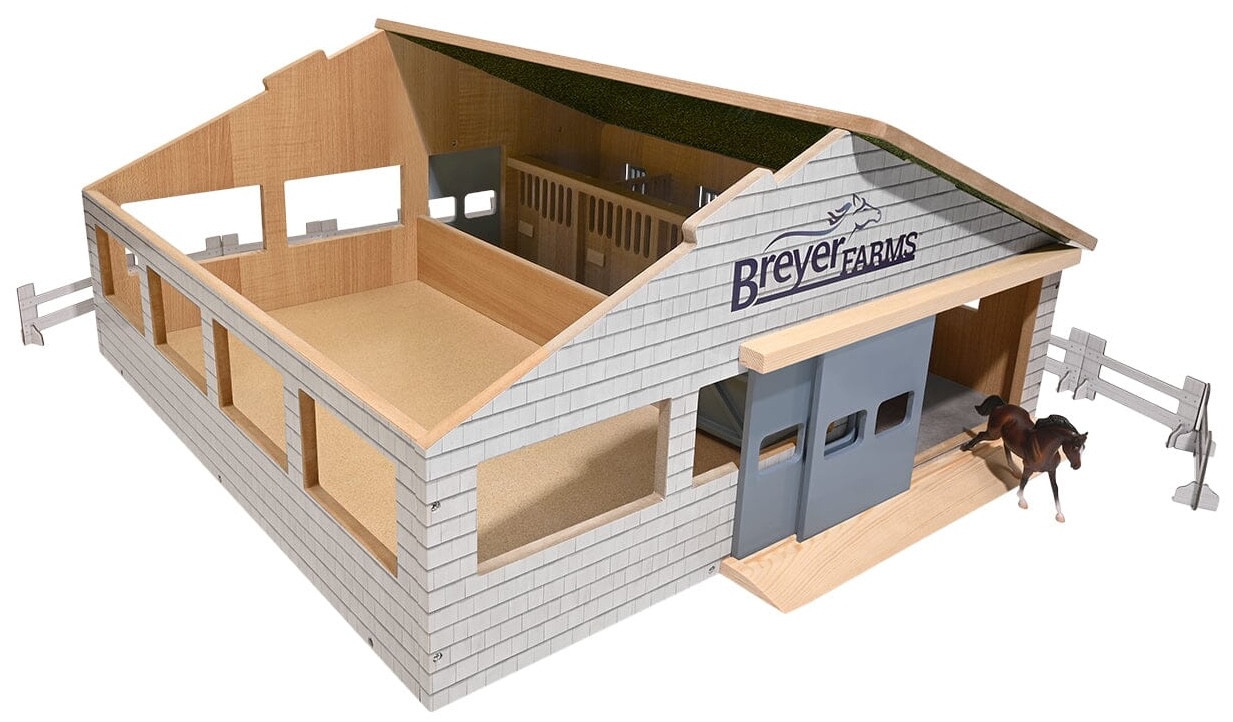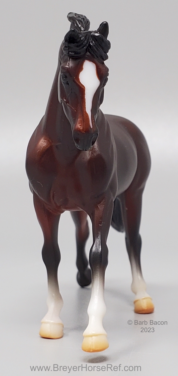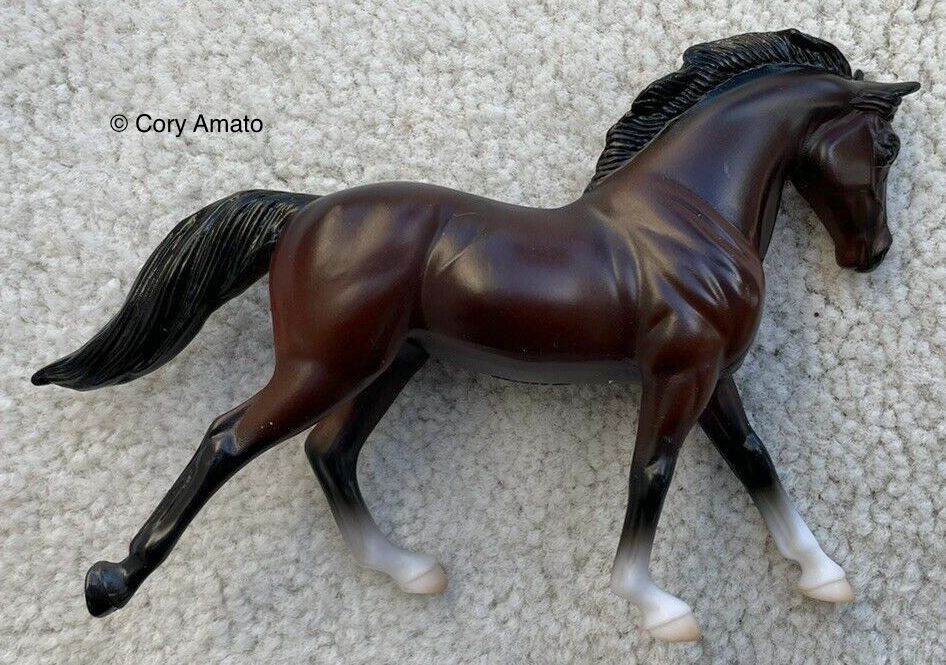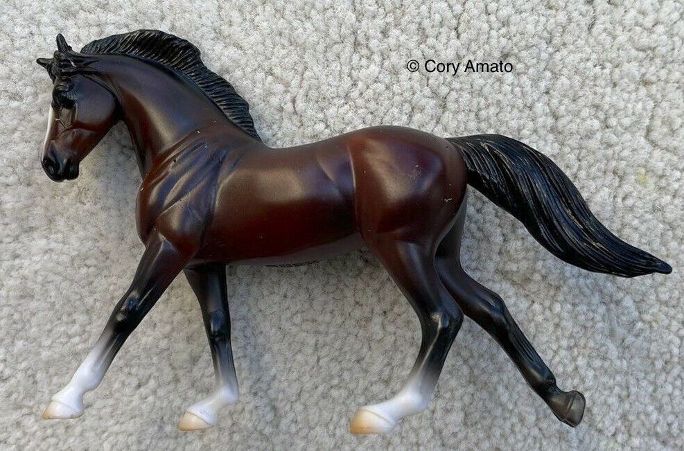 In 2024-2026, this model was released with the Deluxe Arena Stable #59243. This set includes a bay Cantering Warmblood and a Black Pinto Trotting Warmblood. "It features removable two-sided roof panels, working doors and windows, three stalls with food trays, and a horse wash area. The inside of the roof panels are decorated to double as a beautiful grassy play area - just remove them and set them up to create the perfect spot for playing. This set includes two Stablemates horses, a Dutch Warmblood and an Irish Sport Horse, along with cardboard accessories including 12 fence pieces, six jump pieces, and two troughs. There is also a dressage letter sticker sheet, as well as a sticker sheet to personalize the stable." www.breyerhorses.com.