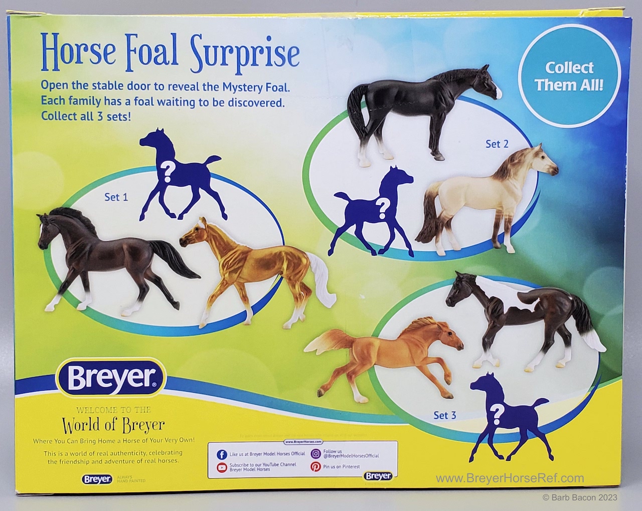 Set #6227 included a bay Cantering Warmblood, a golden palomino Walking TB and a bay Scrambling Foal. #6222 is the assortment number for three different family sets. Packaging refers to this set as 'Horse Foal Surprise Set #1', the Breyer website refers to this set as 'Horse Foal Surprise Family 13', and the 2023 Dealer Catalog refers to this set as the 'Sunshine Meadow Family'. On the 2023 Retired List.