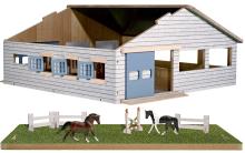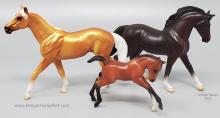 "Open the door to reveal the mystery foal surprise! This three piece Stablemates set comes with a stallion, mare, and a mystery foal, whose color is a surprise! This set features a Palomino Thoroughbred and a Bay Warmblood, and their foal remains hidden in its stall until you open the package! A fun visual lesson in horse genetics; the foal's coat color and pattern will be based upon the coat color and patterns of its parents." www.breyerhorses.com.
