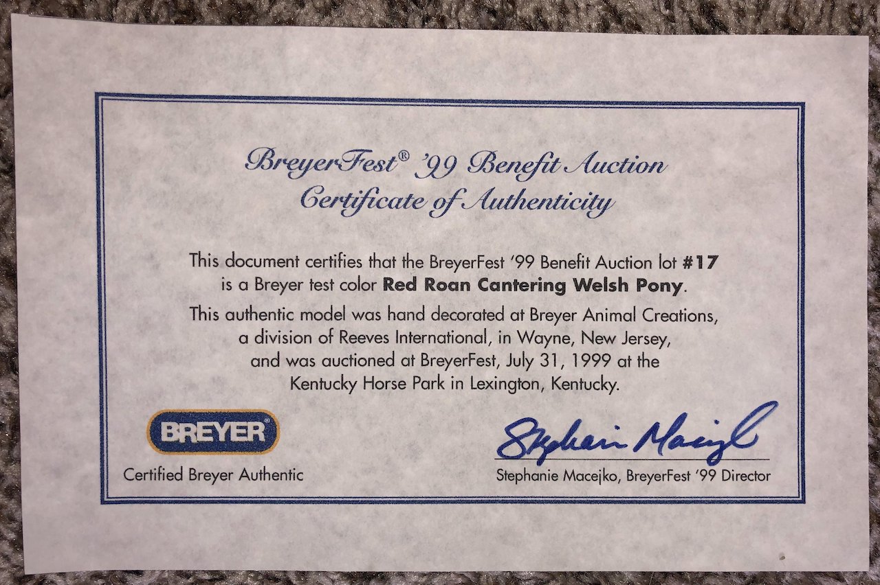 BreyerFest 1999 Benefit Auction models came with a COA signed by Stephanie Macejko.