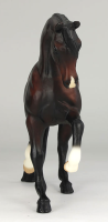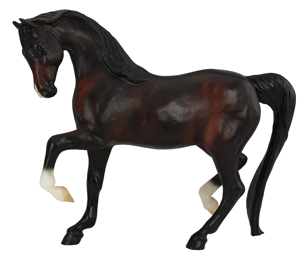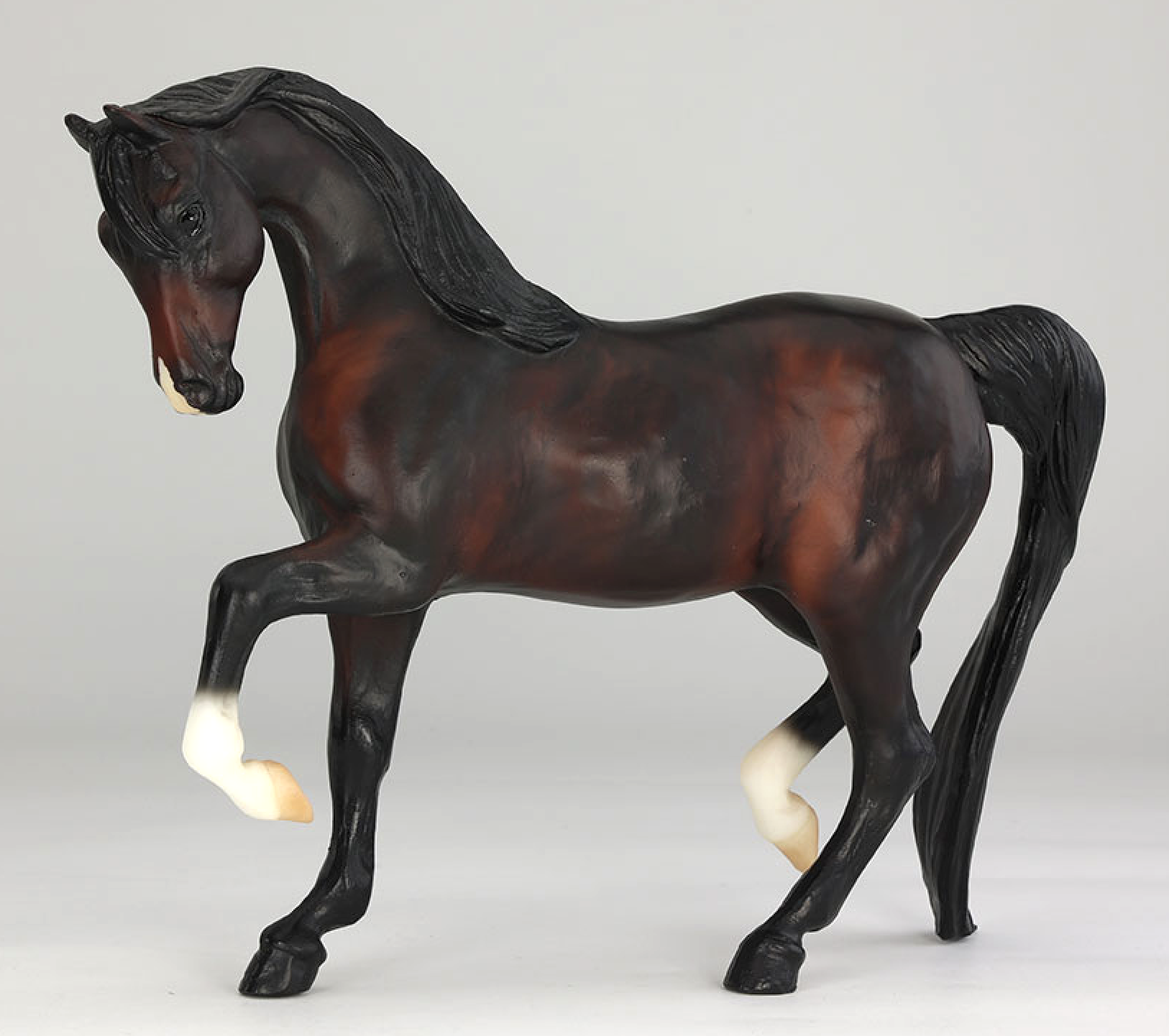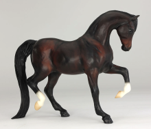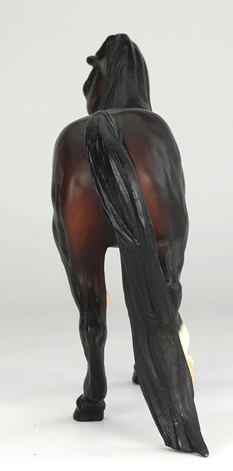 "Bay Lady Roxanna Test Run. Breyer test run models are created to see how a particular color might look on a particular sculpture, or they may be created to test out a painting technique or new colorway. Not all test run models become a final product in the Breyer lineup, and they may vary over time as different painting techniques are developed and tested. Each model has a fixed price and interested members enter a random draw for the ability to purchase the test piece. Sculpted by Rich Rudish as a companion to his fan-favorite Sham, Lady Roxanna (mold #425) is a bit of an unsung hero in Breyer’s Arabian horse lineup. Using her tail as a third point of balance – quite the technical innovation for her time – she prances along the shelf with plenty of personality. Over the years she has seen only a handful of releases, and usually in lighter colors, making this richly-shaded dark bay all the more striking. She has two socks painted freehand along with a masked snip on her muzzle. This piece likely dates to the early 2000s based on the painting technique.