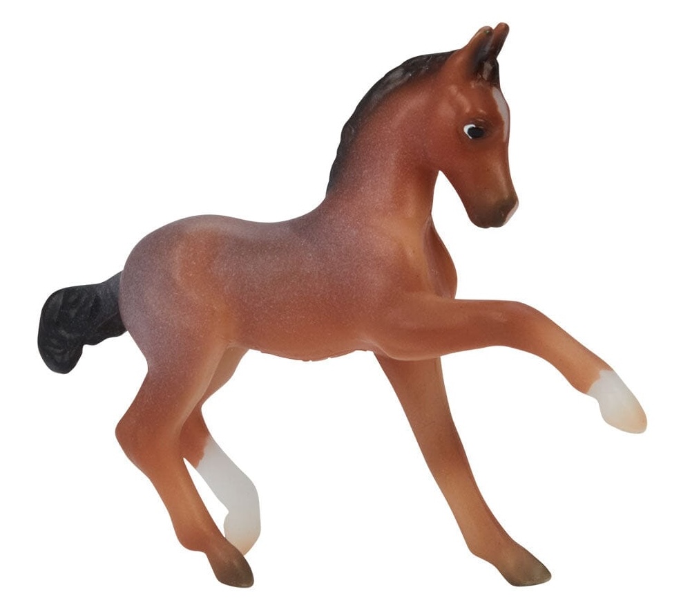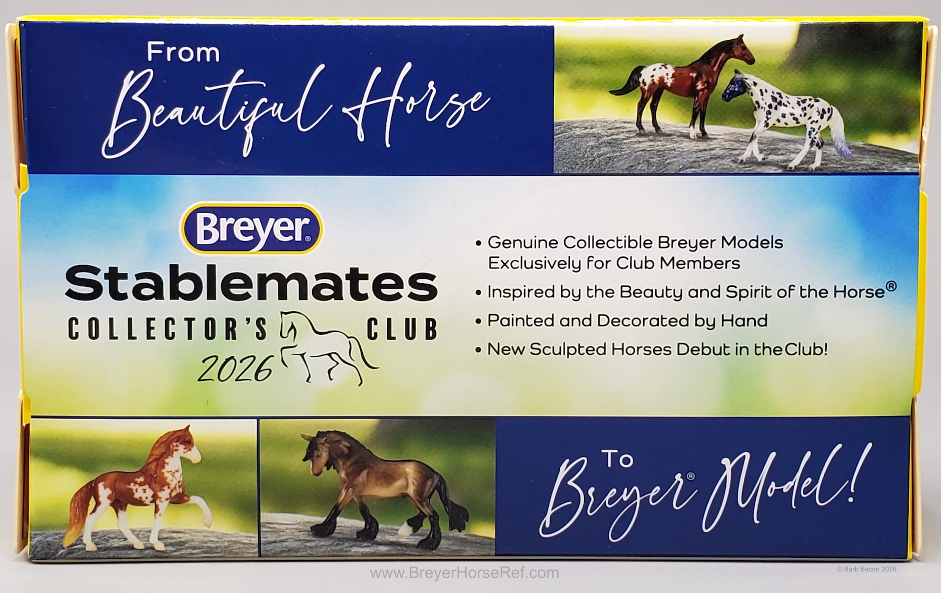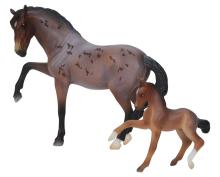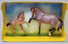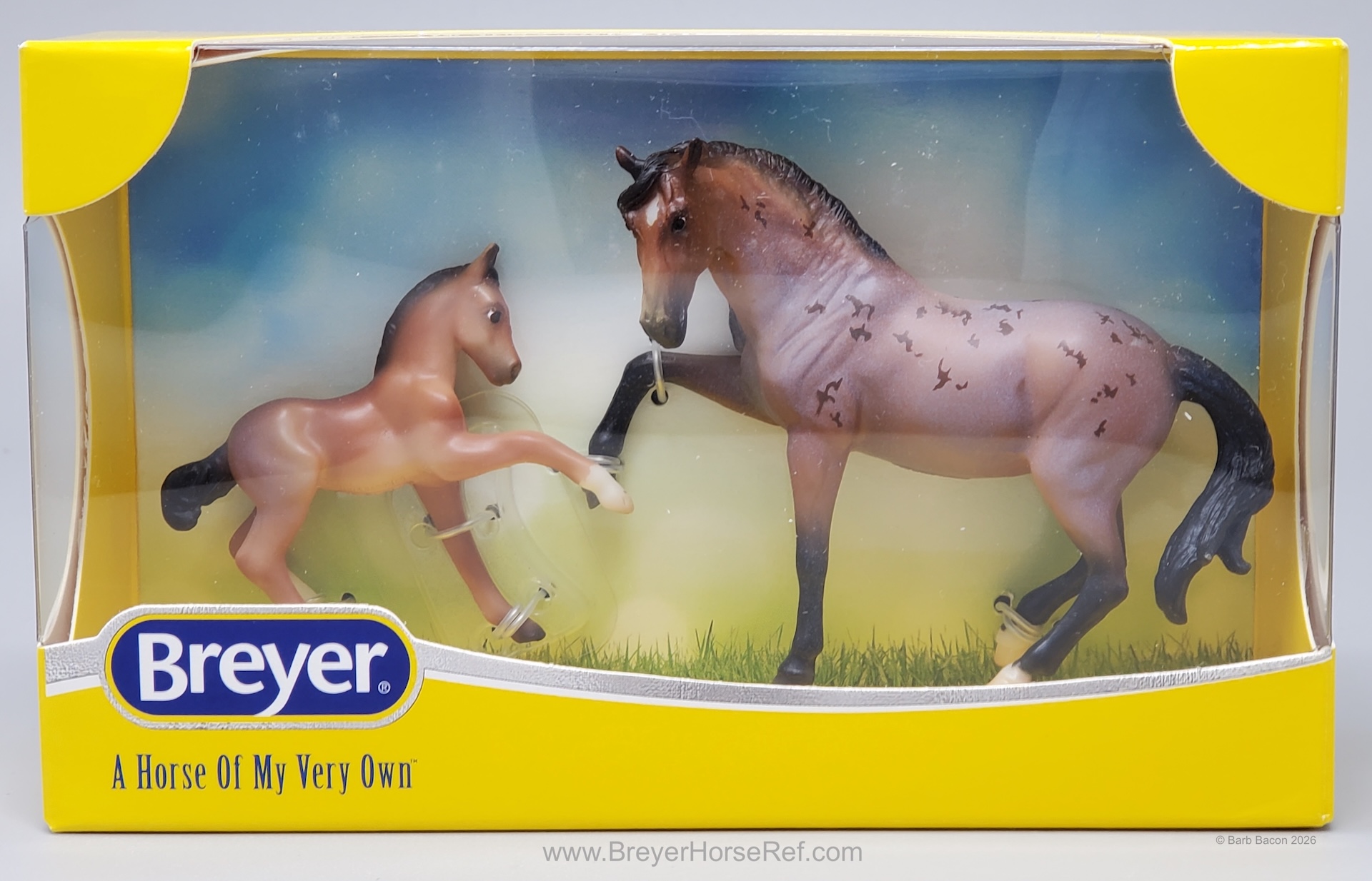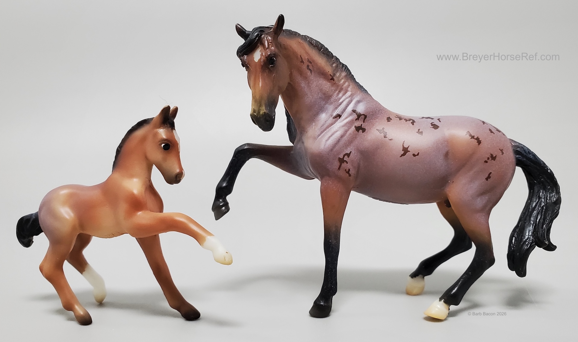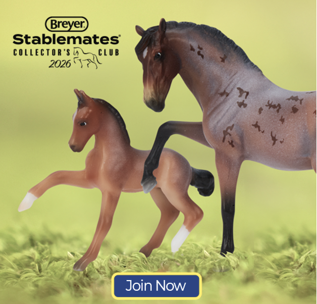 "A delightful pair of Mustangs is joining the 2026 Stablemates Club lineup! Bay roan stallion Arroyo is father to frisky filly Baja, who perfectly emulates her sire's personality. Arroyo's detailed coat includes dark "battle scar" markings from a lifetime of defending his herd, and Baja is painted as an accurate "baby" bay roan." www.breyerhorses.com.