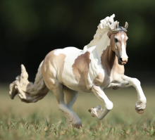 "Our 2026 Premier lineup will include Georgina, an aptly-named Georgian Grande mare. Georgian Grandes are graceful, athletic and powerful horses. The breed has been developed by crossing American Saddlebreds with a variety of draft breeds, along with the Friesian. Georgina sports the body type of the latter, while her pinto coloring is indebted to her Saddlebred side. This gorgeous chestnut pangare tobiano coat was designed by finish work artist and BreyerFest Best Customs Contest winner Morriah Voogd as her first project for Breyer!" www.breyerhorses.com.