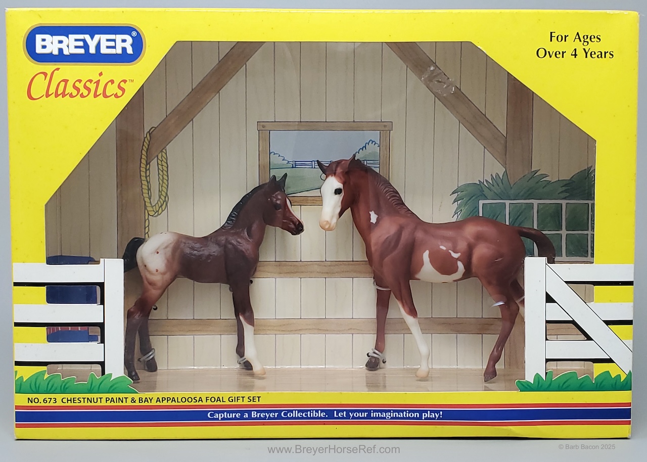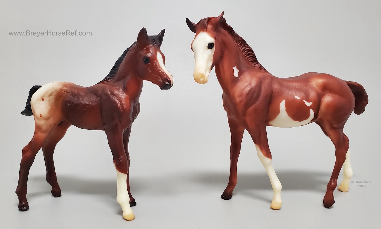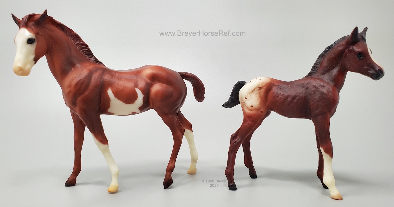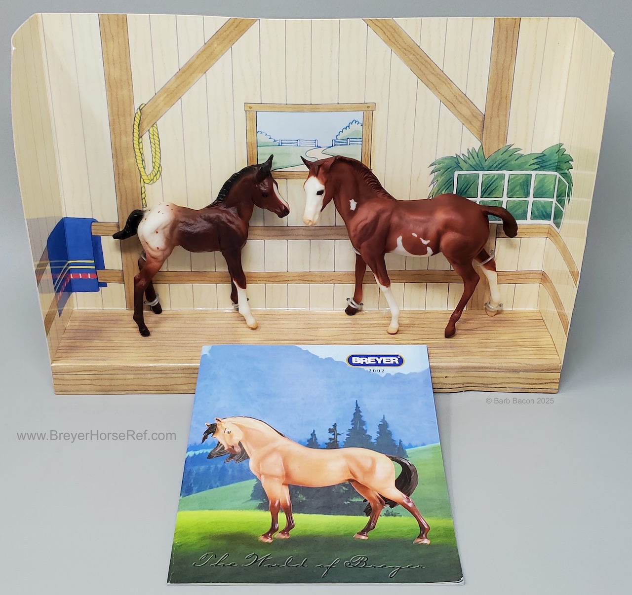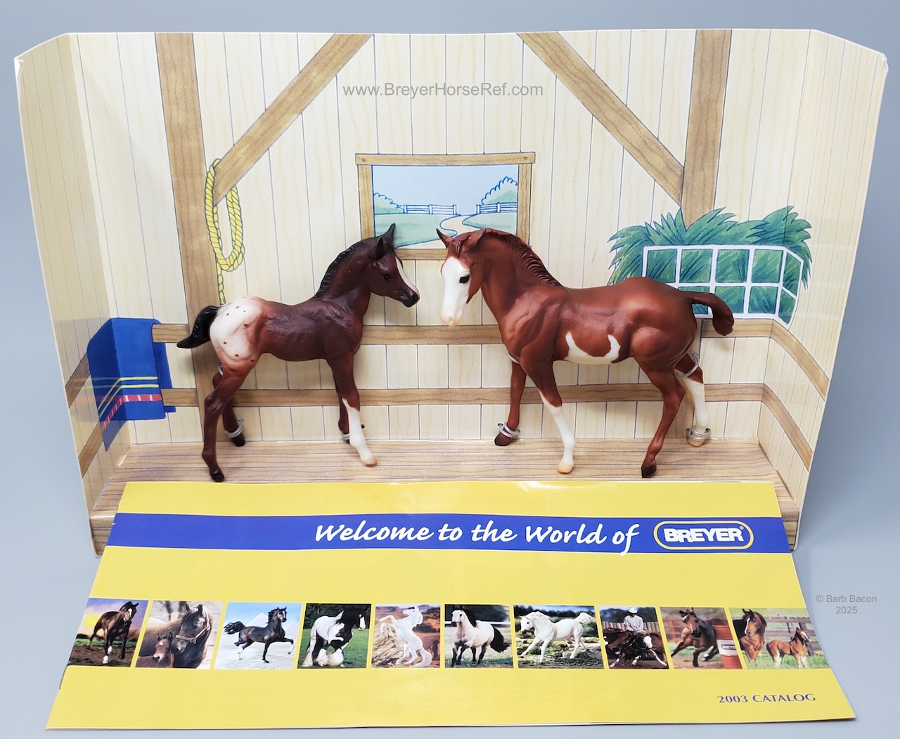 This set included a chestnut pinto Quarter Horse foal and bay blanket appaloosa Mustang foal. On the 2004 Retired List.