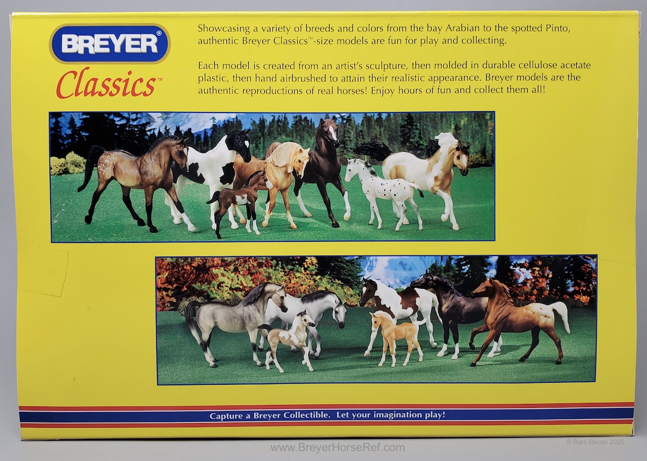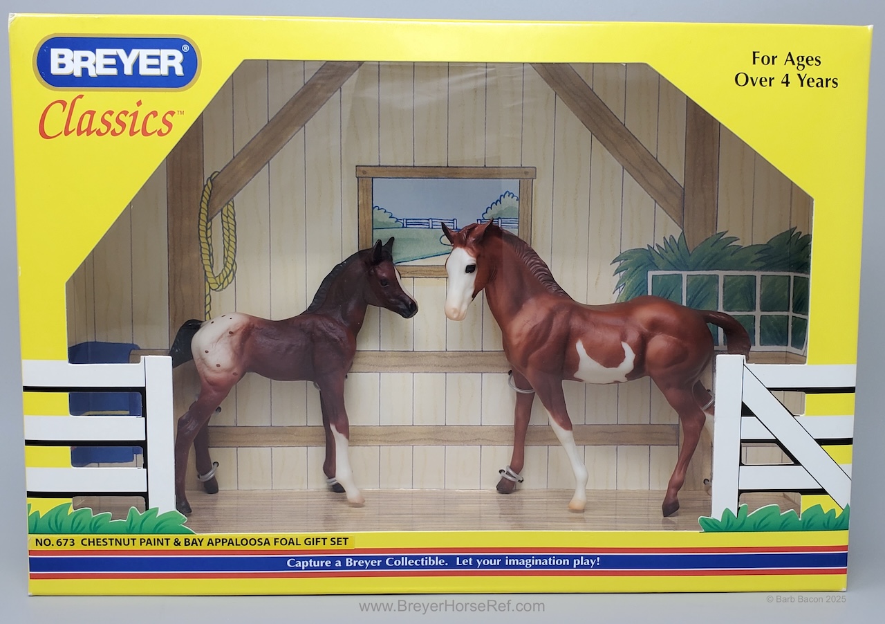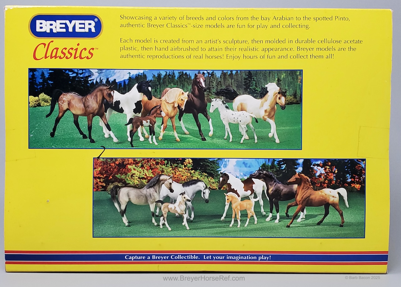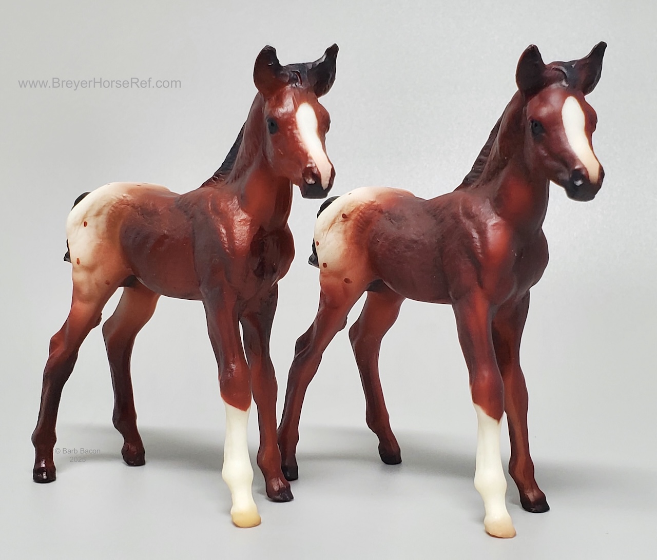 This set included a chestnut pinto Quarter Horse foal and bay blanket appaloosa Mustang foal. On the 2004 Retired List.