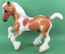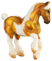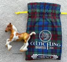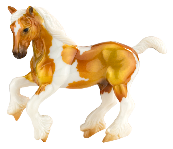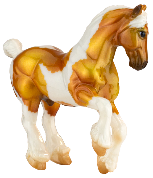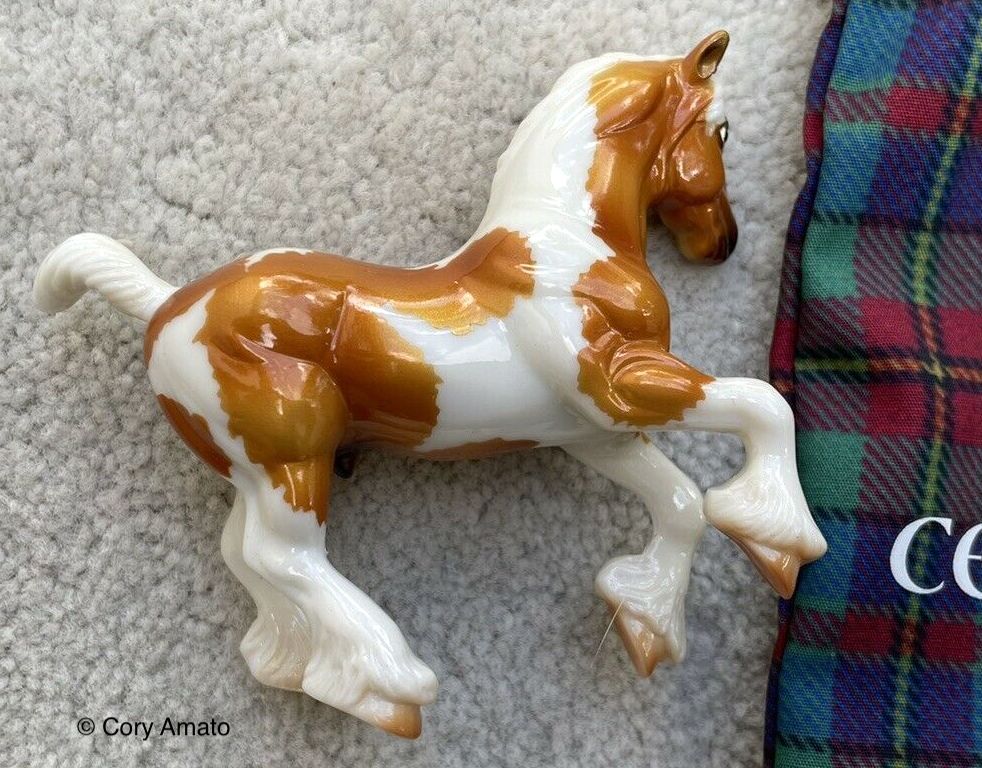 "Orkney is an archipelago of the northern coast of Scotland and contains about 70 islands – 20 of which are inhabited. These islands have incredible history, the village of Skara Brae is Europe’s most well-preserved Neolithic settlement and is believed to have been inhabited from around 3100 BCE. By the Iron Age, these islands were home to a variety of Pictish tribes living comfortable agricultural lives until the arrival of Norse invaders in the 8th century. For this year’s Celtic Fling, our Orkney has been done in an eye catching golden palomino tobiano pinto with high gloss finish. Done on the Stablemates Clydesdale (mold #5604) sculpted by Kathleen Moody." www.breyerhorses.com.