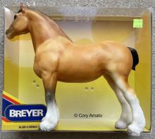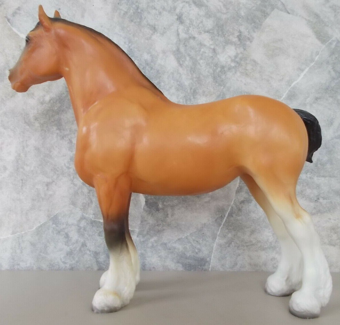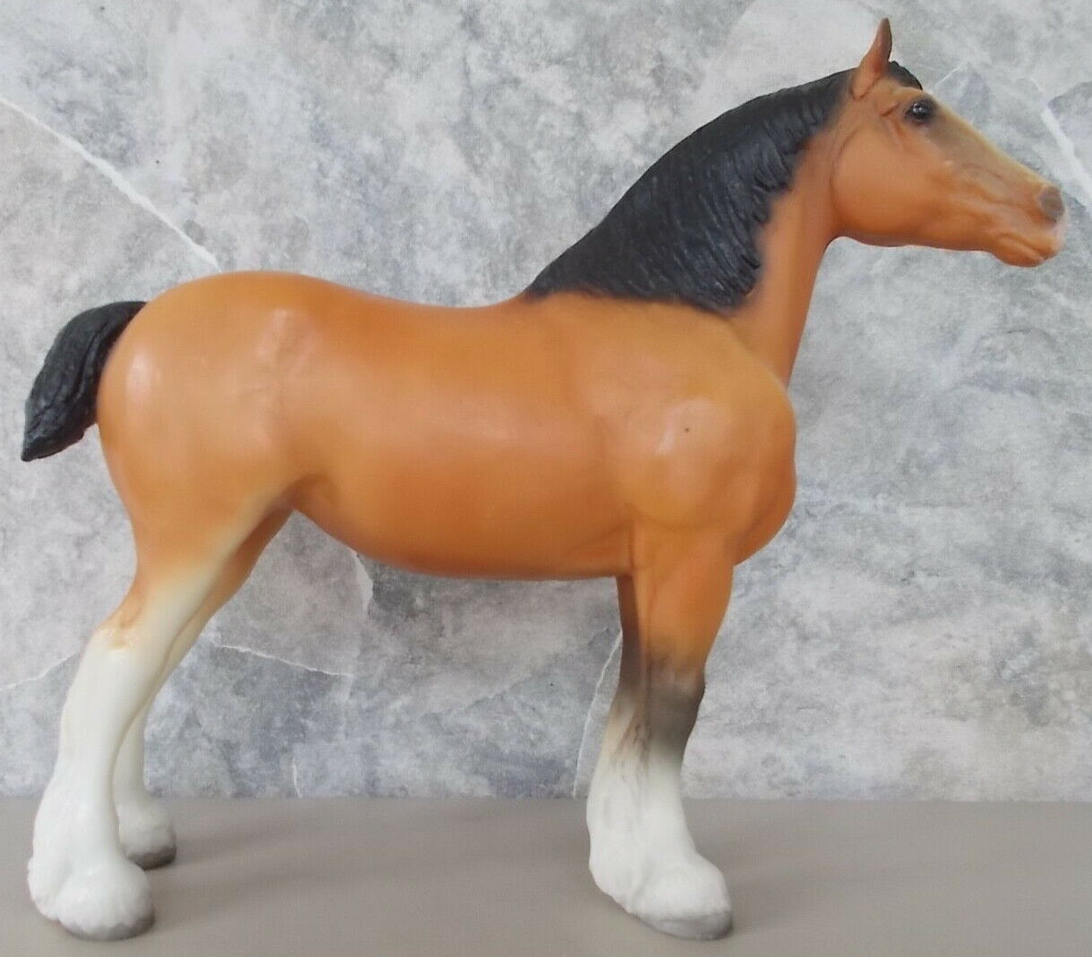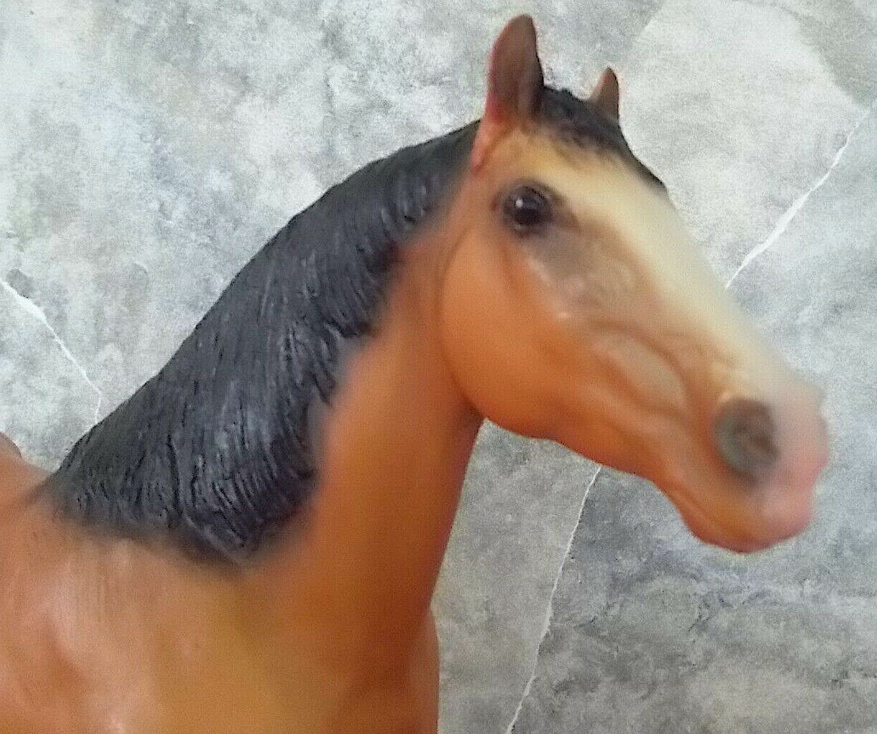 Golden bay or buckskin color with black mane and tail, bald face and 4 socks with grey hooves.